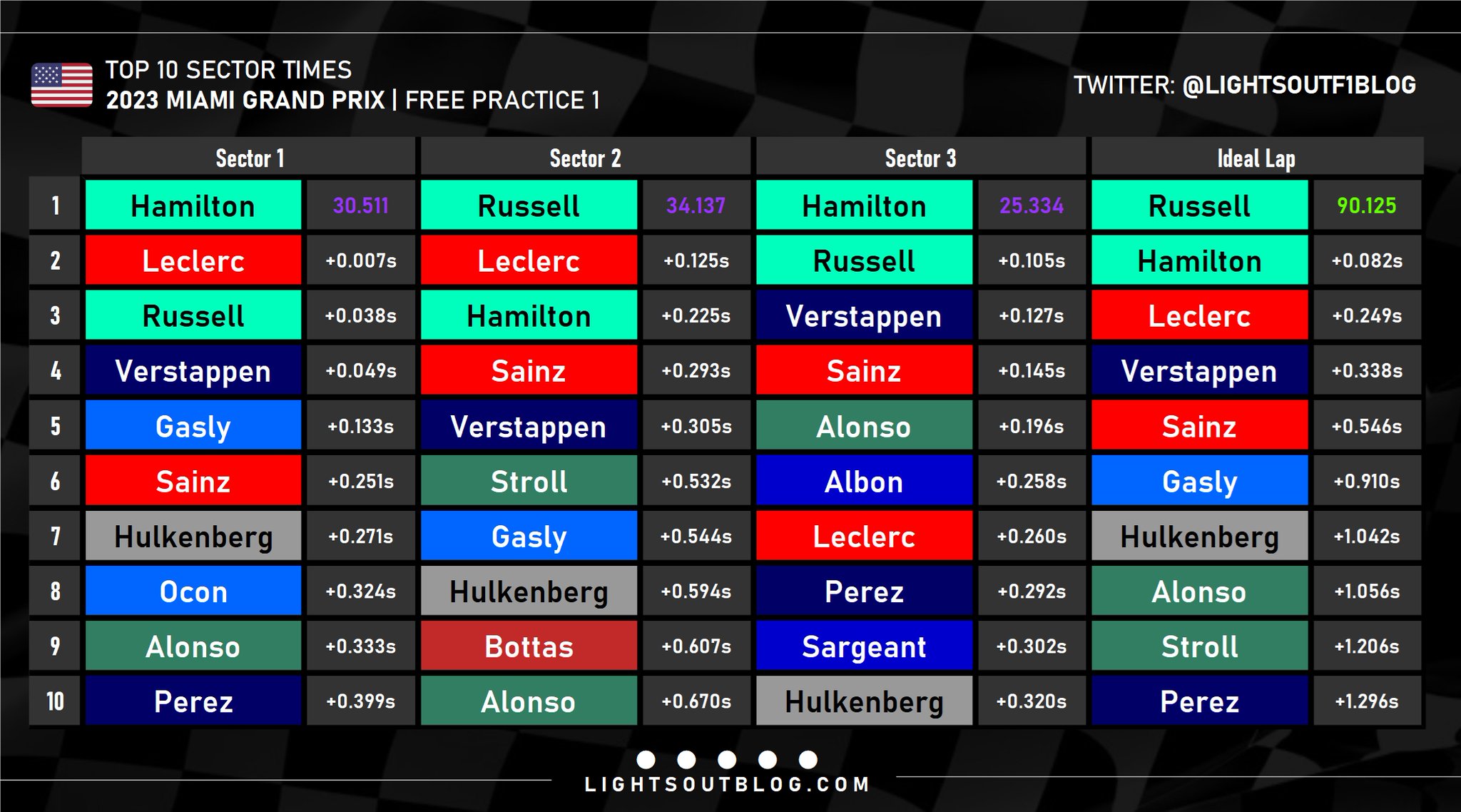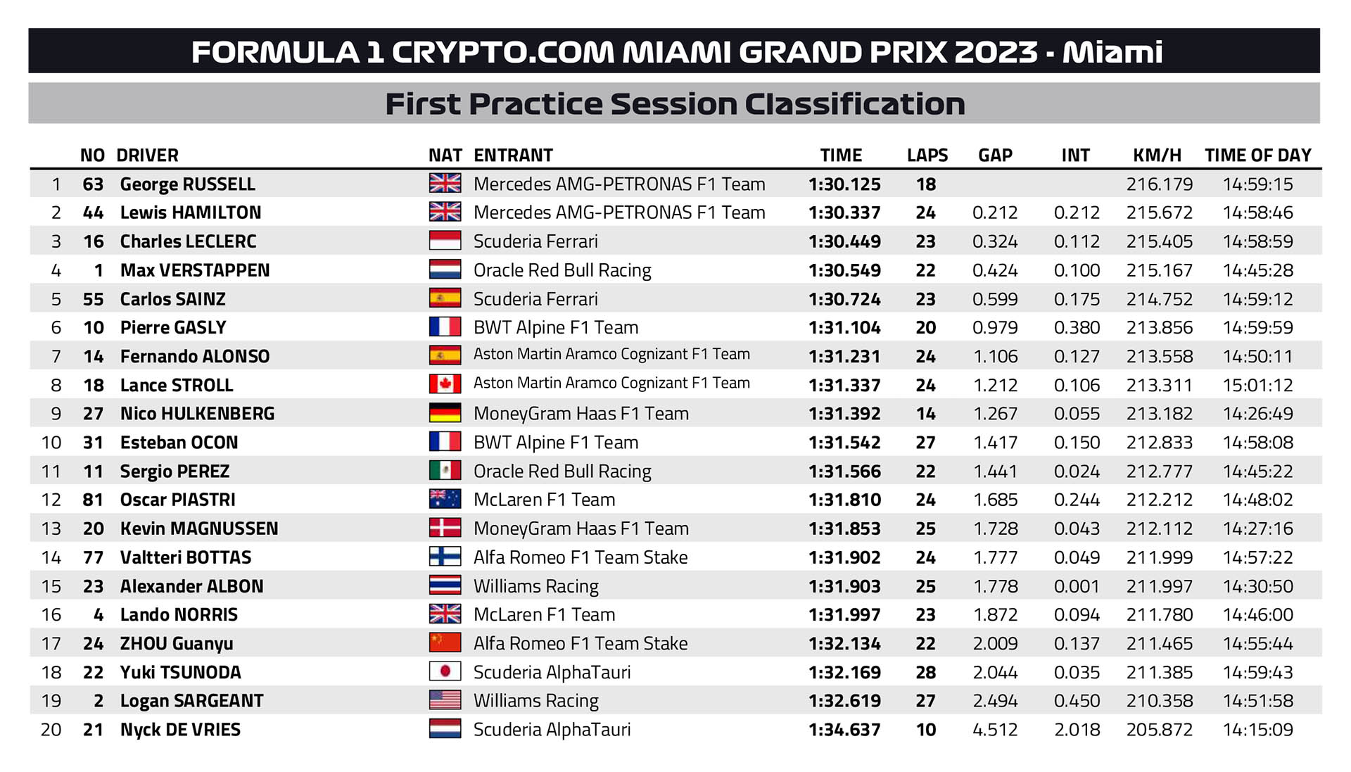 O Lewis Hamilton συμπλήρωσε το «1-2» της Mercedes, 2 δέκατα του δλ. πίσω από τον team-mate του. Η γερμανική ομάδα πιστεύει ότι επειδή η πίστα του Μαϊάμι ενεργοποιεί περισσότερο τα εμπρός ελαστικά, θα είναι σε καλύτερη φόρμα από ό,τι στο Μπακού. Στην 3η θέση βρέθηκε ο Charles Leclerc με τη Ferrari, ο οποίος είχε κάνει και αυτός ένα γρήγορο γύρο στα τελευταία λεπτά, αλλά με μεταχειρισμένο σετ ελαστικών. Ο Μονεγάσκος χρησιμοποιεί το δεύτερο φετινό του κιβώτιο (και ανέφερε στη δοκιμαστική εκκίνηση ότι είχε αργά ανεβάσματα σχέσεων), και δεύτερη MGU-K, αμφότερα χωρίς ποινή.