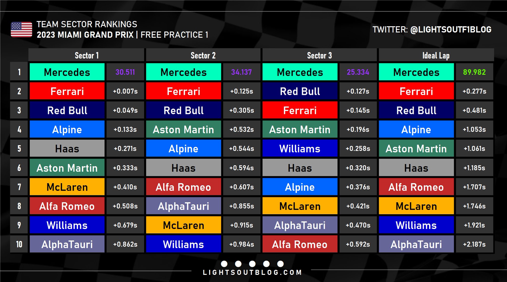 Την πρώτη δεκάδα συμπλήρωσε ο Esteban Ocon με τη δεύτερη Alpine. O Γάλλος χρησιμοποιεί αυτό το Σαββατοκύριακο το δεύτερο φετινό κινητήρα εσωτερικής καύσης, turbo και ηλεκτροκινητήρες MGU-H και MGU-K, ενώ η McLaren έχει τοποθετήσει τη δεύτερη μπαταρία και μονάδα ηλεκτρονικών ελέγχου στο μονοθέσιο του Oscar Piastri, που κατετάγη 12ος.
