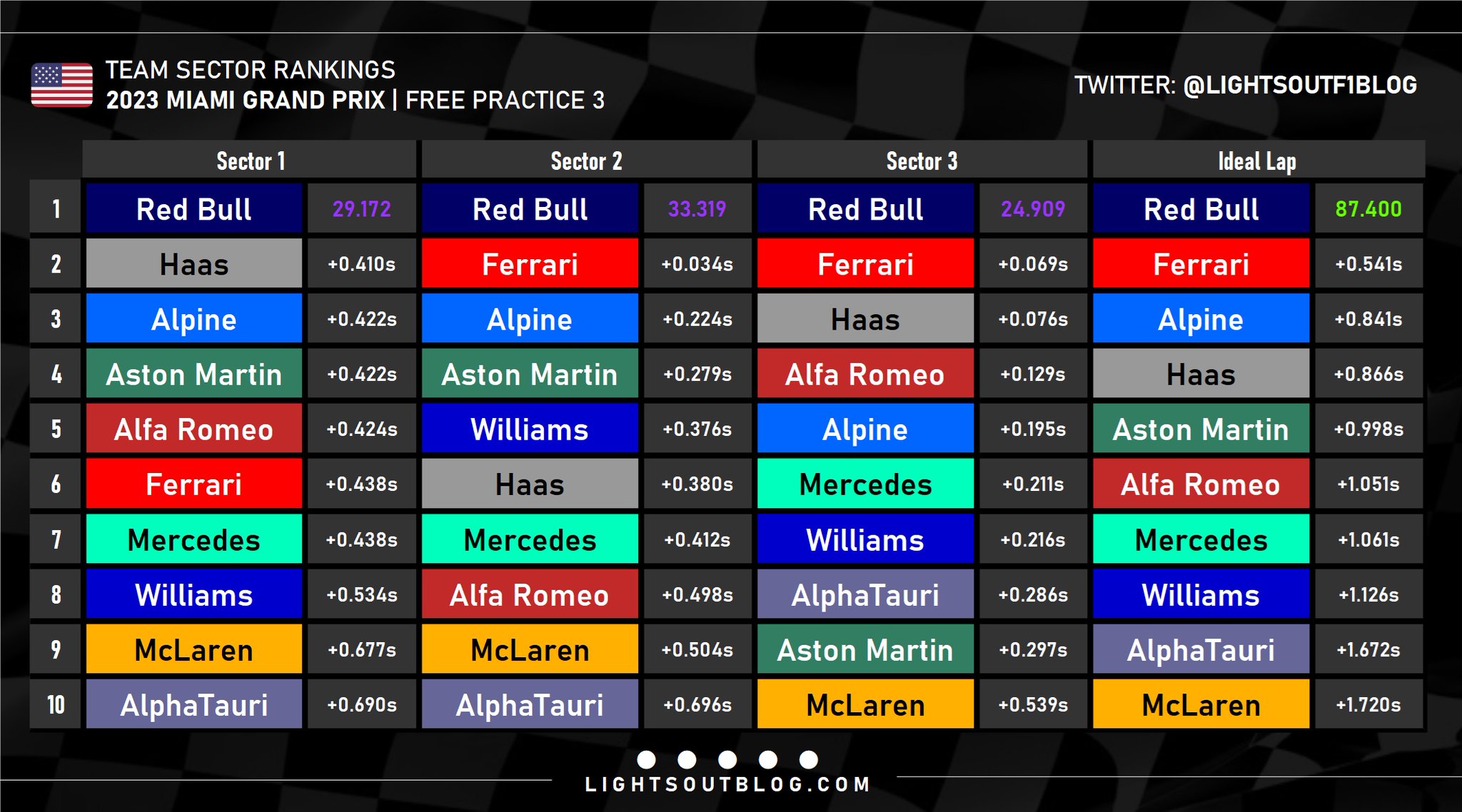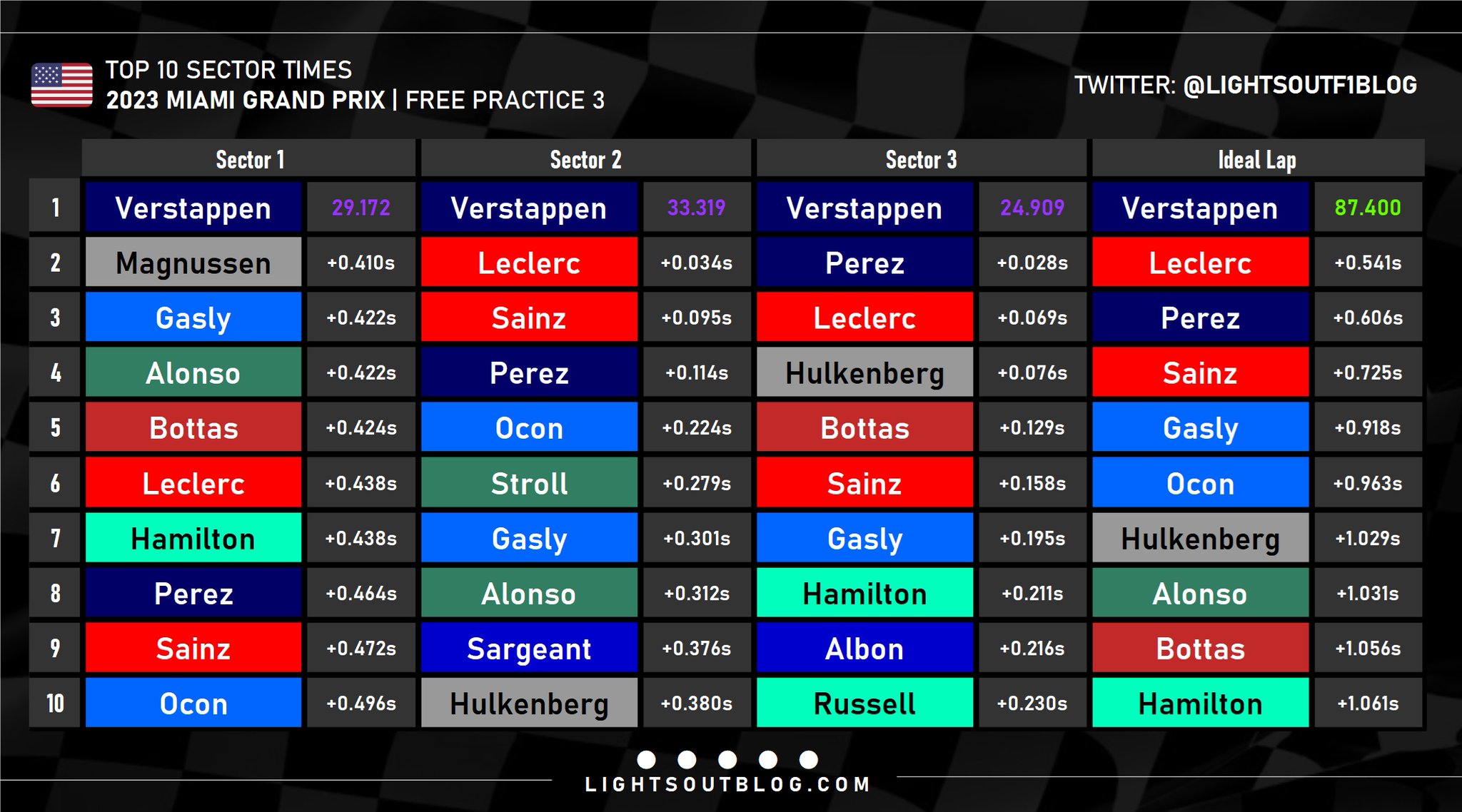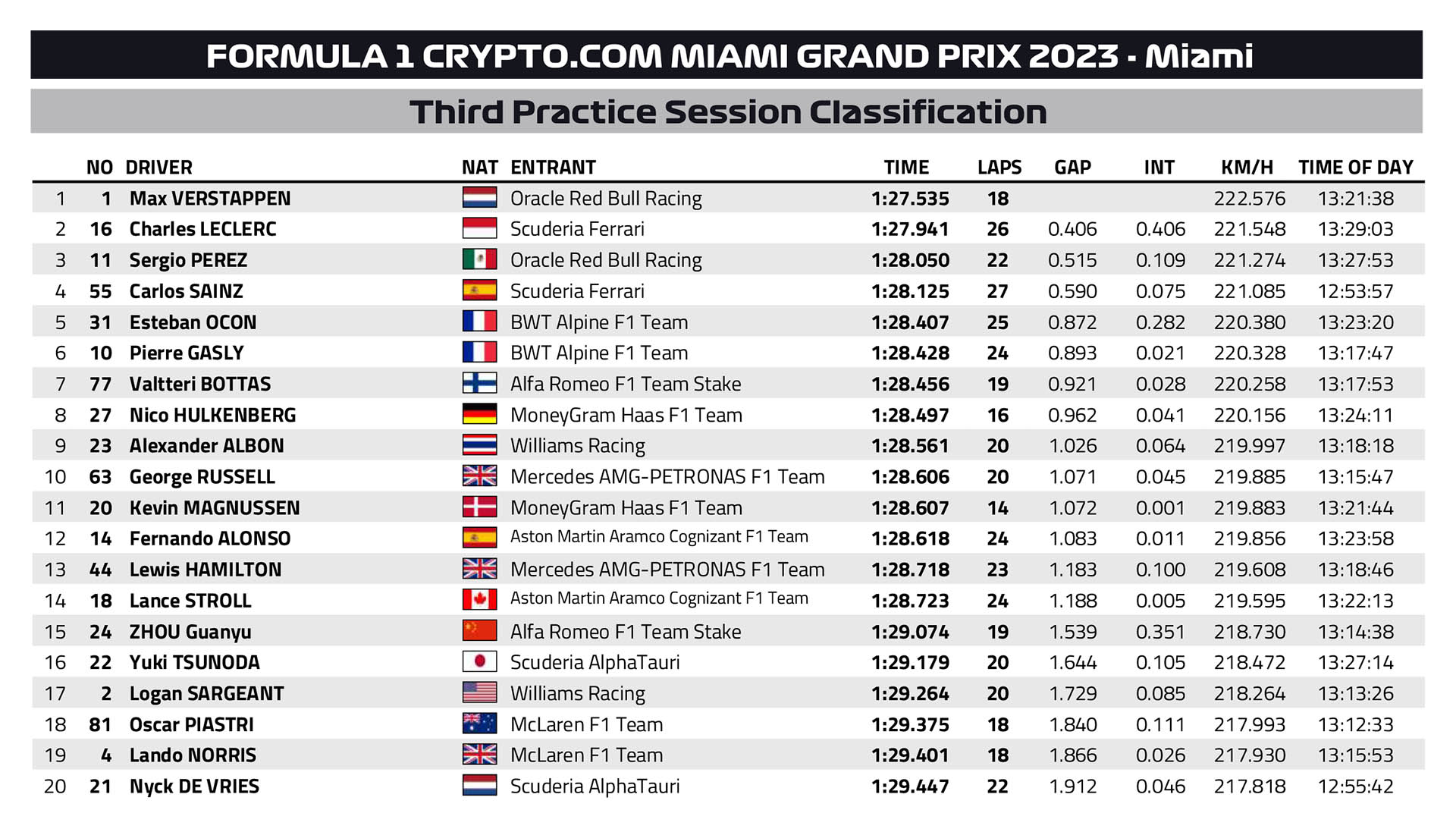 Όπως είχε κάνει και στο χθεσινό FP2, ο Max Verstappen κυριάρχησε και στην τελευταία περίοδο ελεύθερων δοκιμών του GP Μαϊάμι, όντας 4 δέκατα του δευτερολέπτου ταχύτερος από τον Charles Leclerc με τη Ferrari. H Red Bull τοποθέτησε το τρίτο φετινό κιβώτιο (από τα 4 που μπορούν να χρησιμοποιηθούν χωρίς ποινή κατά τη διάρκεια της σεζόν) στο μονοθέσιο του Verstappen. Παράλληλα, η Ferrari τοποθέτησε το δεύτερο φετινό κιβώτιο στο μονοθέσιο του Carlos Sainz.