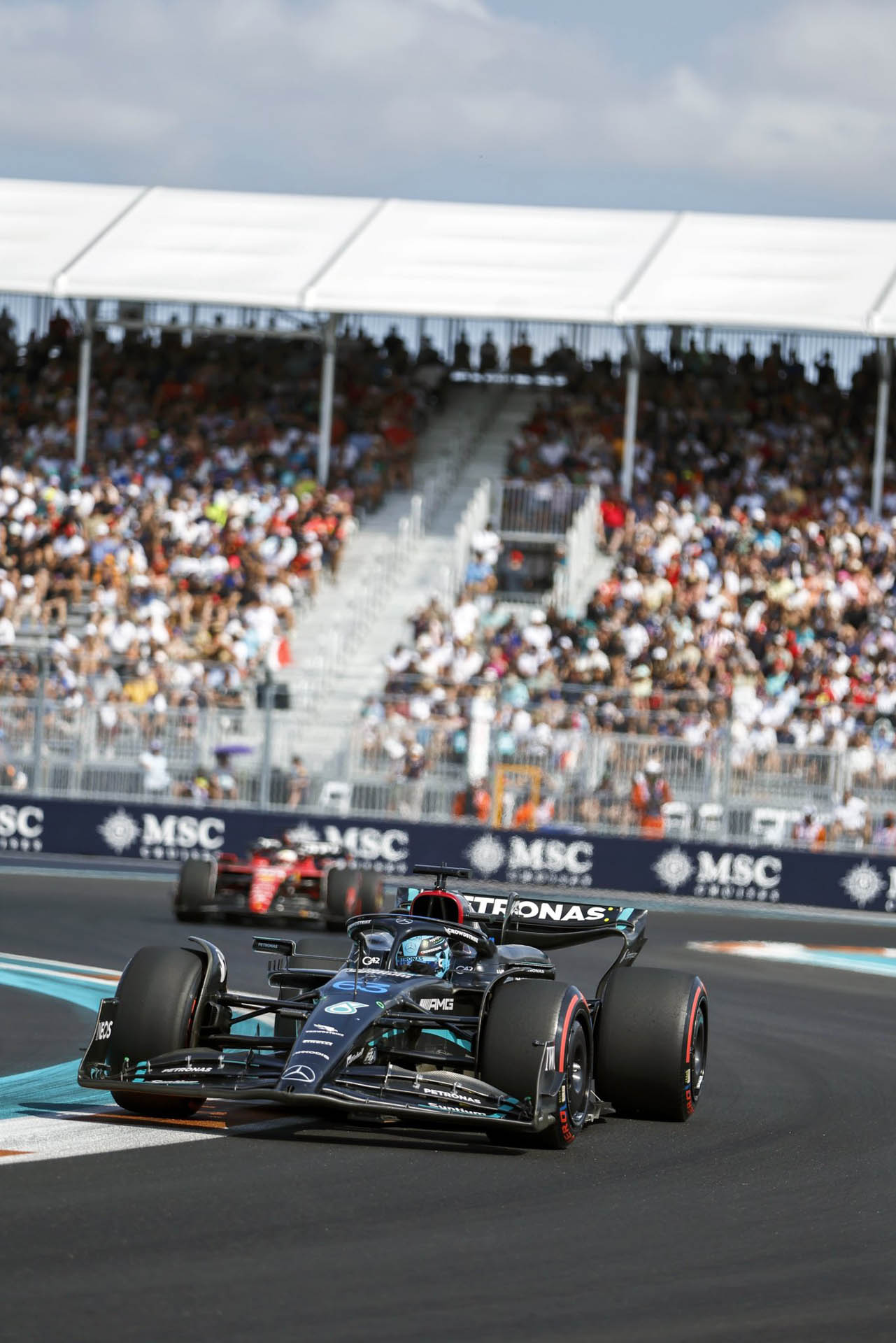 Παράλληλα, ο Russell πέρασε μπροστά από τους Tsunoda και Hulkenberg που δεν είχαν κάνει ακόμα pit stop, και βρέθηκε 2,5 δλ. πίσω από τον Hamilton, ο οποίος τον άφησε λίγο αργότερα να περάσει μπροστά σε ένα αργό κομμάτι της πίστας. O Perez φρόντιζε να σημειώνει παραπλήσιους χρόνους με τον Verstappen, ο οποίος πίεζε αρκετά, με τη διαφορά από τον team-mate του να είναι 15 δλ. και ένα pit stop να «κοστίζει» 20 δλ.