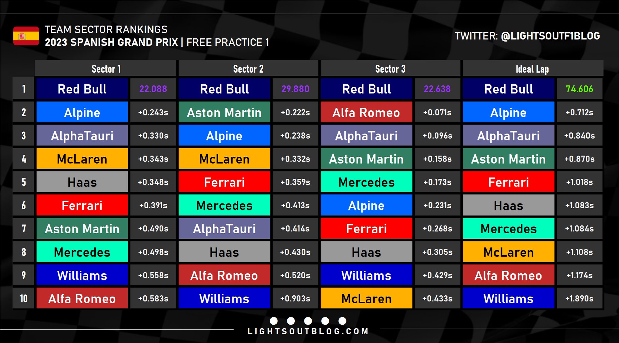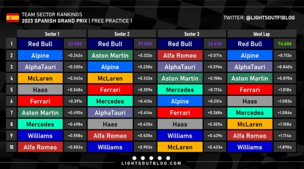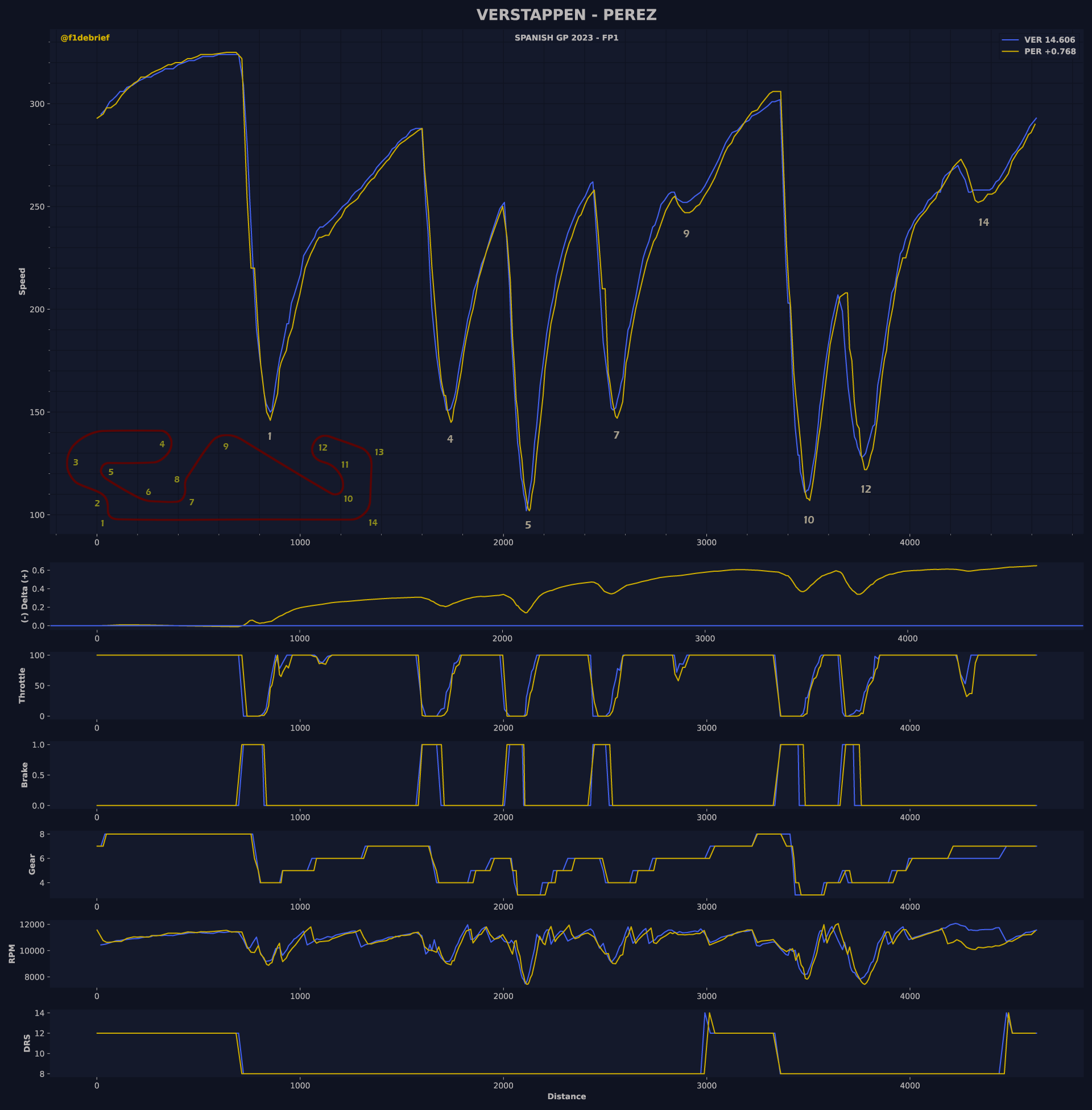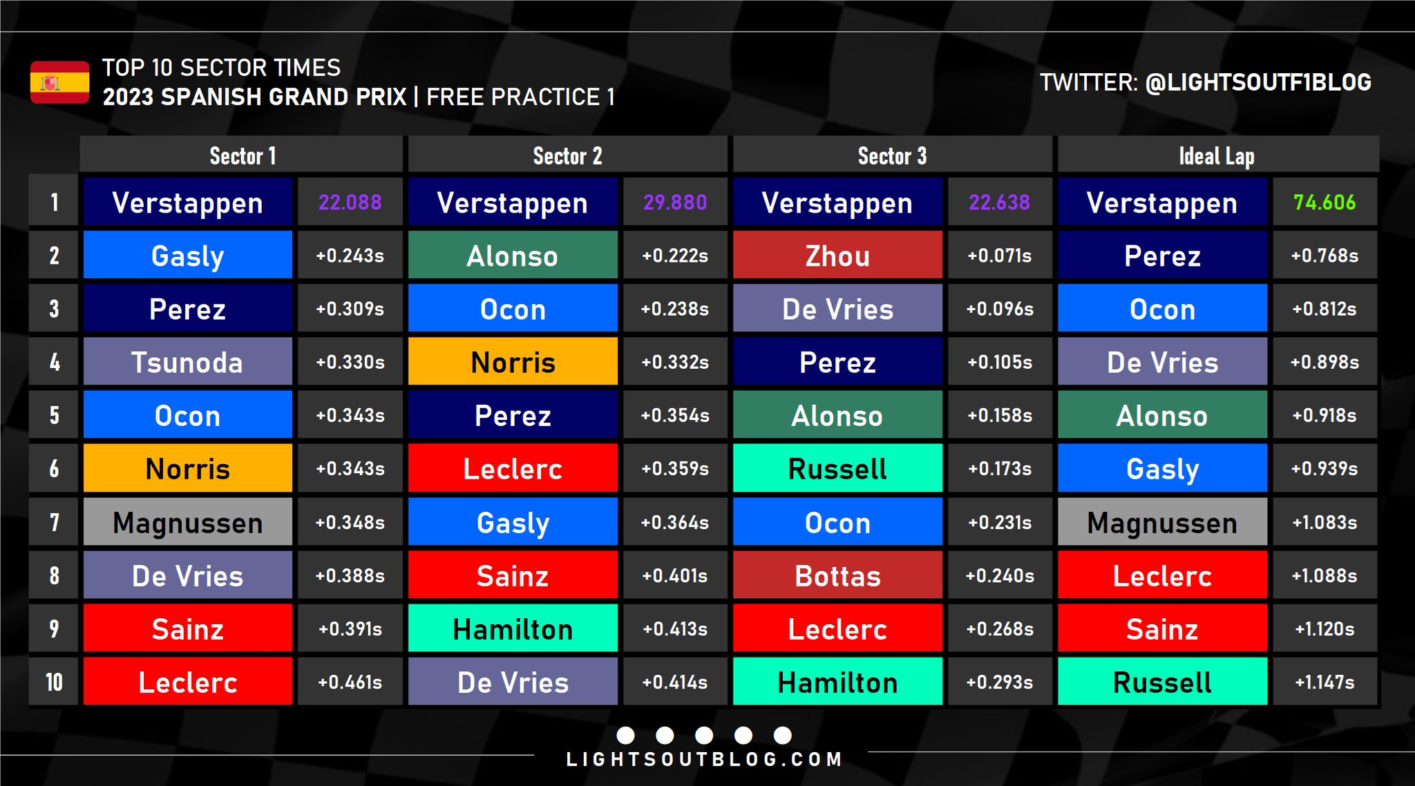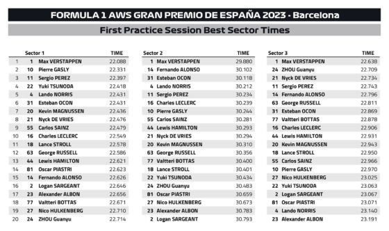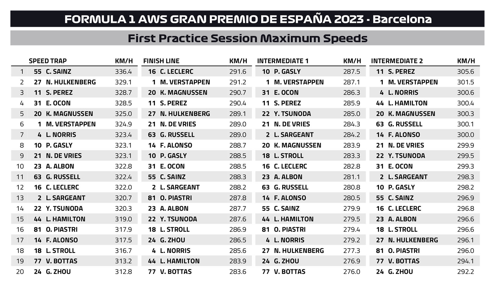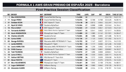 Ο Max Verstappen ήταν 768 χλστ. του δλ. ταχύτερος από τον team-mate του στη Red Bull, Sergio Perez στην πρώτη περίοδο ελεύθερων δοκιμών του GP Ισπανίας. O Ολλανδός ήταν ο μοναδικός οδηγός που κατέβηκε κάτω από το 1:15, σε μία πίστα που τονίζει τα προτερήματα της RB19, καθώς ευνοεί την καλή αεροδυναμική απόδοση (σχέση παραγόμενου αεροδυναμικού φορτίου και οπισθέλκουσας).