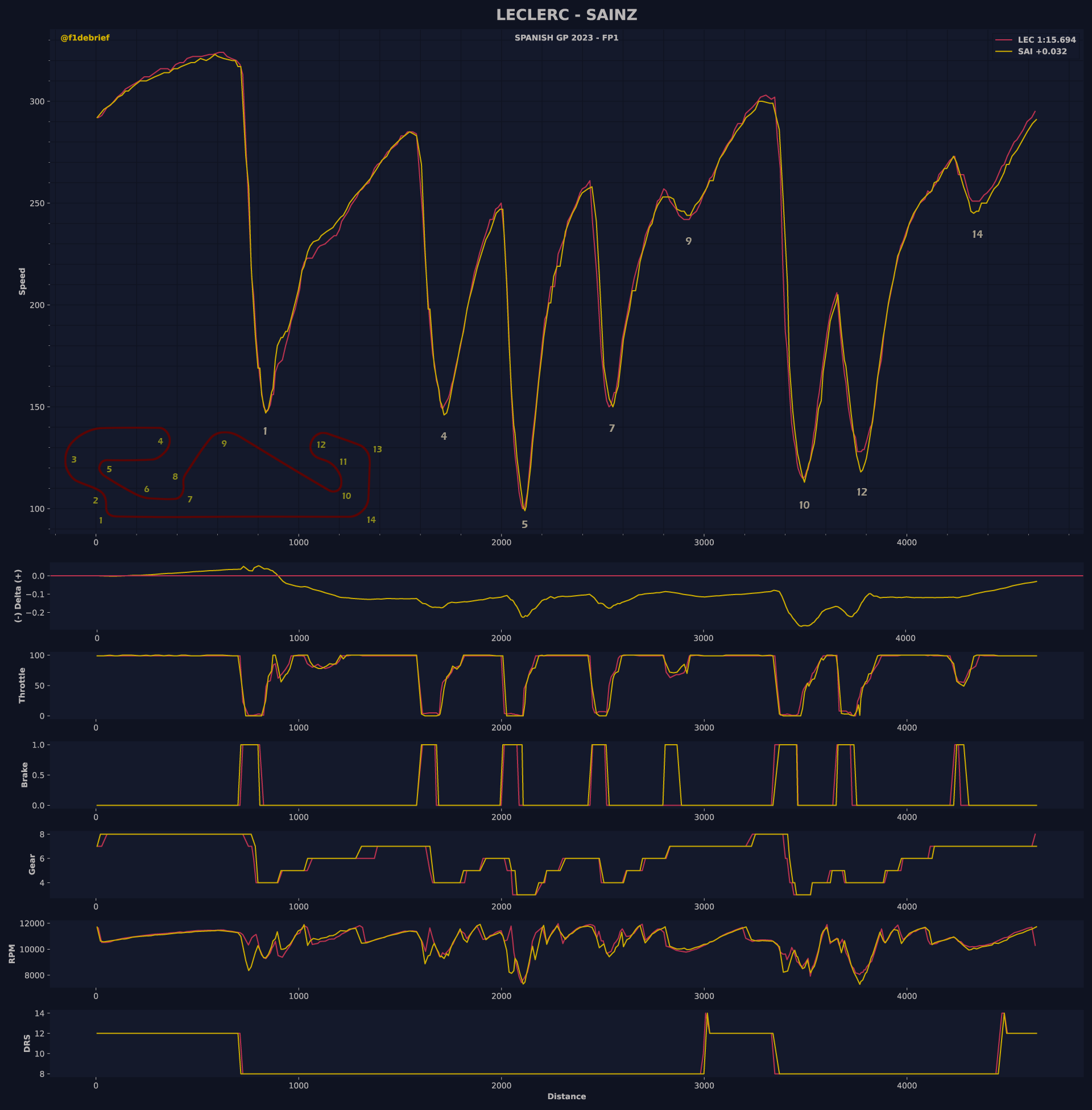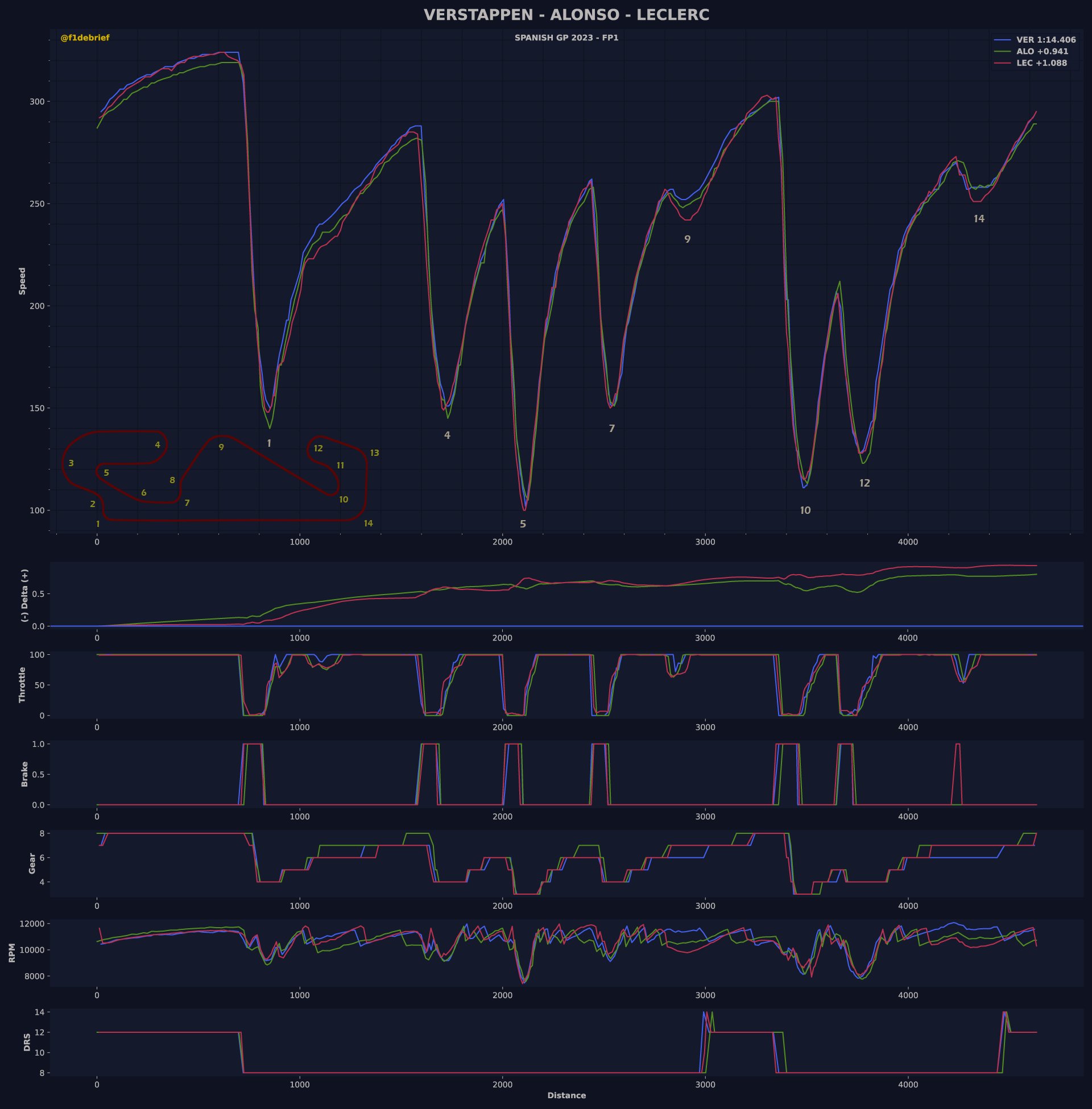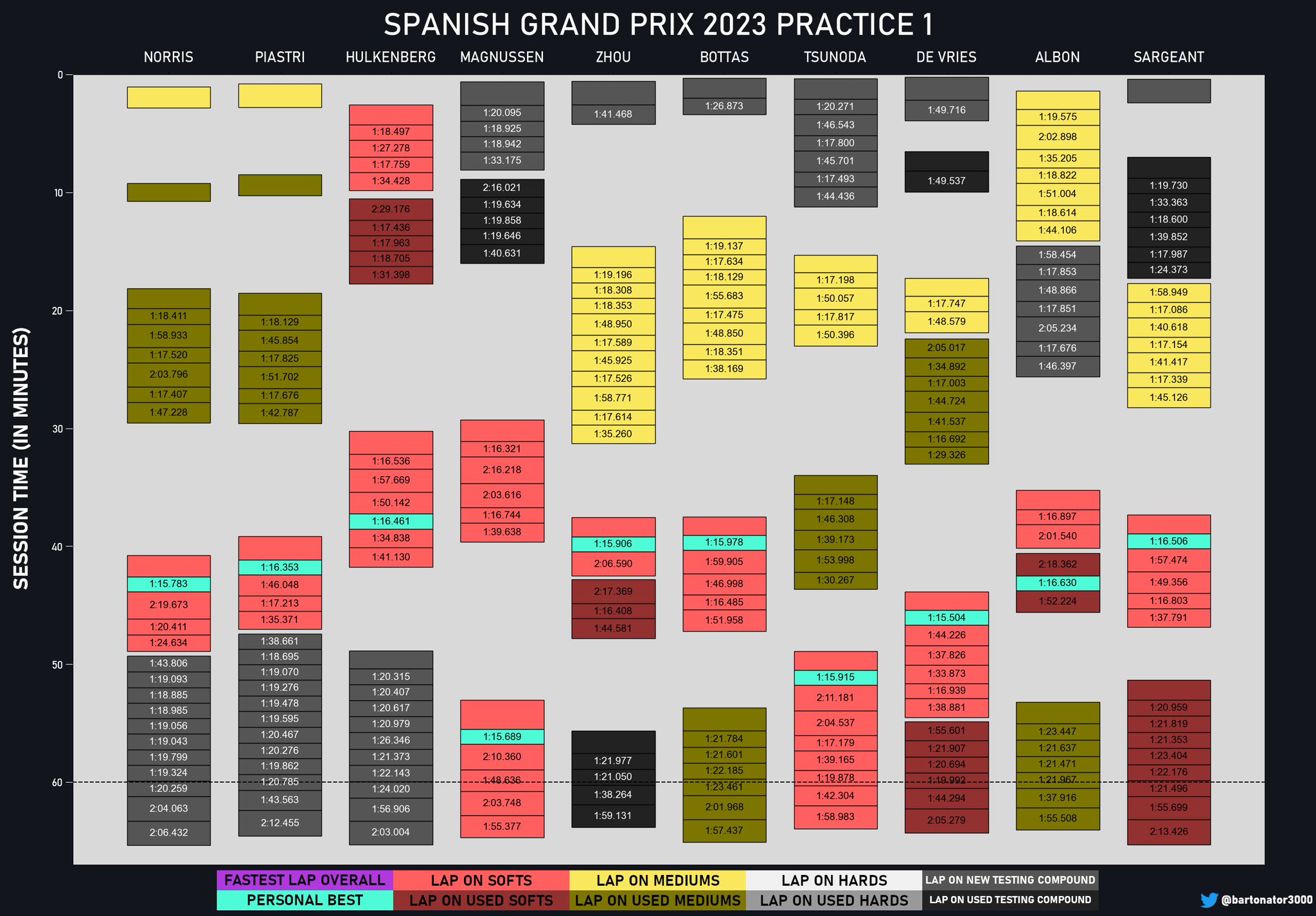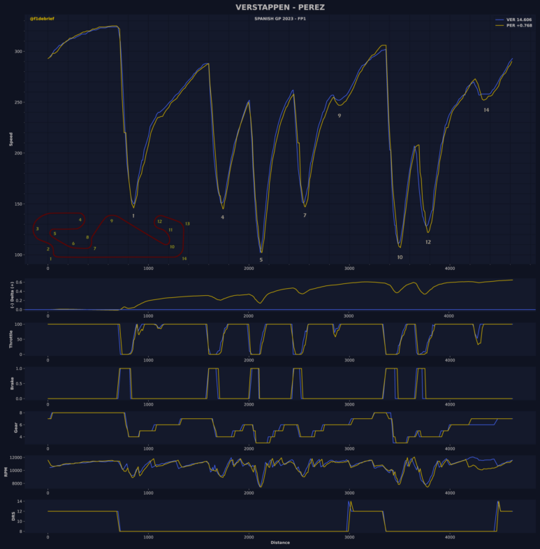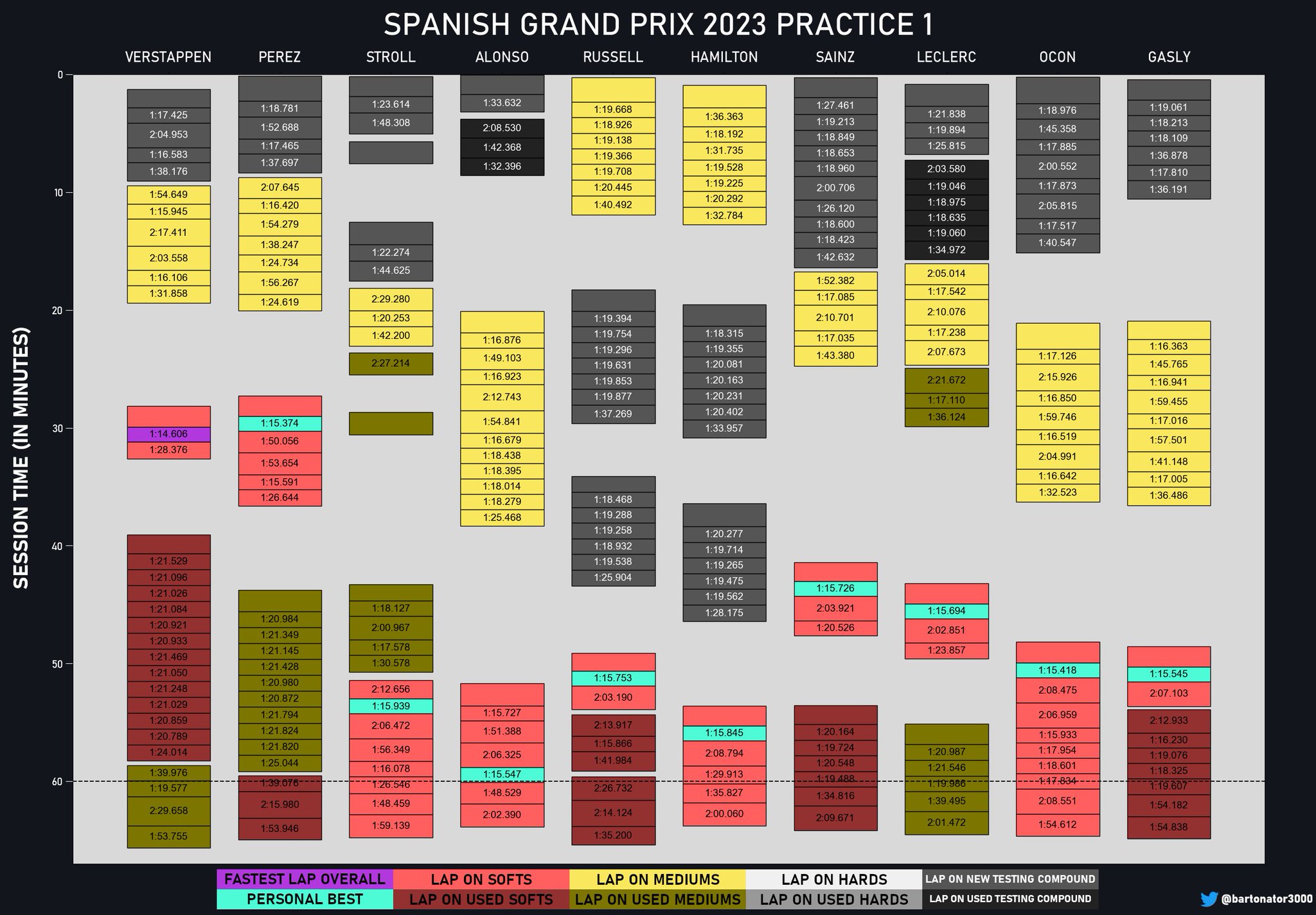 Ο Max Verstappen ήταν 768 χλστ. του δλ. ταχύτερος από τον team-mate του στη Red Bull, Sergio Perez στην πρώτη περίοδο ελεύθερων δοκιμών του GP Ισπανίας. O Ολλανδός ήταν ο μοναδικός οδηγός που κατέβηκε κάτω από το 1:15, σε μία πίστα που τονίζει τα προτερήματα της RB19, καθώς ευνοεί την καλή αεροδυναμική απόδοση (σχέση παραγόμενου αεροδυναμικού φορτίου και οπισθέλκουσας).
