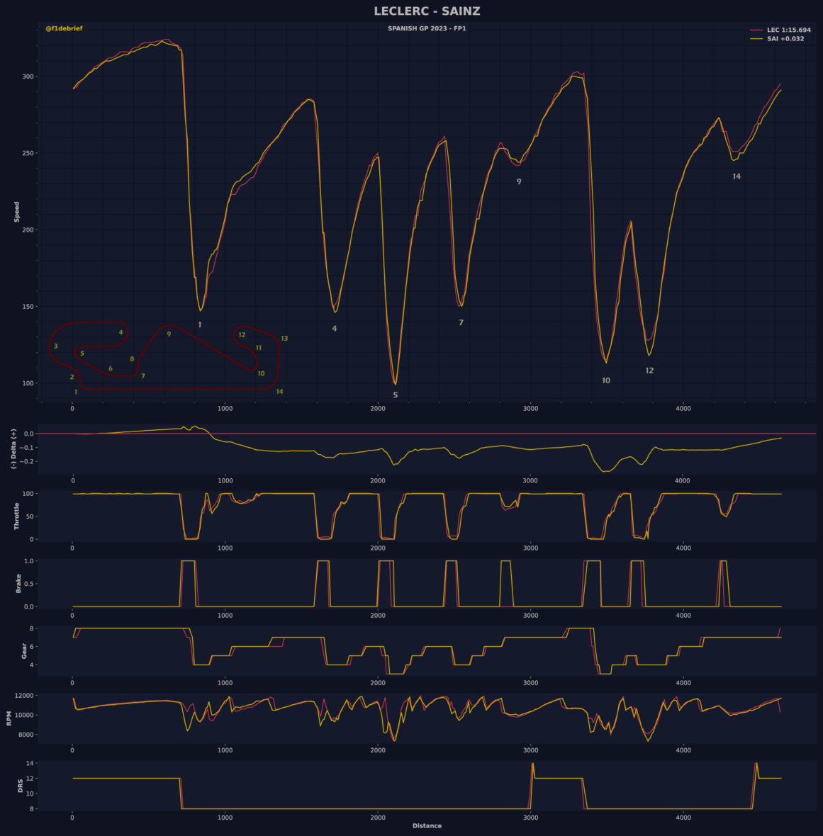 Στην 7η θέση βρέθηκε ο Kevin Magnussen με τη Haas, εμπρός από τους δύο οδηγούς της Ferrari. O Charles Leclerc ήταν ταχύτερος από τον Carlos Sainz, παρότι ο Μονεγάσκος χρησιμοποιούσε την παλιά έκδοση αμαξώματος της SF-23. Στο γρήγορο γύρο του με τη μαλακή γόμα, ο Sainz ανέφερε ότι είχε υπερστροφή και πάτησε στα χαλίκια της εξόδου της προτελευταίας στροφής (13), για να βρεθεί 1,12 δλ. πίσω από τον Verstappen.