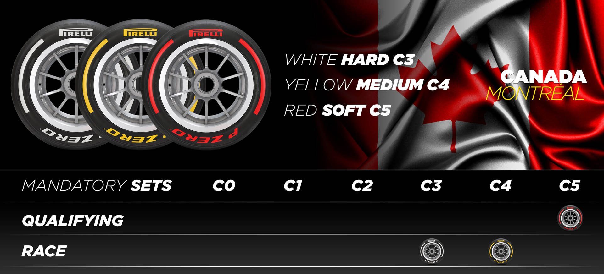 Οι επιλογές γόμας ελαστικών της Pirelli για τα τρία επόμενα Grand Prix του φετινού Πρωταθλήματος της Formula 1 παραμένουν απαράλλακτες από περύσι. Στην πίστα Gilles Villeneuve, στο Μόντρεαλ του Καναδά (16-18 Ιουνίου), θα χρησιμοποιηθούν οι πιο μαλακές γόμες ελαστικών (C3, C4 και C5). Παρά τις πυρκαγιές που επικρατούν στη χώρα (και στην πολιτεία του Quebec), η F1 είναι αισιόδοξη ότι το Grand Prix δεν κινδυνεύει.