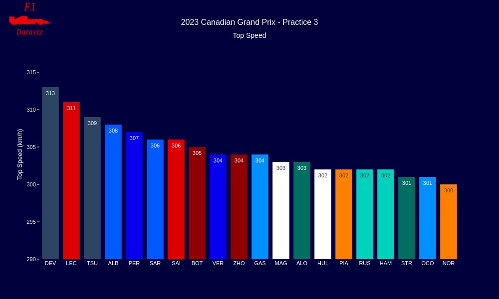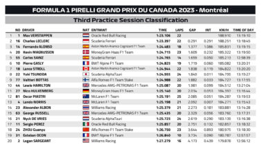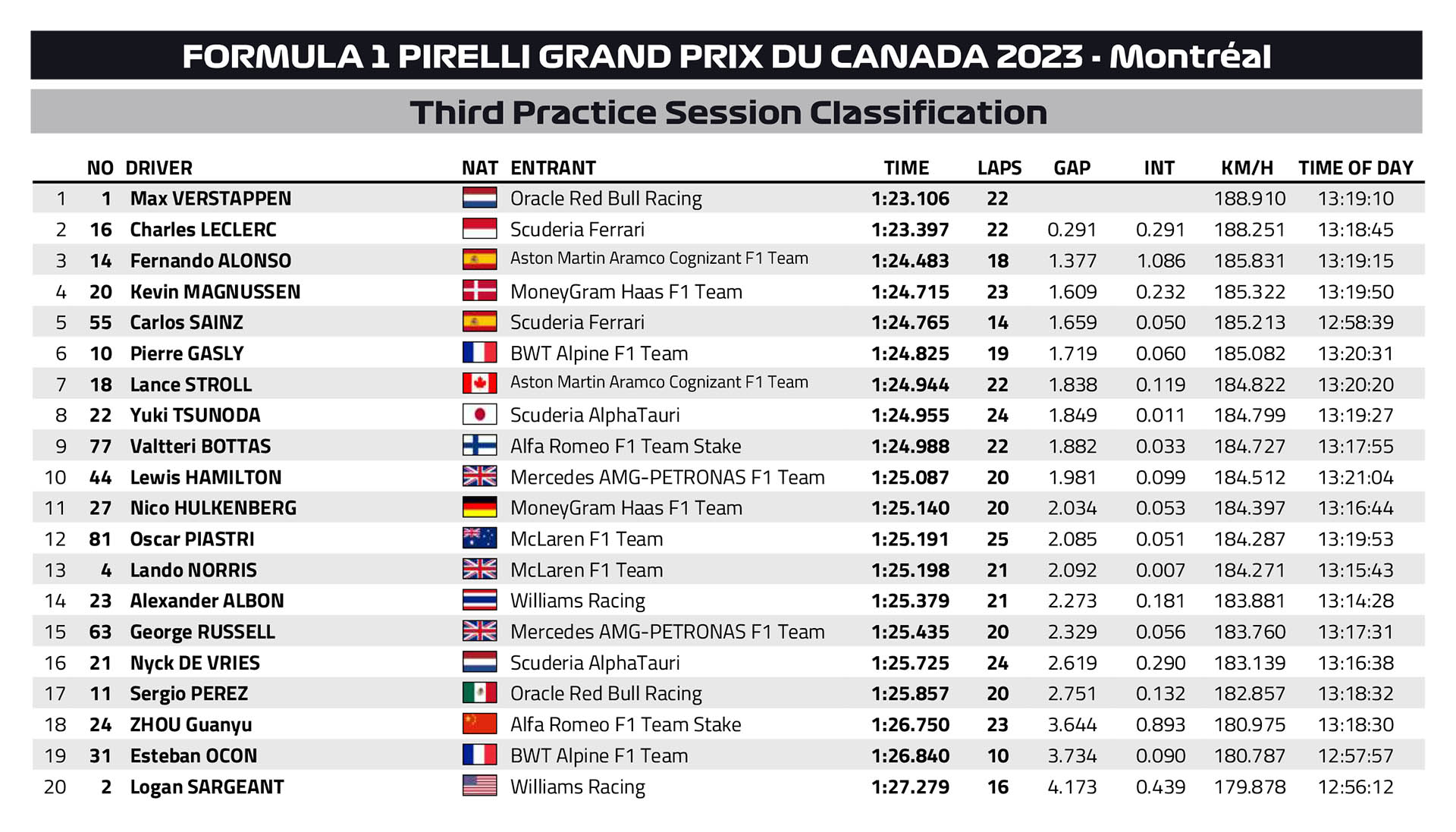 Στην 3η θέση -αλλά 1,377 δλ. μακριά από την κορυφή- βρέθηκε ο Fernando Alonso με την αναβαθμισμένη Aston Martin, εμπρός από τον Kevin Magnussen, που επέδειξε τις δυνατότητες της Haas να φέρνει τα ενδιάμεσα ελαστικά στις ιδανικές θερμοκρασίες, όπως είχε κάνει και πέρυσι στην πίστα του Μόντρεαλ, που οι κατατακτήριες δοκιμές είχαν διεξαχθεί σε βρεγμένη πίστα, όπως θα γίνει και φέτος. Ο Sainz κατετάγη 5ος, εμπρός από τον Pierre Gasly.
