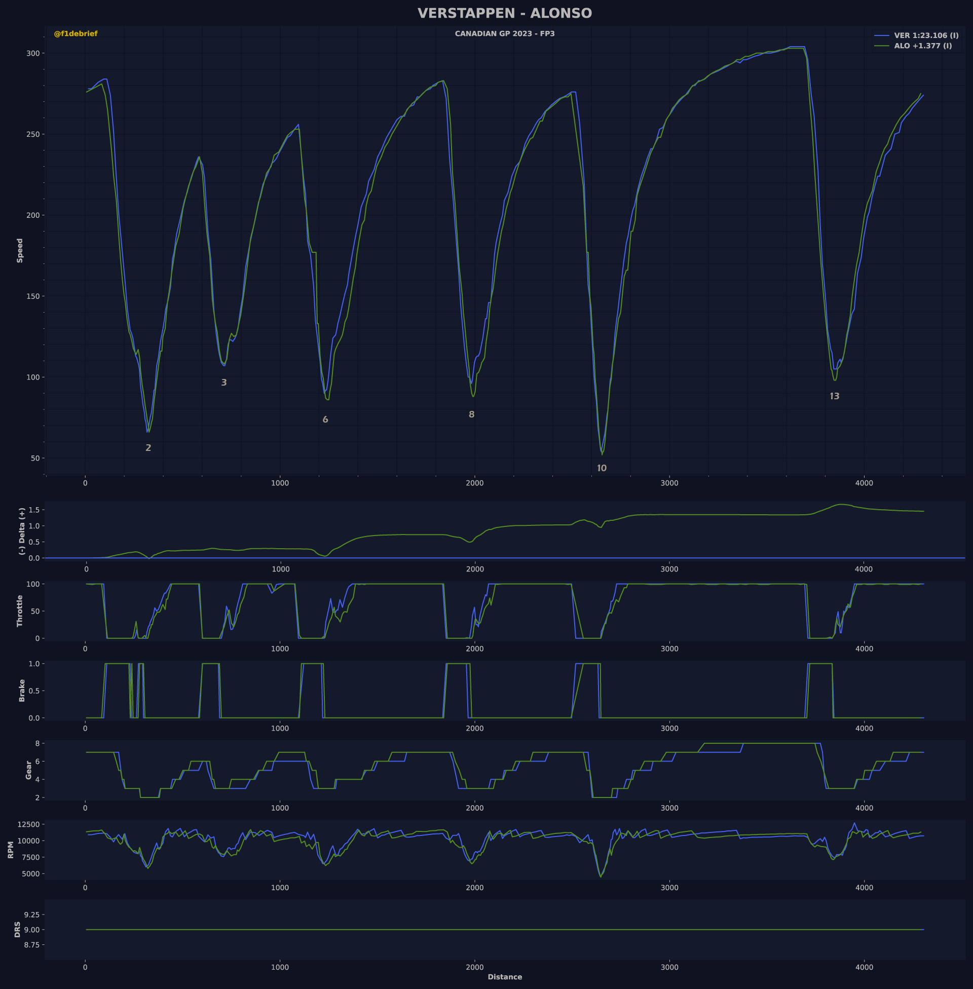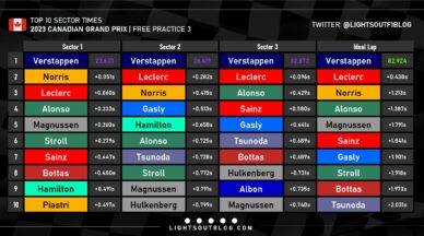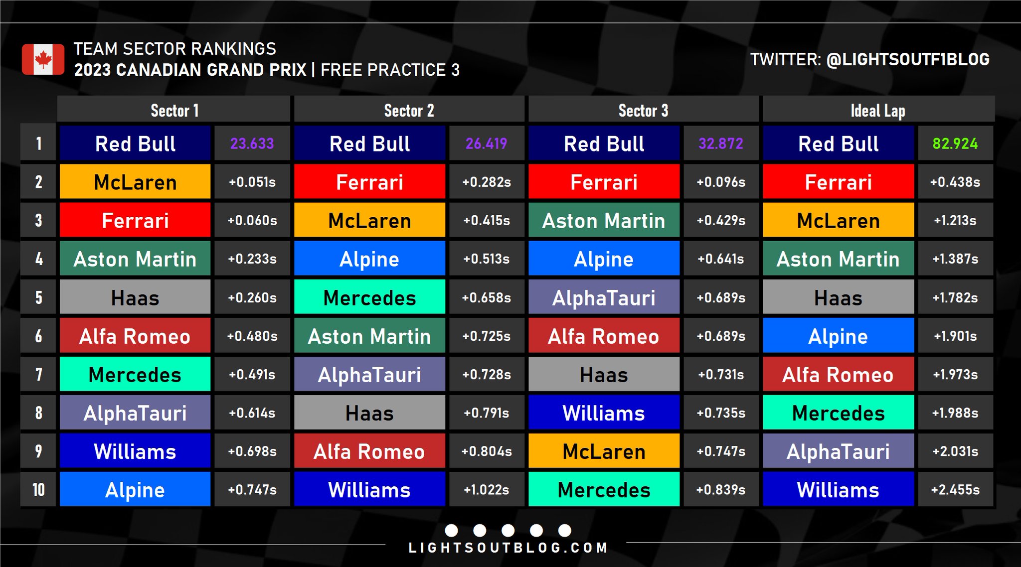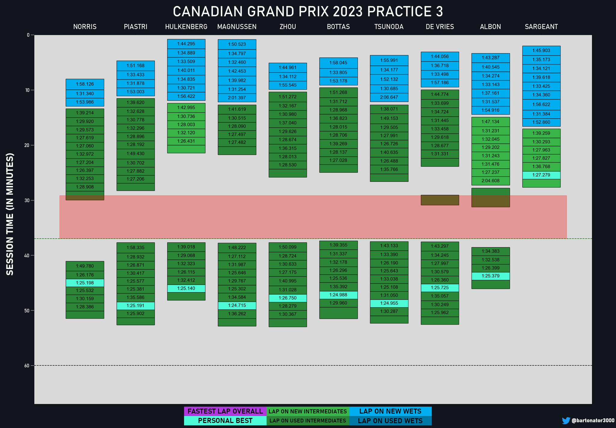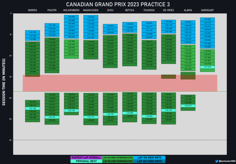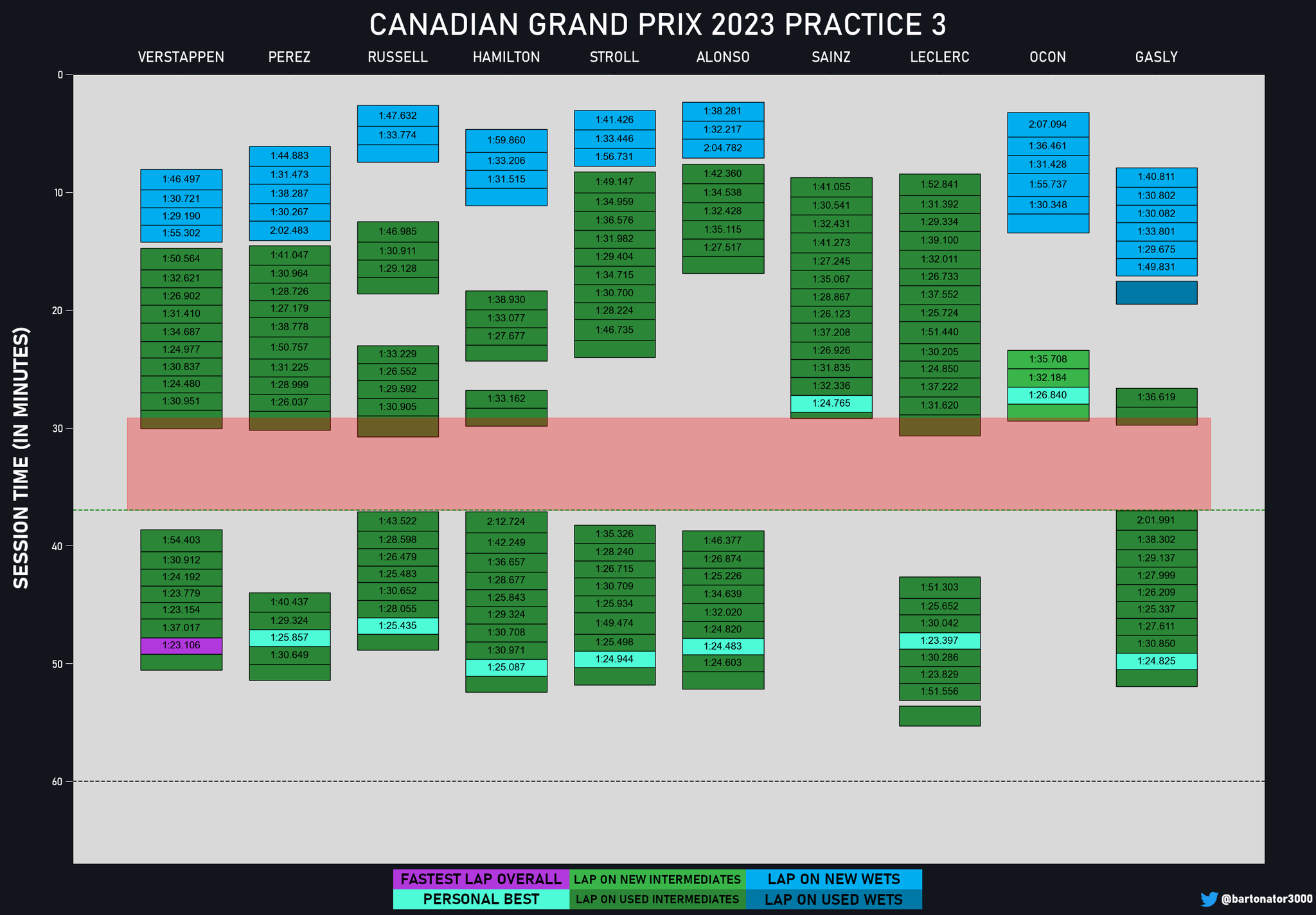 H τελευταία περίοδος ελεύθερων δοκιμών του GP Καναδά ξεκίνησε με τόσο βρεγμένη πίστα που όλοι οι οδηγοί βγήκαν από τα pits με ελαστικά βροχής, τα οποία δεν προθερμαίνονται σε ηλεκτρικές κουβέρτες πλέον. Ωστόσο, λίγο πριν από τη συμπλήρωση του πρώτου 10λεπτου, οι Aston Martin εισήλθαν στα pits για ενδιάμεσα ελαστικά.