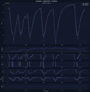 Πίσω από τον Alonso είχε βρεθεί ο Lewis Hamilton με τη Mercedes, όντας περίπου 3 δέκατα του δλ. ταχύτερος από τον team-mate του, George Russell, παρότι η W14 είχε δυσκολίες να αναπτύξει τις ιδανικές θερμοκρασίες λειτουργίας στα εμπρός ελαστικά τους. Ο Esteban Ocon θα βρεθεί στην 6η θέση εκκίνησης αύριο με την Alpine, εμπρός από τον Lando Norris με τη McLaren. H βρετανική ομάδα είδε και τα δύο μονοθέσιά της στην πρώτη δεκάδα, αλλά το ατύχημα του Piastri δεν ήταν ιδανικό.