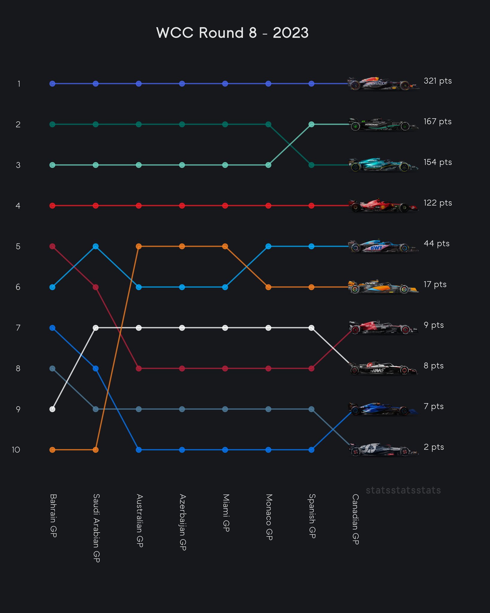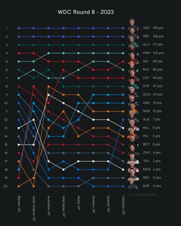 O Lewis Hamilton βρίσκεται στην 4η θέση, 15 βαθμούς πίσω από τον Alonso, ενώ ο Carlos Sainz κατάφερε να περάσει μπροστά από τον George Russell, στην 5η θέση, δεδομένης της εγκατάλειψης του 25χρονου Βρετανού οδηγού της Mercedes στον Καναδά.