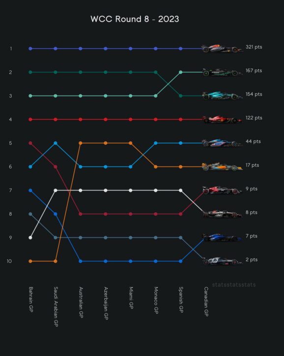 Στη κατάταξη των κατασκευαστών, η Red Bull έχει δημιουργήσει διαφορά ασφαλείας έχοντας φτάσει τους 321 βαθμούς, σχεδόν τους διπλάσιους από τη δεύτερη, Mercedes, η οποία συνεχίζει να προηγείται της Aston Martin με μικρή διαφορά 13 βαθμών.