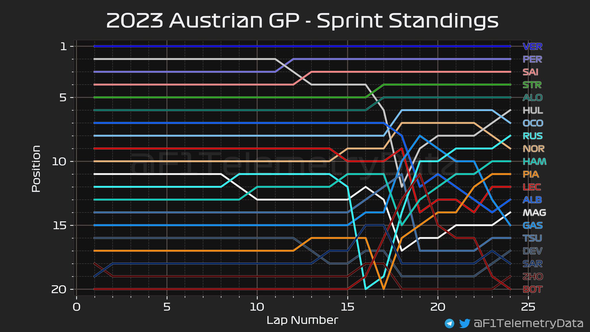 Στο τέλος του 15ου γύρου, ο Leclerc άνοιξε υπερβολικά τη γραμμή του στην έξοδο της τελευταίας στροφής, γεγονός που επέτρεψε στον Norris να τον περάσει για την 9η θέση. Παράλληλα, ο Russell εισήλθε στα pits για σλικ μαλακά ελαστικά. Η διεύθυνση αγώνα επέτρεψε τη χρήση DRS στο 17ο γύρο, γεγονός που επέτρεψε στους Stroll να περάσει τον Hulkenberg για την 5η θέση.