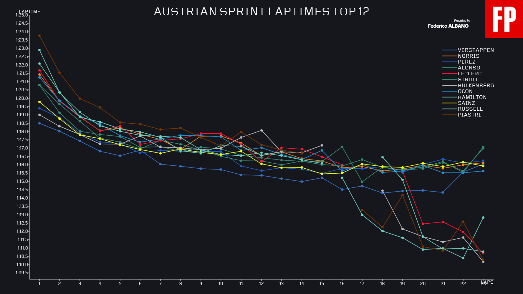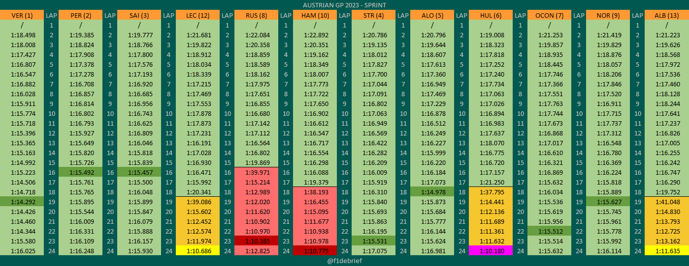 Ο Russell ήταν ο πρώτος εκ των οδηγών που έκαναν τη μετάβαση στα σλικ ελαστικά και ήταν μία επιτυχημένη κίνηση, καθώς τον έφερε στη βαθμολογούμενη οκτάδα. Ο Lando Norris είχε ένα απογοητευτικό σπριντ έχοντας χάσει θέσεις χωρίς να φταίει, καθώς ενεργοποιήθηκε το σύστημα anti-stall της McLaren στην 3η στροφή του 1ου γύρου και έχασε τον τελικό βαθμό από τον Russell στις τελευταίες στροφές. Ο Lewis Hamilton συμπλήρωσε την πρώτη δεκάδα, ενώ ο Charles Leclerc έπεσε στη 12η θέση με τη μέση γόμα στο τέλος, έχοντας δώσει πολλές μάχες καθ’ όλη τη διάρκεια του σπριντ.