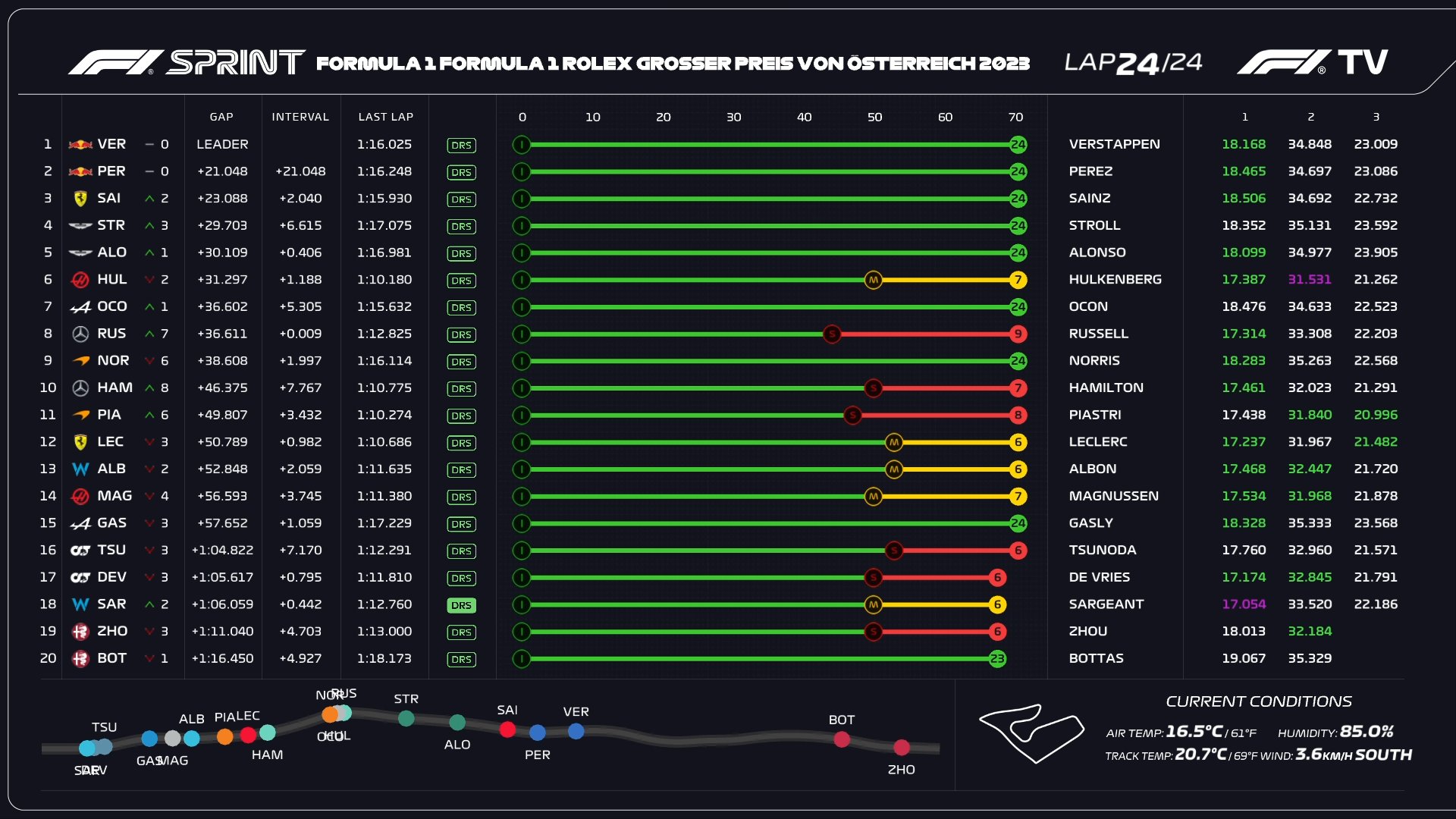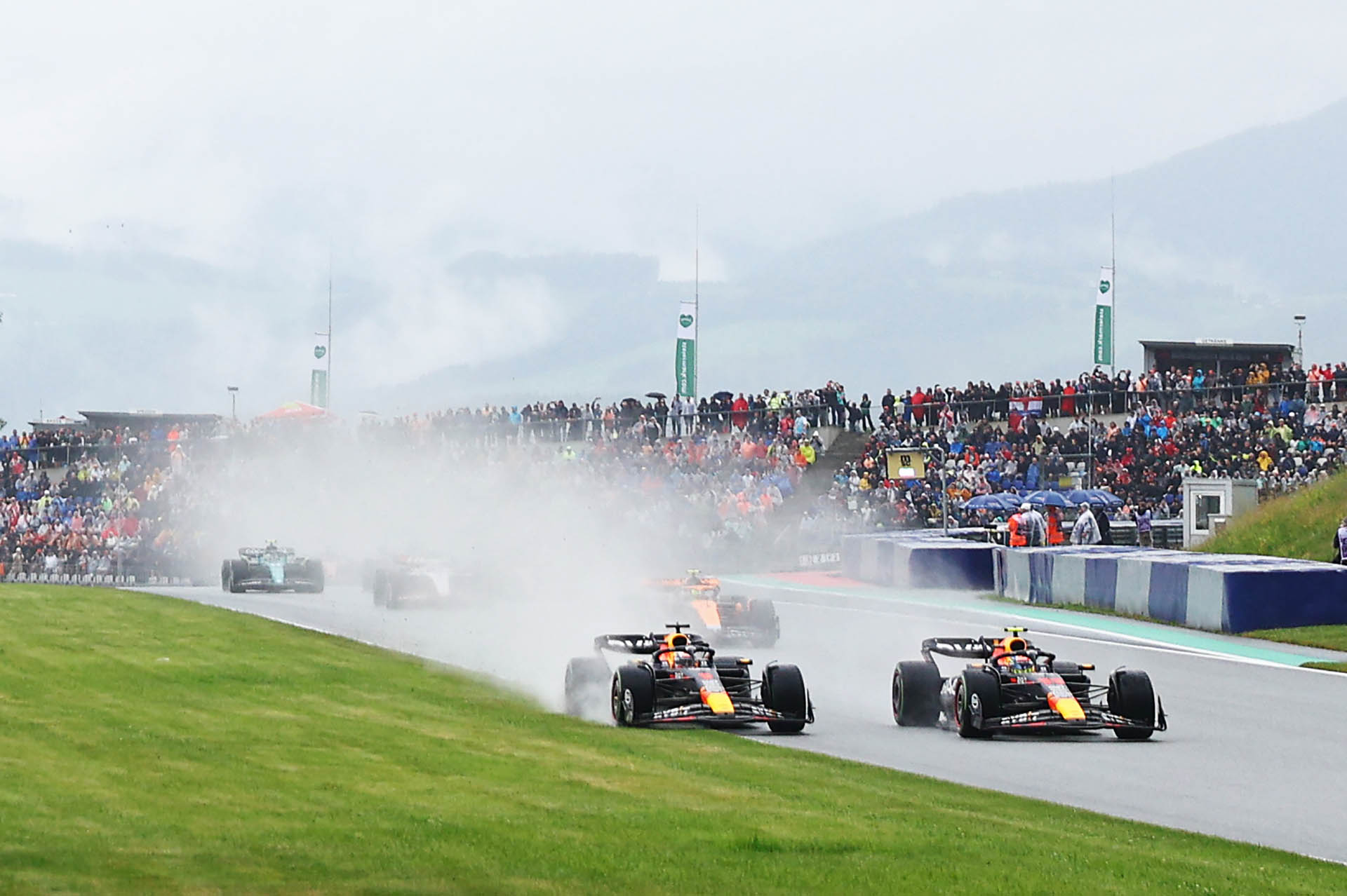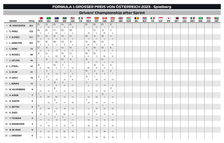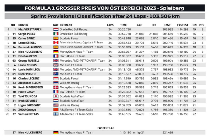 Ο Max Verstappen ήταν ο απόλυτος κυρίαρχος ενός συναρπαστικού σπριντ στο Red Bull Ring, το οποίο ξεκίνησε σε βρεγμένη πίστα η οποία στέγνωσε στους τελευταίους γύρους. Ο Verstappen, έπειτα από μία κακή εκκίνηση, έδωσε σκληρή μάχη με τον Sergio Perez στον πρώτο γύρο, με αρκετά ριψοκίνδυνες κινήσεις στις πρώτες στροφές. Αφότου κατάφερε να περάσει εμπρός από το Μεξικανό, ο Verstappen ξέφυγε μπροστά και φρόντισε να χτίσει μεγάλη διαφορά για να προστατευθεί από το γεγονός ότι η πίστα θα στέγνωνε και κάποιοι θα επέλεγαν στο τέλος τα σλικ ελαστικά, κερδίζοντας πολύ χρόνο.