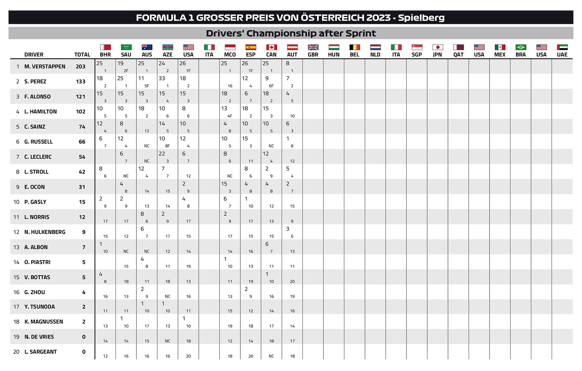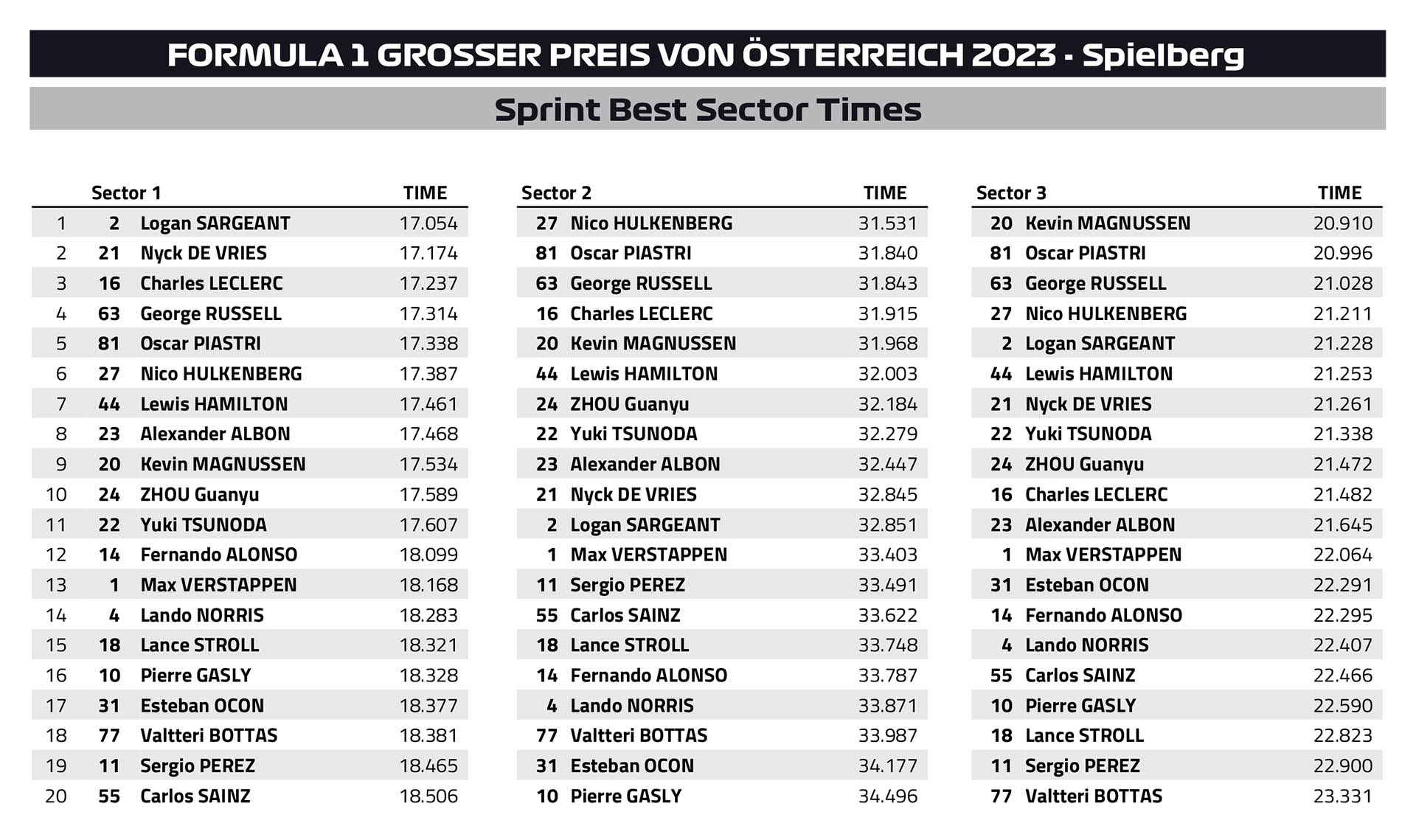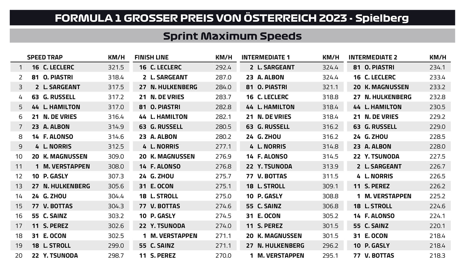 Ο Max Verstappen ήταν ο απόλυτος κυρίαρχος ενός συναρπαστικού σπριντ στο Red Bull Ring, το οποίο ξεκίνησε σε βρεγμένη πίστα η οποία στέγνωσε στους τελευταίους γύρους. Ο Verstappen, έπειτα από μία κακή εκκίνηση, έδωσε σκληρή μάχη με τον Sergio Perez στον πρώτο γύρο, με αρκετά ριψοκίνδυνες κινήσεις στις πρώτες στροφές. Αφότου κατάφερε να περάσει εμπρός από το Μεξικανό, ο Verstappen ξέφυγε μπροστά και φρόντισε να χτίσει μεγάλη διαφορά για να προστατευθεί από το γεγονός ότι η πίστα θα στέγνωνε και κάποιοι θα επέλεγαν στο τέλος τα σλικ ελαστικά, κερδίζοντας πολύ χρόνο.