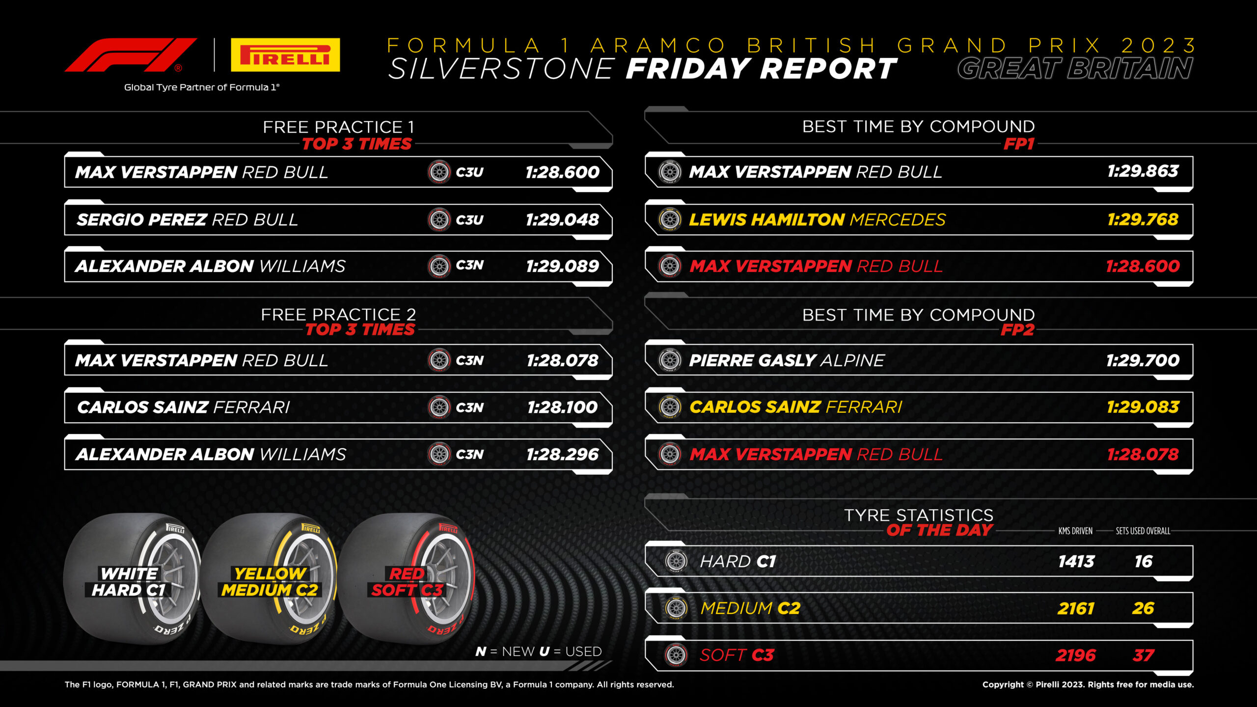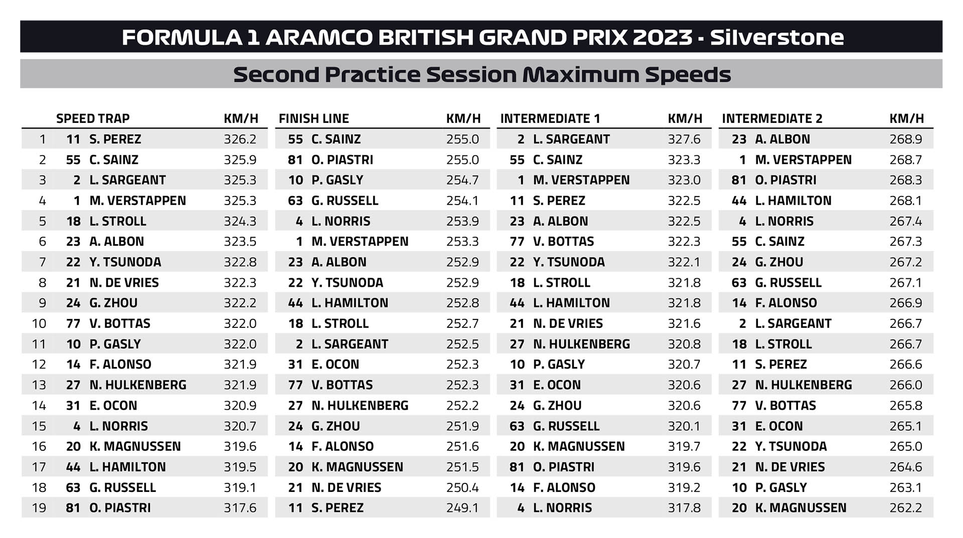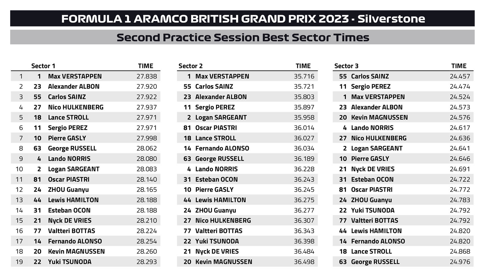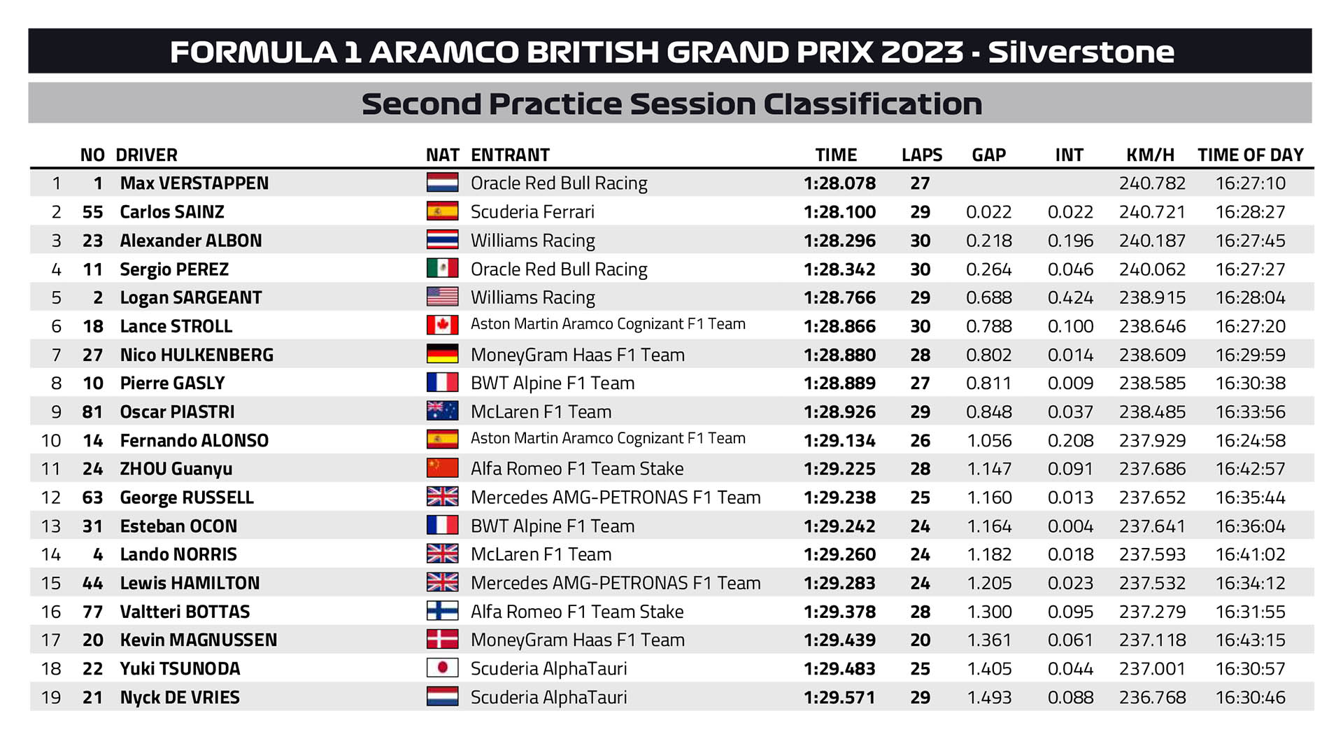 Όπως και στο FP1 του GP Μ. Βρετανίας της Formula 1, o Max Verstappen με τη Red Bull έγραψε τον ταχύτερο χρόνο και της δεύτερης περιόδου ελεύθερων δοκιμών Παρασκευής. Ωστόσο, αυτή τη φορά η διαφορά του από τον Carlos Sainz, που κατετάγη στη 2η θέση, ήταν μόλις 22 χλστ. του δλ. Η Ferrari φαίνεται ανταγωνιστική στον ένα γρήγορο γύρο, αλλά οι συνθήκες που αναμένεται να επικρατούν στις κατατακτήριες δοκιμές θα είναι διαφορετικές σύμφωνα με τις μετεωρολογικές προβλέψεις, που κάνουν λόγο για 55% πιθανότητα βροχής.