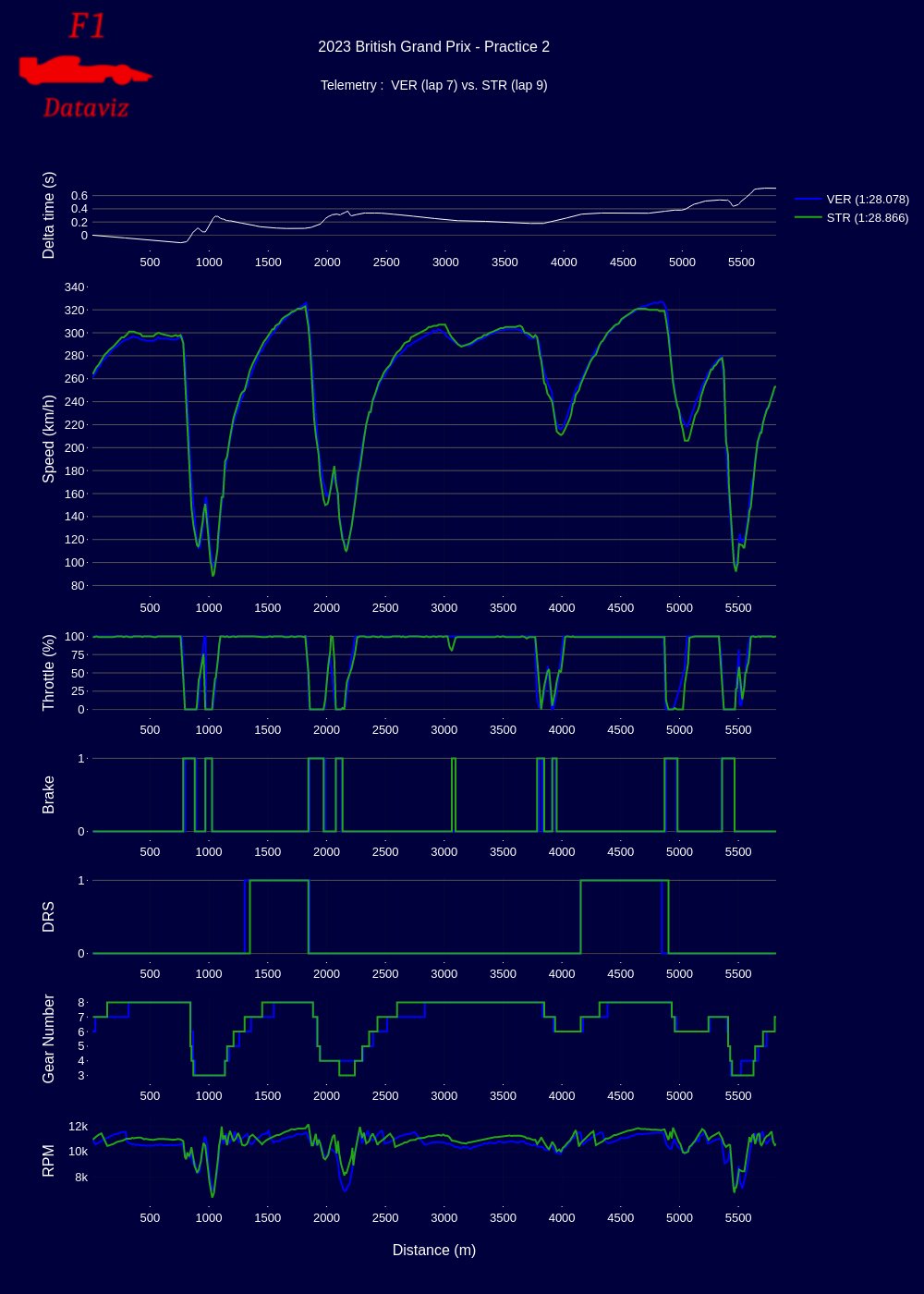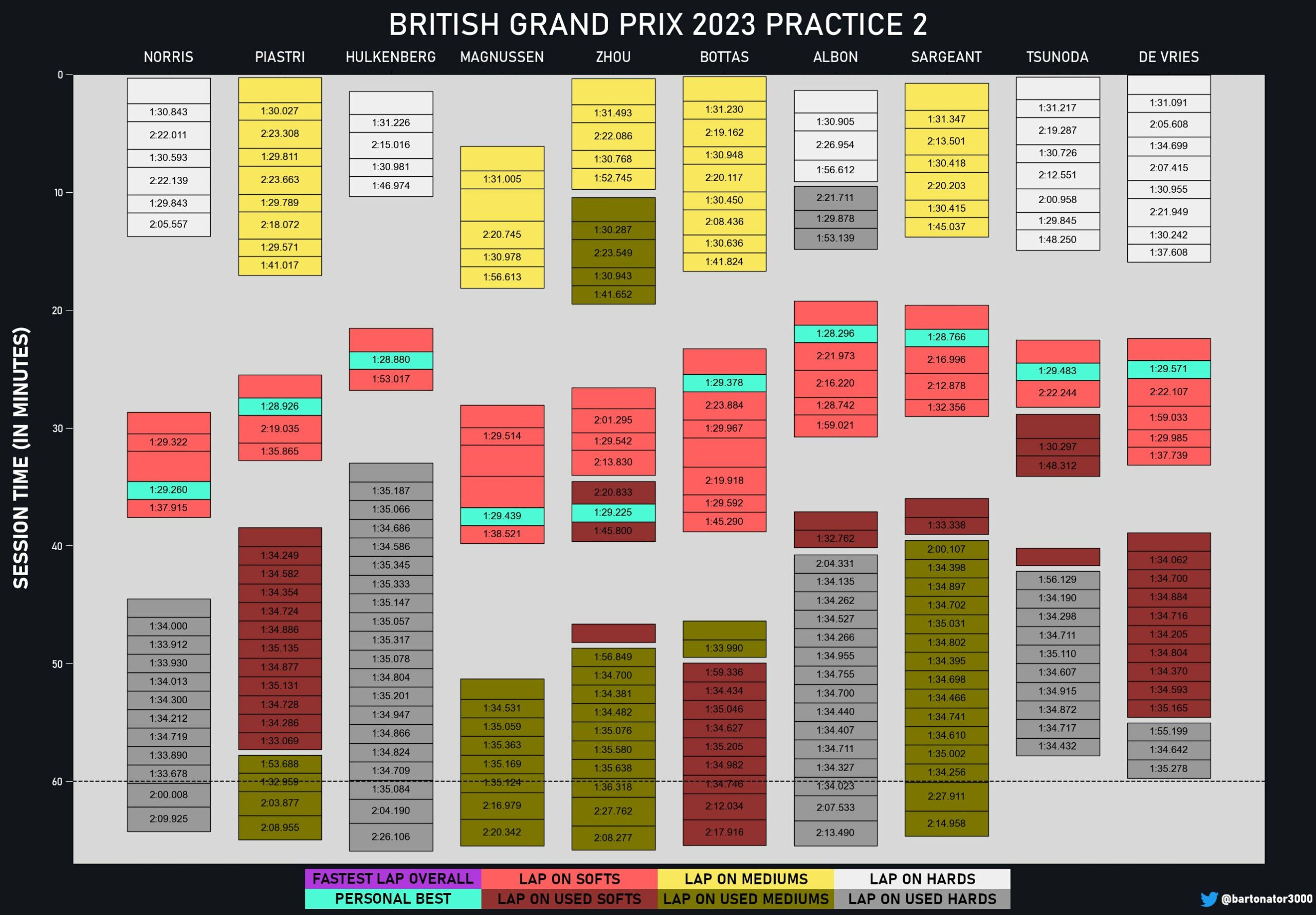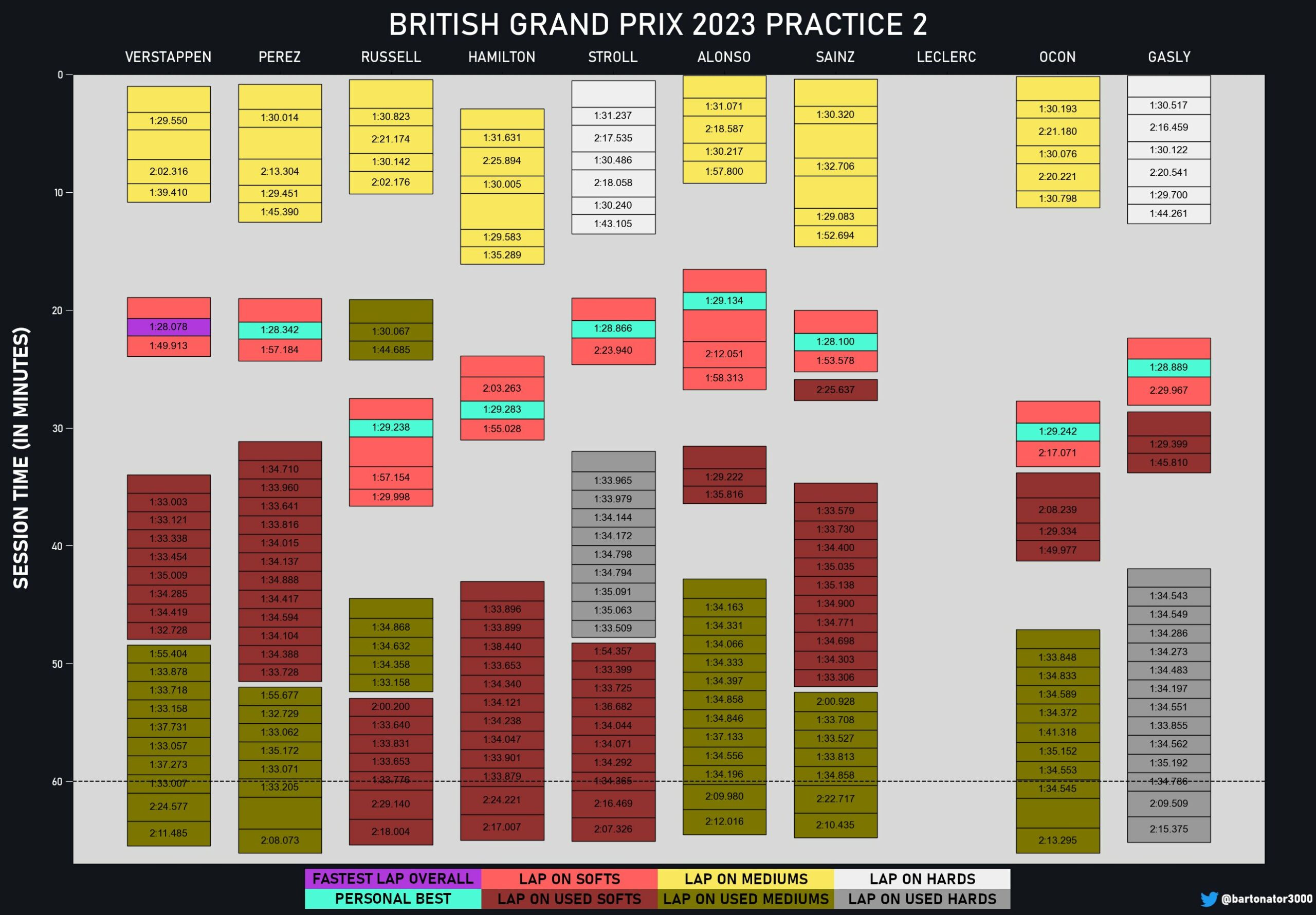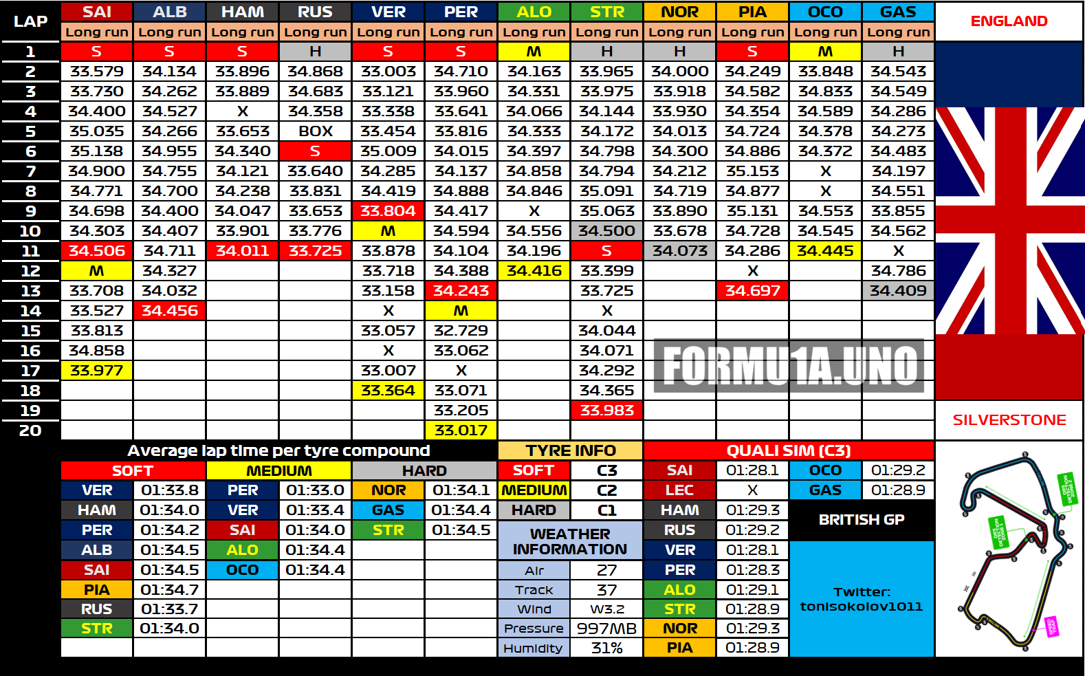 Όπως και στο FP1 του GP Μ. Βρετανίας της Formula 1, o Max Verstappen με τη Red Bull έγραψε τον ταχύτερο χρόνο και της δεύτερης περιόδου ελεύθερων δοκιμών Παρασκευής. Ωστόσο, αυτή τη φορά η διαφορά του από τον Carlos Sainz, που κατετάγη στη 2η θέση, ήταν μόλις 22 χλστ. του δλ. Η Ferrari φαίνεται ανταγωνιστική στον ένα γρήγορο γύρο, αλλά οι συνθήκες που αναμένεται να επικρατούν στις κατατακτήριες δοκιμές θα είναι διαφορετικές σύμφωνα με τις μετεωρολογικές προβλέψεις, που κάνουν λόγο για 55% πιθανότητα βροχής.
