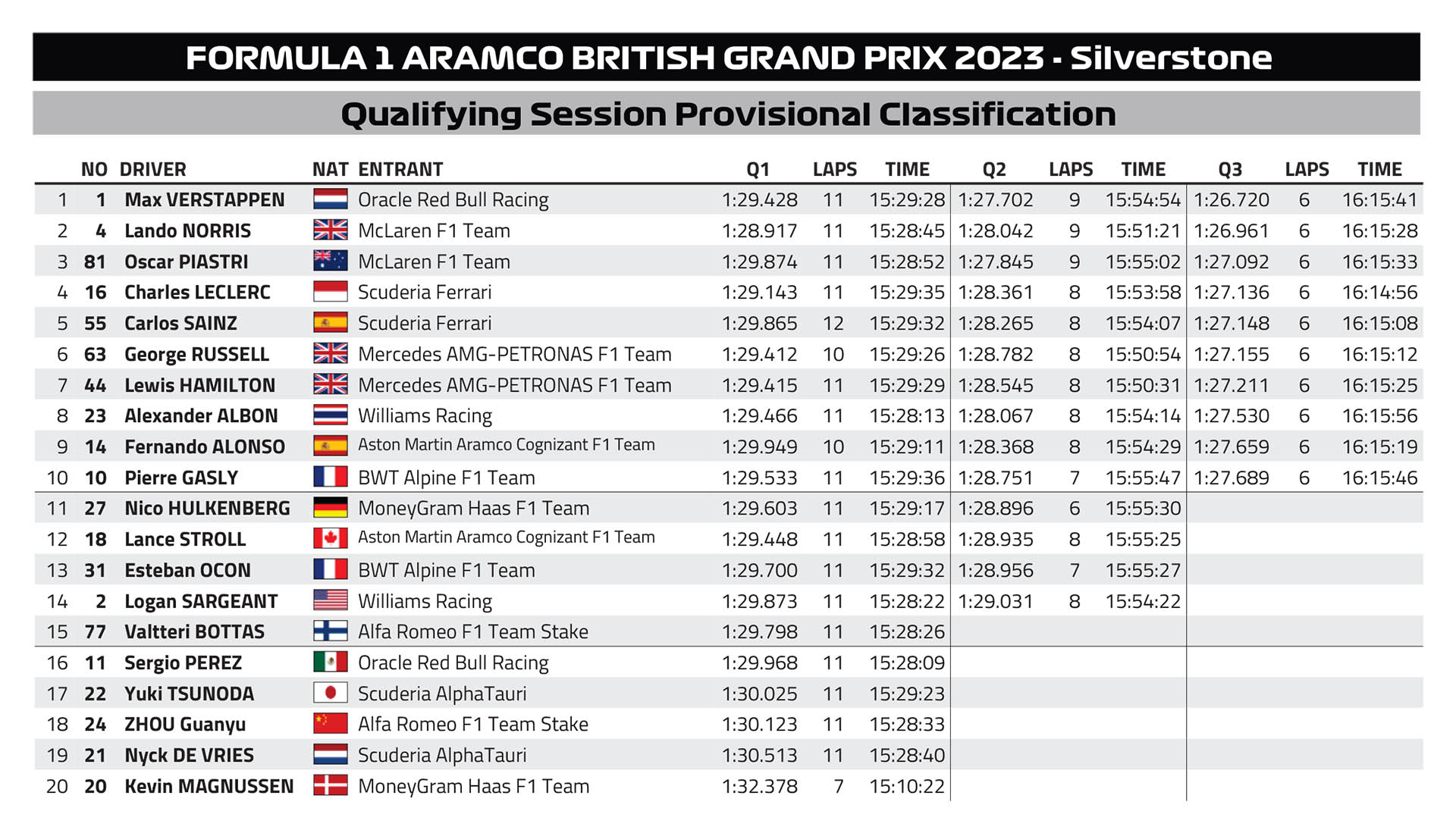 Τόσο ο Stroll όσο και ο Ocon βρέθηκαν εκτός δεκάδας και δεν προκρίθηκαν στο τελικό σκέλος. Οι δύο οδηγοί θα παραταχθούν αύριο πίσω από τον Nico Hulkenberg, που θα εκκινήσει 11ος με τη Haas. Από τη διαδικασία αποκλείστηκε επίσης και ο Logan Sargeant (14ος), ο οποίος είδε κάποιους χρόνους του να διαγράφονται για παράβαση ορίων πίστας, μαζί με τον Valtteri Bottas που είχε ήδη εγκαταλείψει από το Q1.