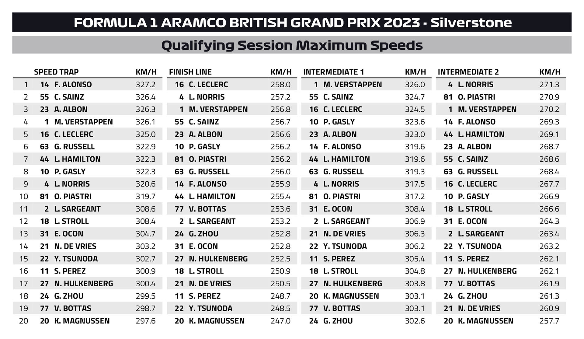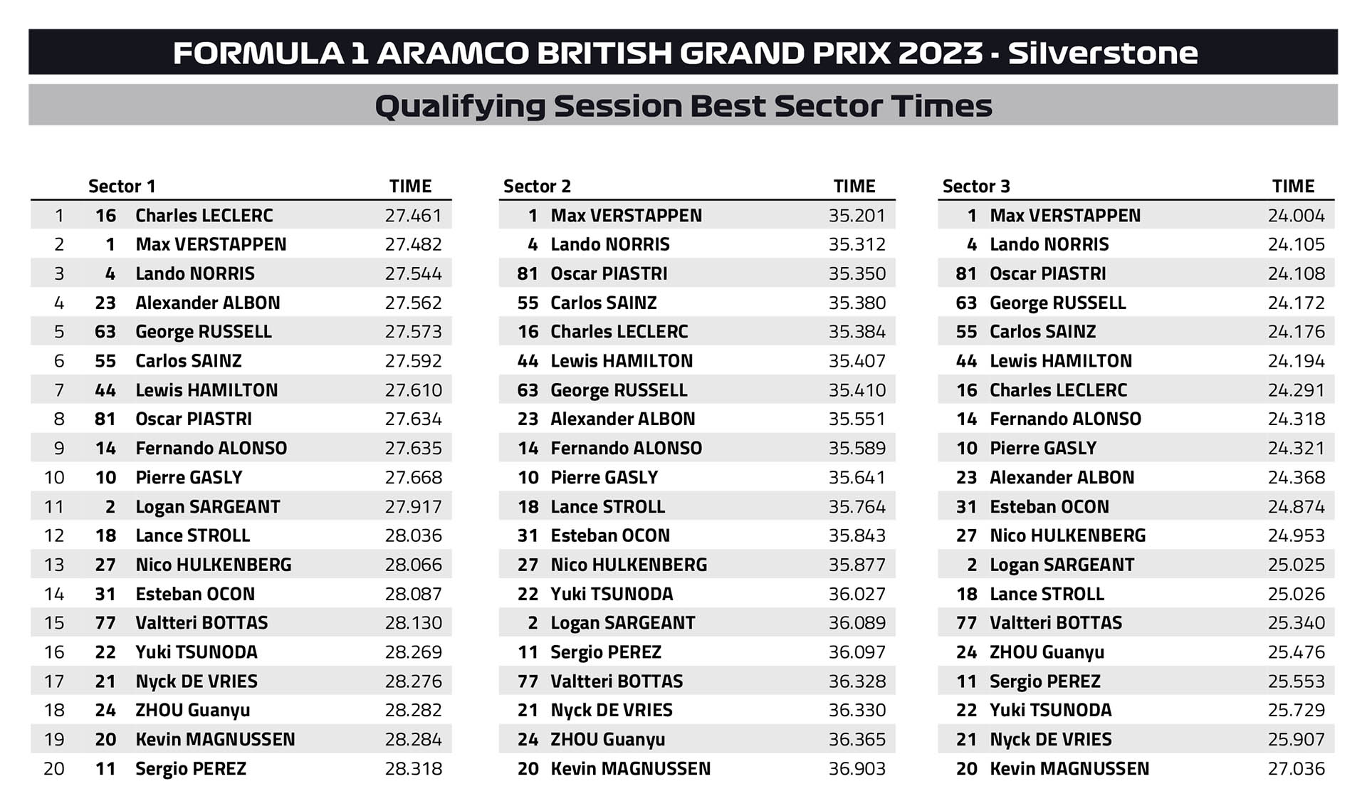 Οι δύο McLaren θα εκκινήσουν τον αγώνα της Κυριακής εμπρός από τις δύο Ferrari. O Charles Leclerc κατάφερε να κινηθεί ταχύτερα από τον team-mate του στη Scuderia, Carlos Sainz, για μόλις 12 χλστ. του δλ., αλλά βρέθηκε πάνω από 4 δέκατα μακριά από την κορυφή. Ο Μονεγάσκος έκανε ένα λάθος στη Stowe που του κόστισε 3 δέκατα του δλ. και 20 χλμ./ώρα ταχύτητα στην κορυφή της στροφής, επειδή άνοιξε υπερβολικά τη γραμμή του.
