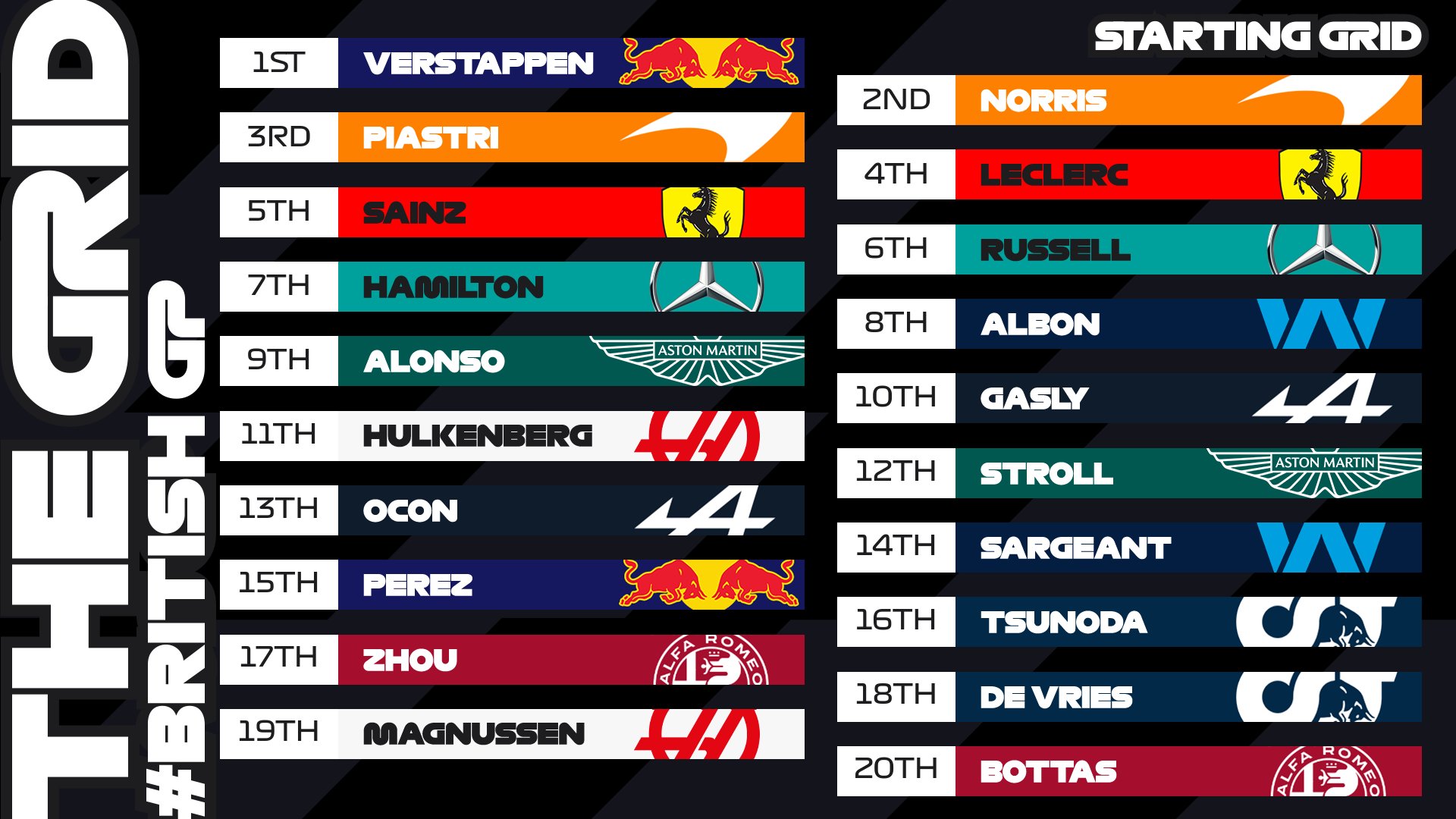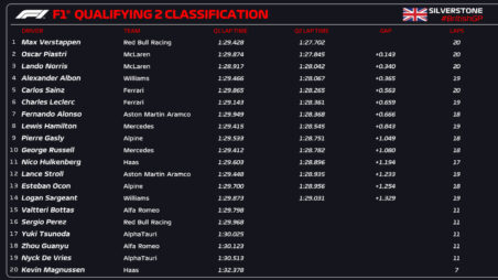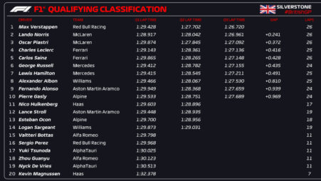 Ο Max Verstappen σημείωσε τον ταχύτερο χρόνο στη διαδικασία κατατακτήριων δοκιμών του GP Μ. Βρετανίας, για να σημειώσει την 5η συνεχόμενη pole position, με διαφορά 0,24 δλ. από τον Lando Norris, ο οποίος θα βρεθεί στην πρώτη σειρά της εκκίνησης για 3η φορά στην καριέρα του στη Formula 1. O Verstappen ήταν ο μοναδικός οδηγός που διέθετε δύο καινούργια σετ ελαστικών μαλακής γόμας στο Q3 και η Red Bull ευνοήθηκε από το γεγονός ότι στο τελικό σκέλος ενεργοποιήθηκε το DRS.