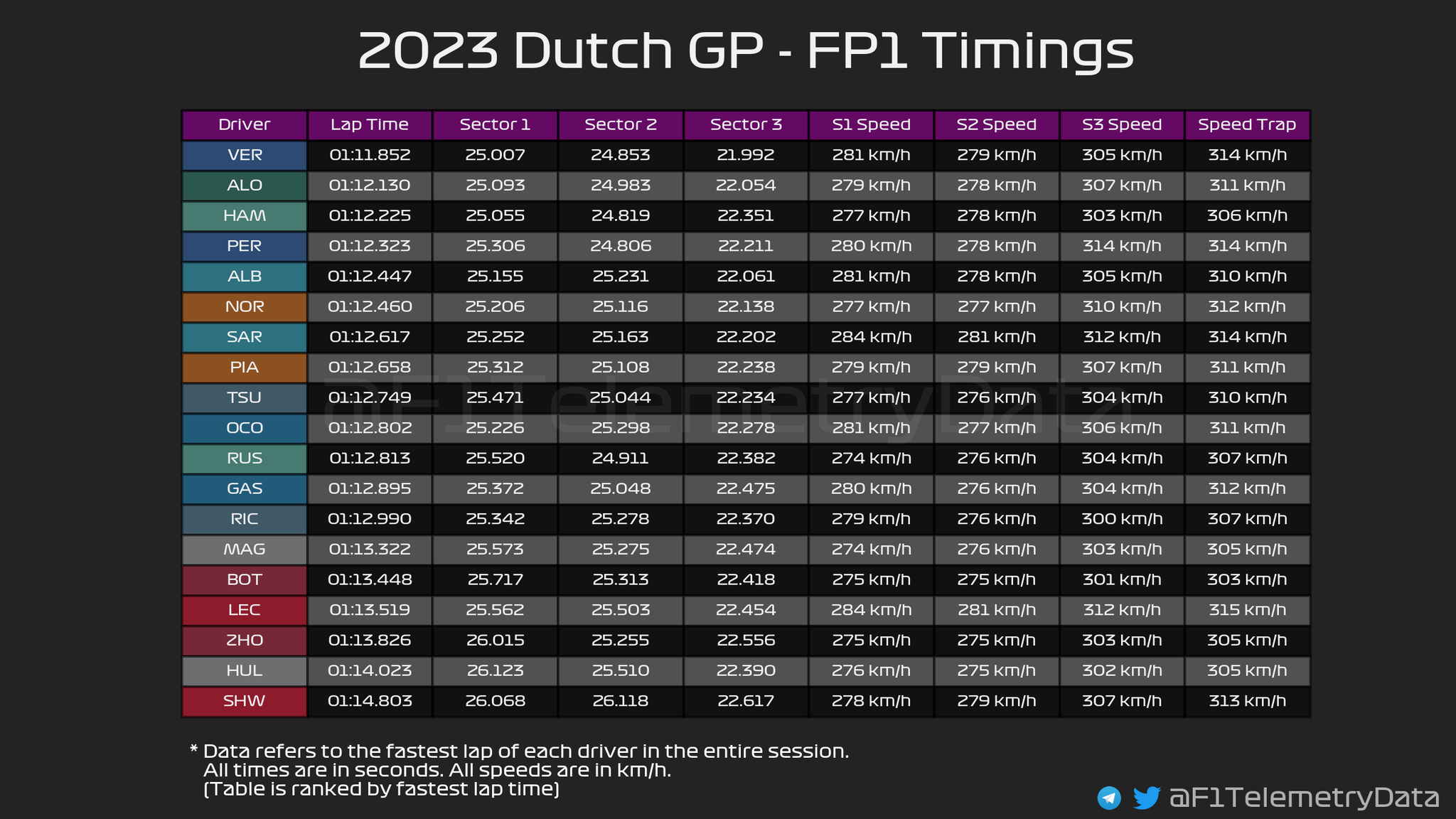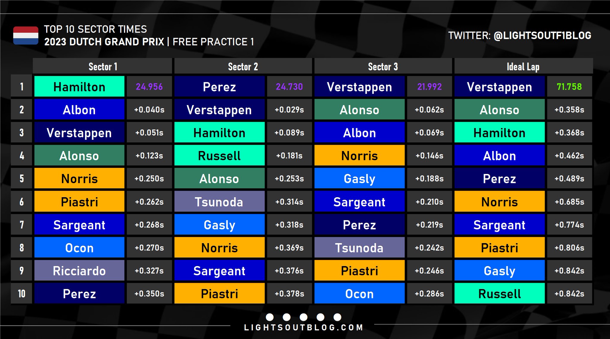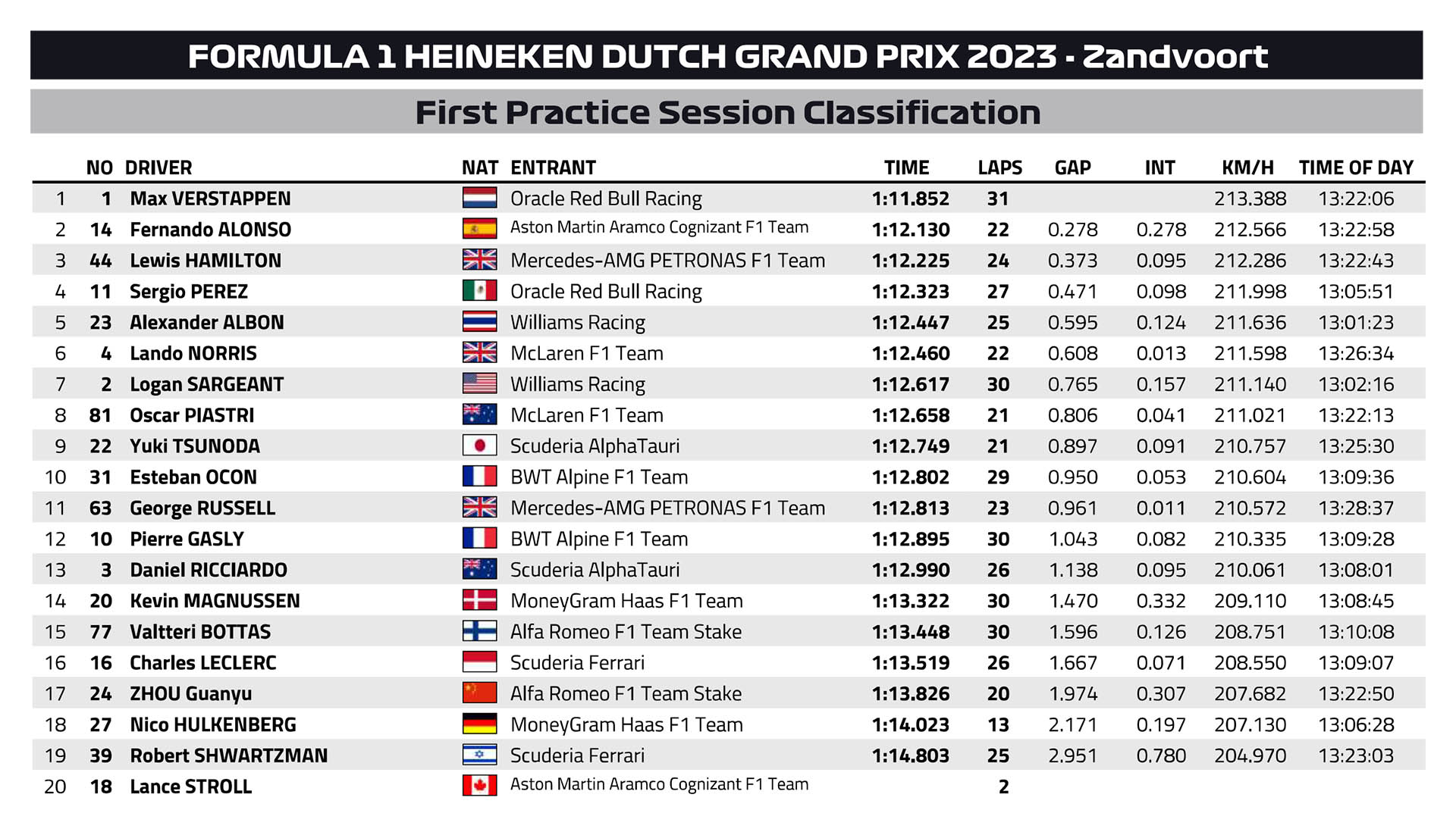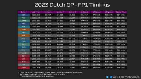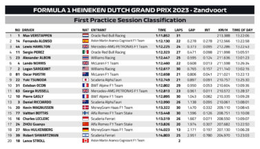 Ο Max Verstappen σημείωσε με τη Red Bull τον ταχύτερο χρόνο της διαδικασίας του FP1 του αγώνα της πατρίδας του, καθώς αυτό το Σαββατοκύριακο κυνηγάει την 9η συνεχόμενη νίκη του, για να ισοφαρίσει το ρεκόρ του Sebastian Vettel από το 2013. Πίσω από τον Ολλανδό Πρωταθλητή, που είχε μία έξοδο στις στροφές 11/12 στα τελικά λεπτά, βρέθηκε ο Fernando Alonso με την Aston Martin, που ήταν πολύ γρήγορη στις κεκλιμένες στροφές 3 και 13 καθώς και στις 9/10, με το καινούργιο δάπεδο που παρουσίασε στο Zandvoort.