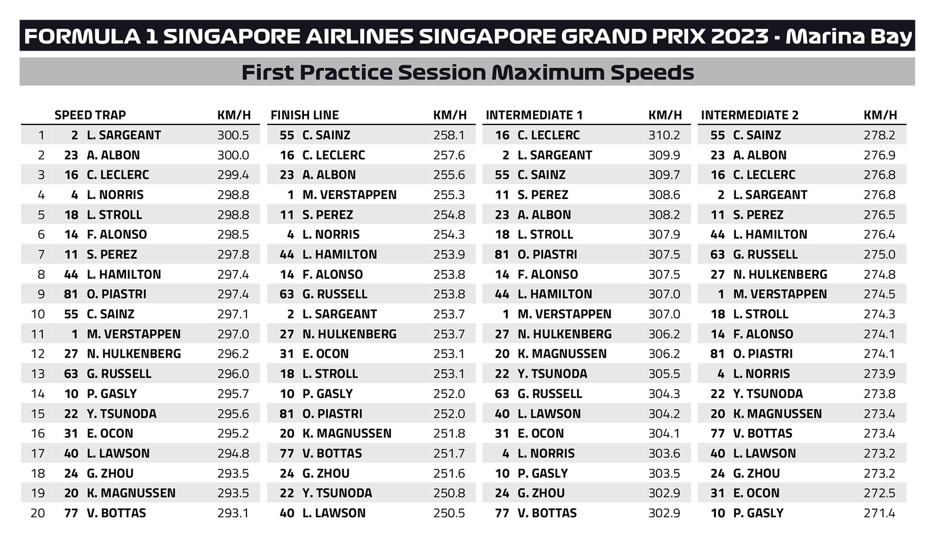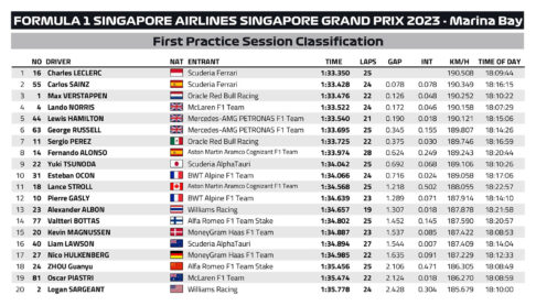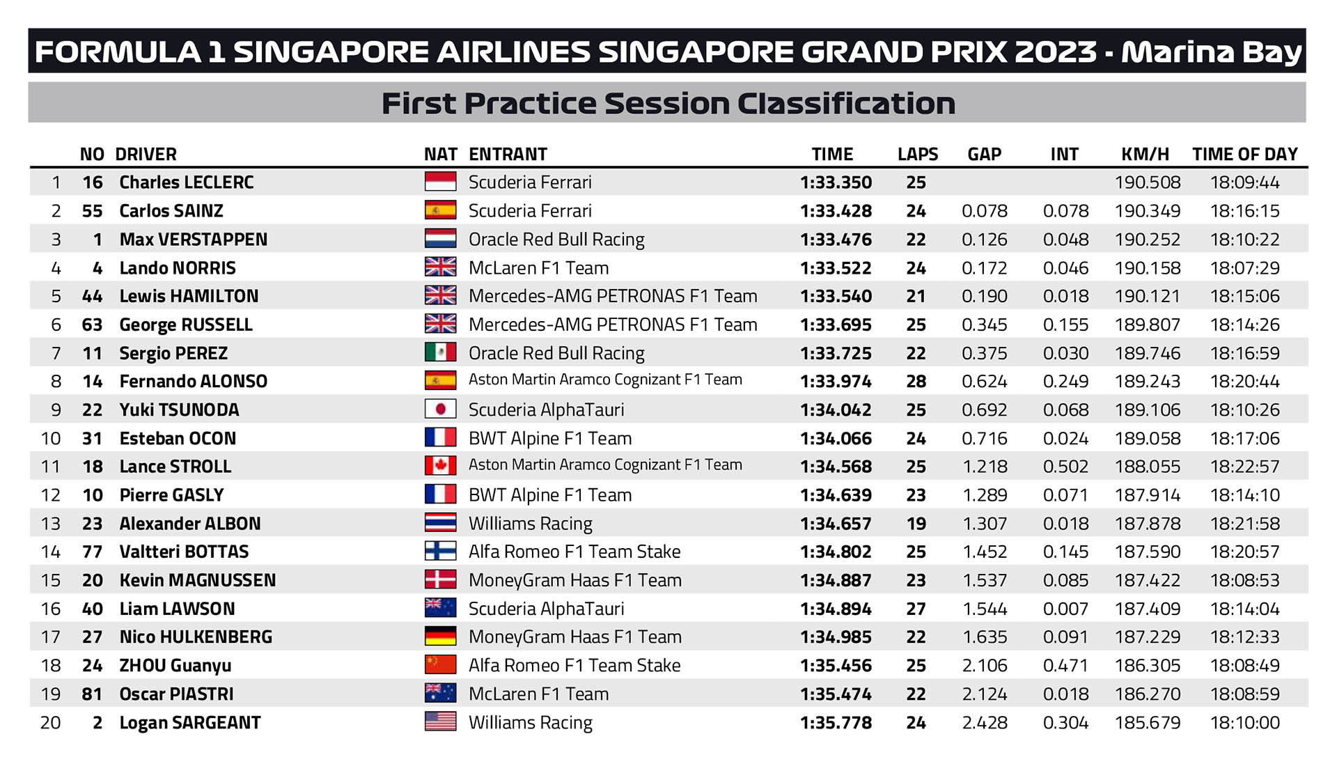 Παρότι οι οδηγοί της Ferrari δήλωσαν εχθές ότι η Marina Bay αποτελεί μία δύσκολη πίστα για τα μονοθέσια της Scuderia, η ιταλική ομάδα έκανε το «1-2» στο FP1, με τον Charles Leclerc να γράφει χρόνο 1:33.350. Πολύ μακριά από τις προσομοιώσεις του 1:27.7, αλλά οι χρόνοι θα βελτιωθούν σημαντικά έως τις κατατακτήριες δοκιμές. Ο έτερος οδηγός της Ferrari, Carlos Sainz, βρέθηκε στη 2η θέση, μόλις 0,078 δλ. πίσω από τον team-mate του.