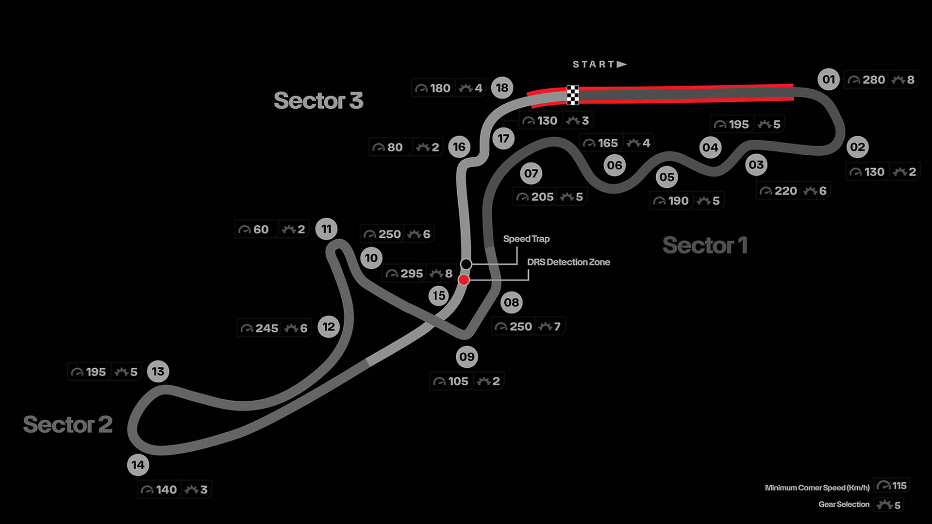 Στις κατατακτήριες δοκιμές, οι οδηγοί διανύουν την πρώτη στροφή της πίστας χωρίς να πατήσουν φρένο και βιώνουν πλευρικές επιταχύνσεις 4,3 G, με μερικές ταχύτατες εναλλαγές κατεύθυνσης να ακολουθούν στα «S» (στροφές 3-7). Οι οδηγοί διανύουν σχεδόν 2 χλμ. στην αρχή του γύρου (από τα 5.807 μ. συνολικά) στρίβοντας διαρκώς το τιμόνι. Είναι πίστα που απαιτεί καλή αεροδυναμική απόδοση (σχέση παραγόμενου φορτίου/οπισθέλκουσας) και το 1ο sector αποτελεί πολύ καλό δείκτη των ικανοτήτων των μονοθεσίων σε αυτό τον τομέα.