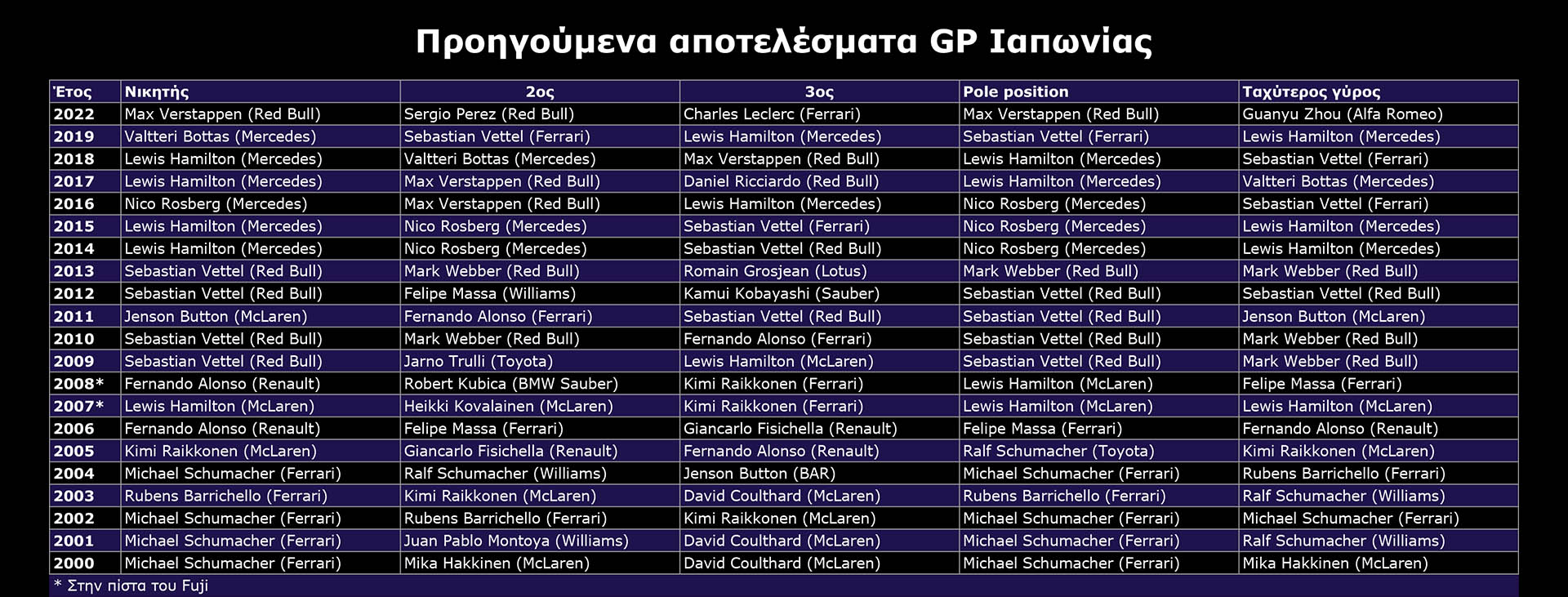 Οι Ιάπωνες ανέκαθεν είχαν βαθιά αγάπη για τη Formula 1 και η πίστα της Suzuka έχει φιλοξενήσει αρκετές φορές τον αγώνα που έκρινε τον τίτλο, πολλές φορές με δραματικό τρόπο. Η μοναδική πίστα της Formula 1 με χάραξη σχήματος «8» αποτελεί μία από τις μεγαλύτερες οδηγικές προκλήσεις της σεζόν.