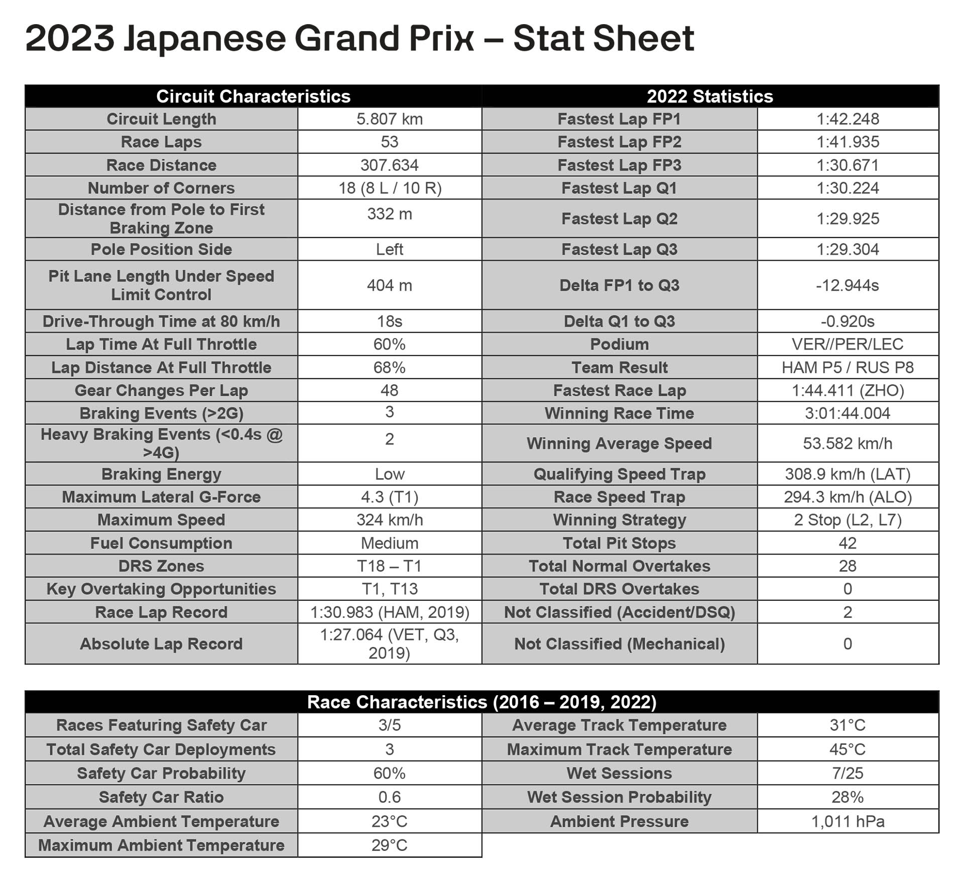 Στη Suzuka η καταπόνηση του συστήματος πέδησης είναι μικρή, με μόλις 3 ζώνες έντονου φρεναρίσματος. Το σχήμα «8» την κάνει την πιο «συμμετρική» πίστα της χρονιάς, με 10 δεξιές και 8 αριστερές στροφές. Κατά συνέπεια, καταπονεί ισόποσα τα ελαστικά και των δύο πλευρών των μονοθεσίων, με υψηλά πλευρικά να ασκούνται σε αυτά.
