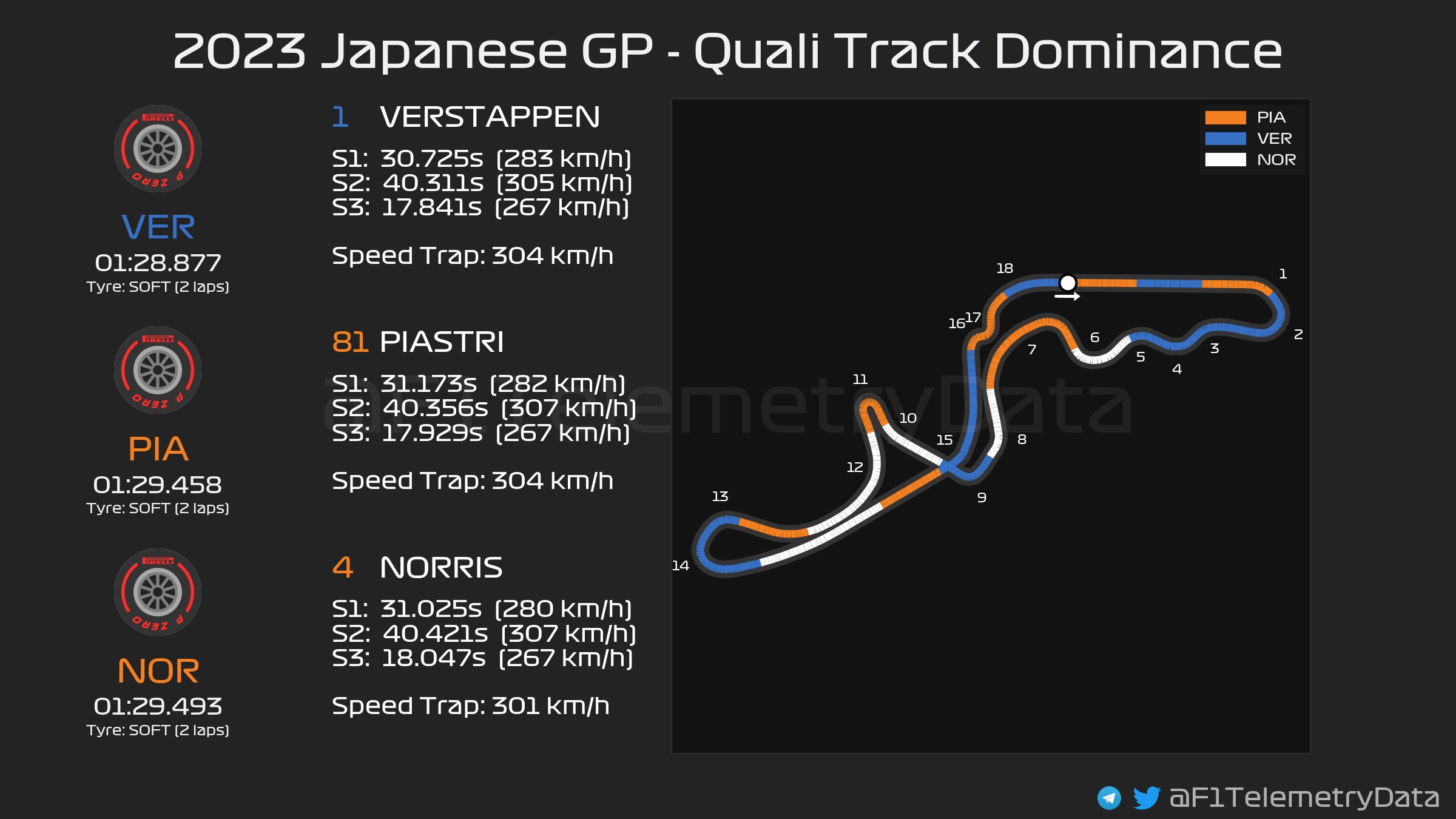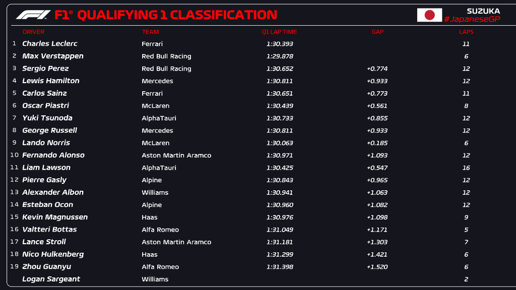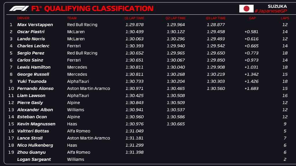 Ο Oscar Piastri σημείωσε το 2ο ταχύτερο χρόνο και θα γίνει μόλις ο 5ος Αυστραλός οδηγός που θα βρεθεί στην πρώτη σειρά εκκίνησης σε Grand Prix της Formula 1, καθώς κατάφερε στην πρώτη του επίσκεψη στη Suzuka (όχι μόνο στην F1), κατάφερε να κινηθεί ταχύτερα -για μόλις 0,035 δλ.- από τον πολύ πιο έμπειρο team-mate του, Lando Norris, ο οποίος υπερηφανεύεται για την απόδοσή του στις γρήγορες στροφές από τις οποίες η Suzuka έχει πολλές. Ο Piastri είναι ο πρώτος οδηγός από το Nico Hulkenberg το 2010 που βρεθεί στην πρώτη σειρά εκκίνησης στην πρώτη του σεζόν στη Formula 1.