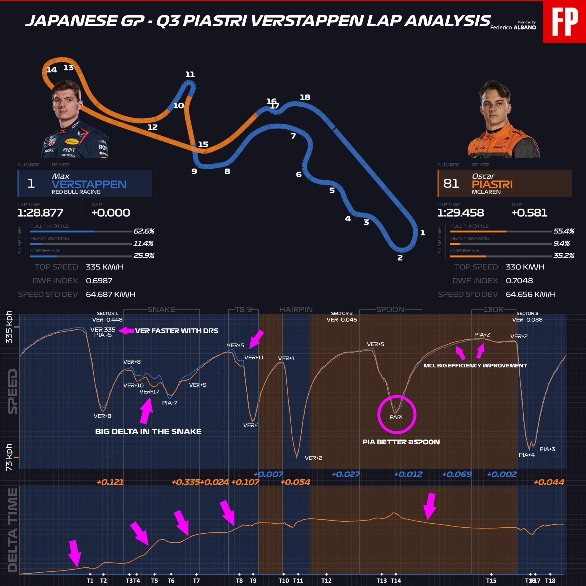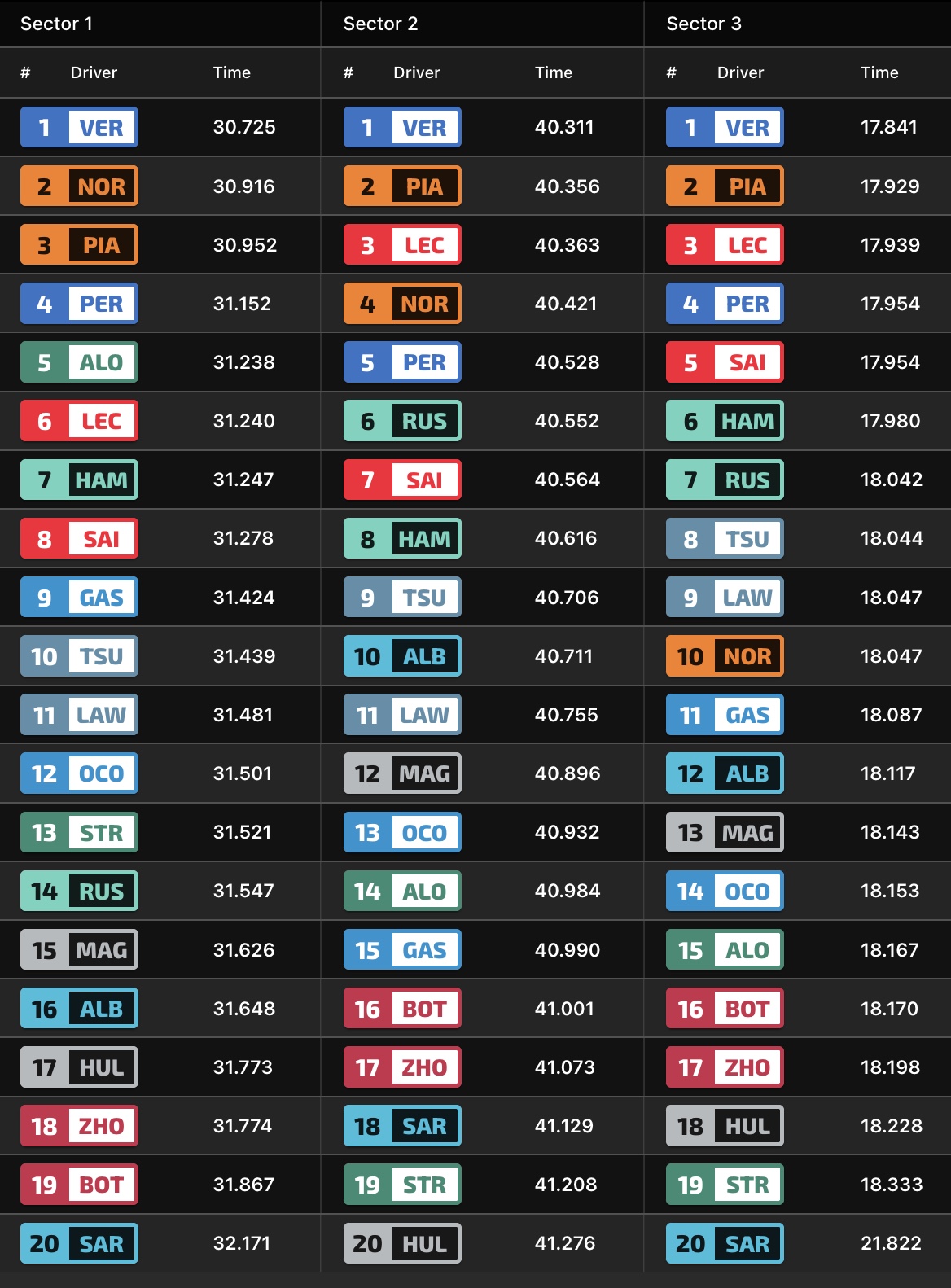 Σε αυτές, η MCL60 επέδειξε τις δυνατότητές της σε μία πίστα όπου ο περιοριστικός παράγοντας είναι η πρόσφυση των ελαστικών του εμπρός άξονα. Ωστόσο, κανένας από τους δύο οδηγούς της McLaren δεν κατάφερε να βελτιώσει στη δεύτερη προσπάθειά του στο Q3. O Piastri ανέφερε για το δεύτερο γύρο του ότι ήταν καλός στα δύσκολα κομμάτια (sector 1), και έκανε λάθη στα πιο εύκολα τμήματα.