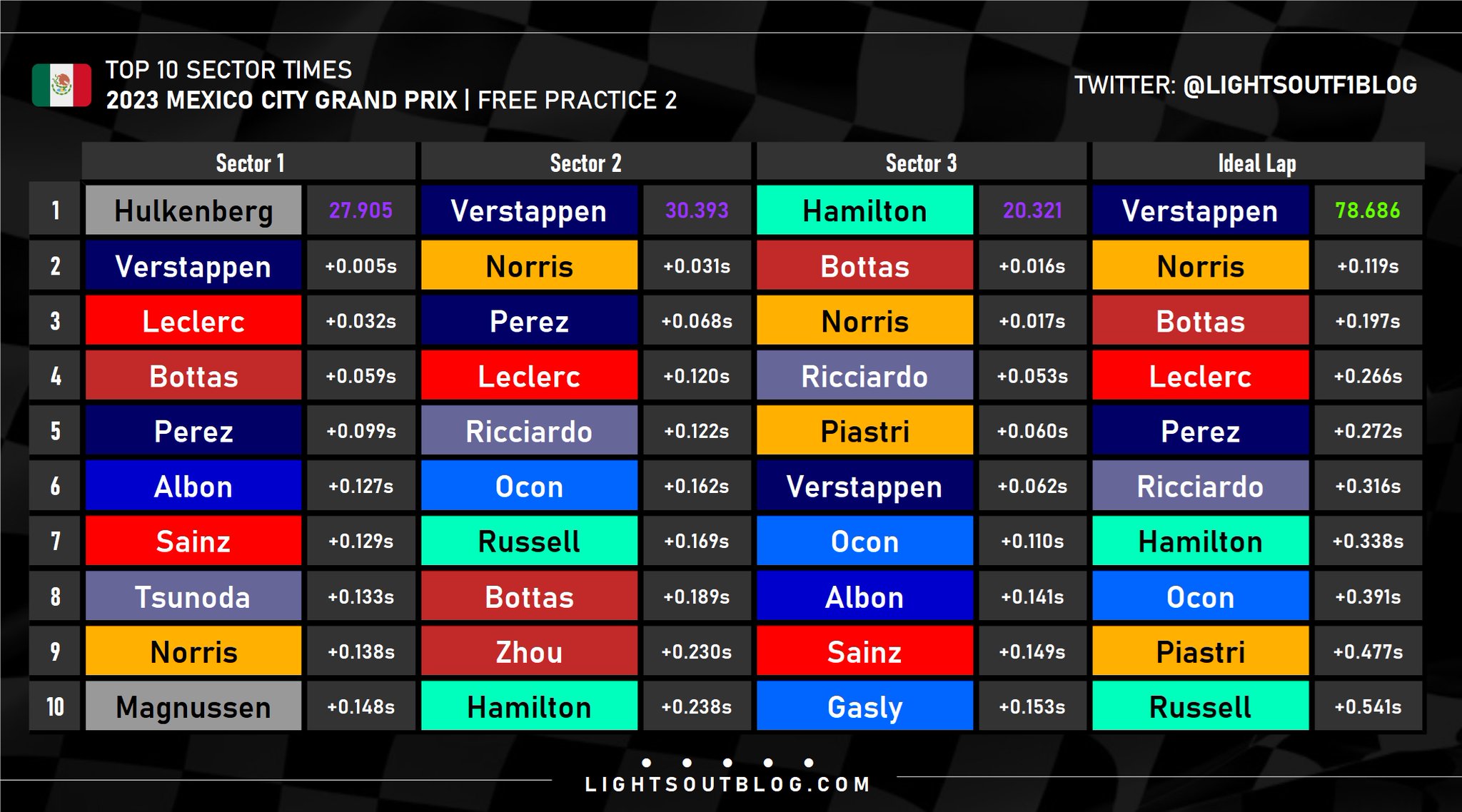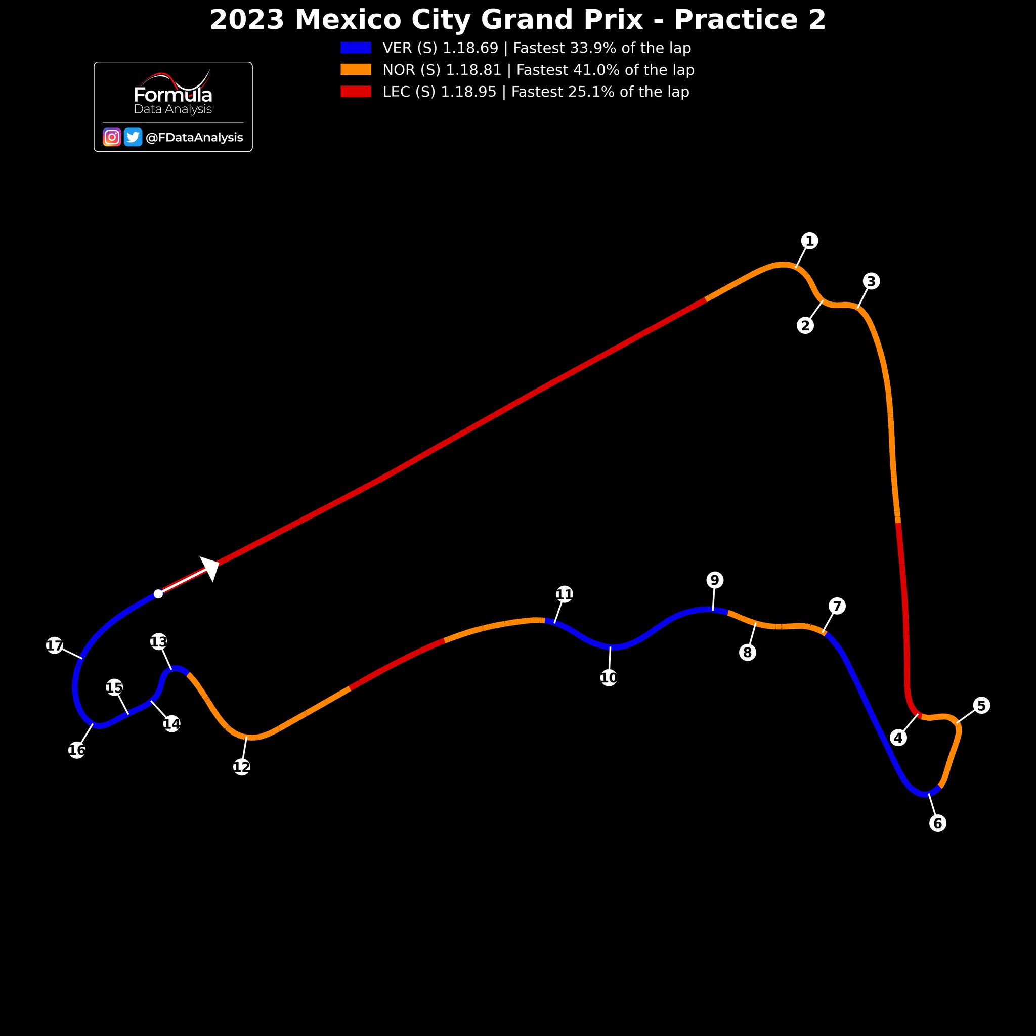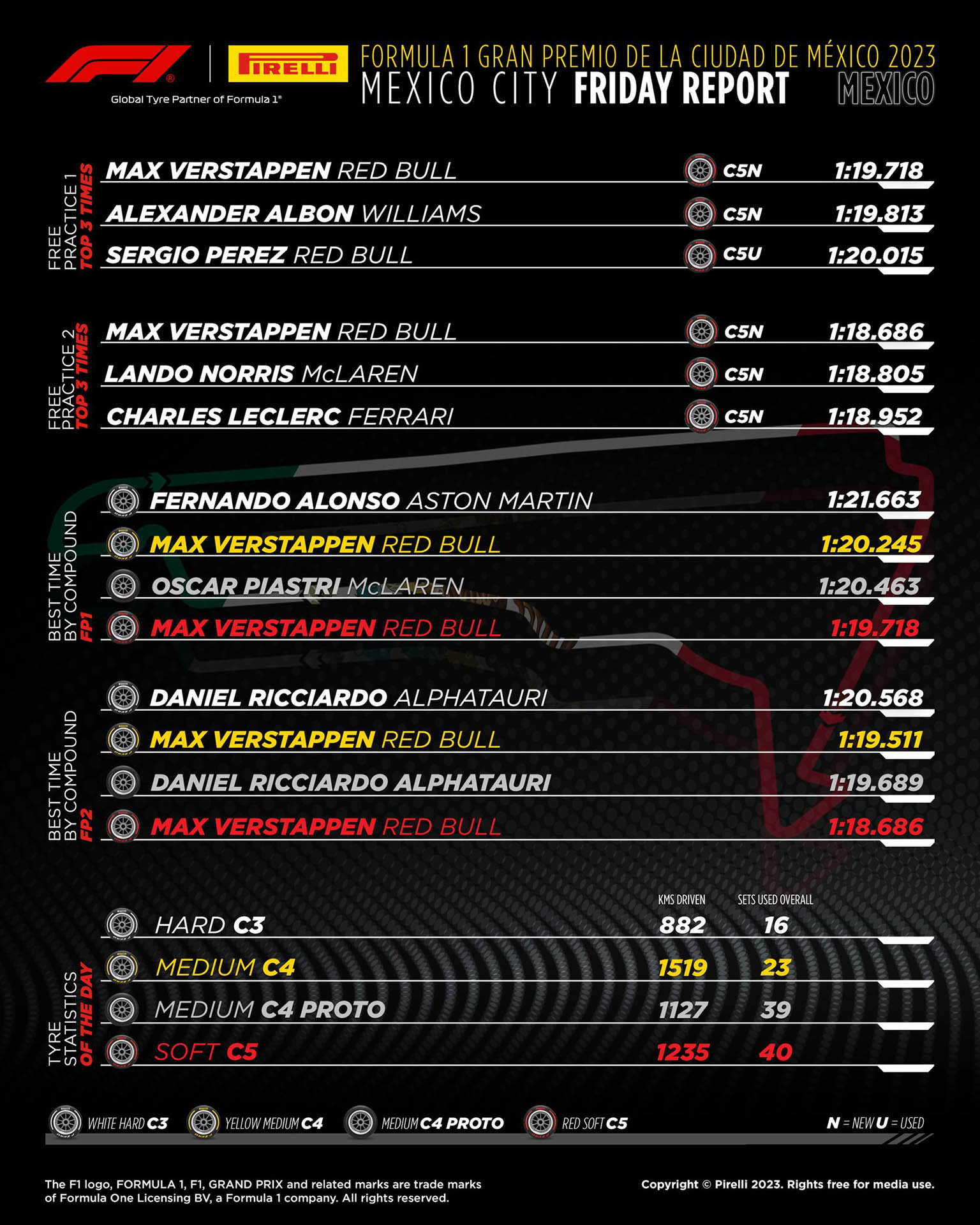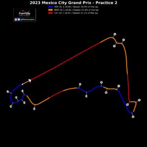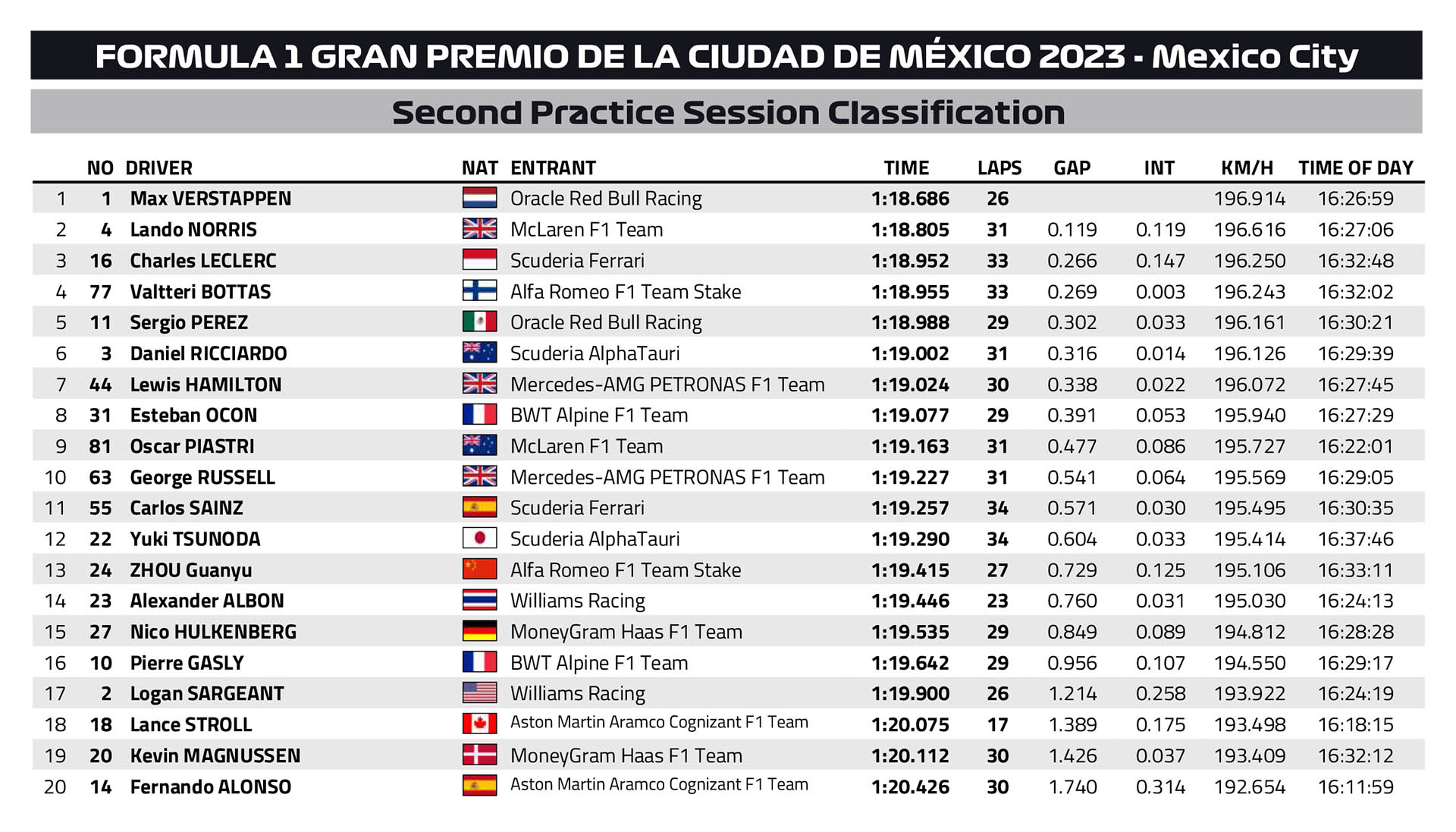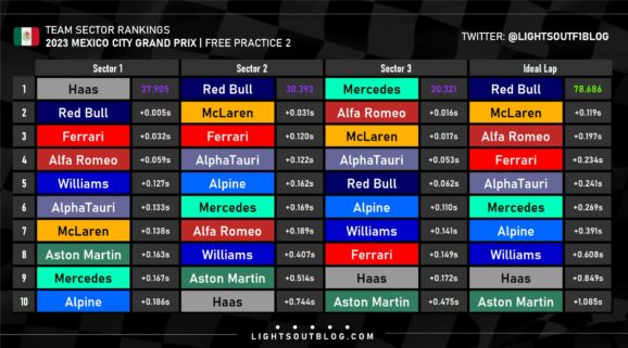 O Max Verstappen σημείωσε τον ταχύτερο χρόνο και στη δεύτερη περίοδο ελεύθερων δοκιμών του GP Μεξικού, ακριβώς όπως είχε κάνει και στο FP1. O Ολλανδός Πρωταθλητής είχε διαφορά μόλις 0,12 δλ. από το Lando Norris, ο οποίος σημείωσε το 2ο ταχύτερο χρόνο της διαδικασίας με τη McLaren. Ωστόσο, ο ρυθμός του Verstappen στην προσομοίωση αγώνα ήταν ταχύτατος. Ο Norris έγραψε και αυτός μερικούς καλούς χρόνους.