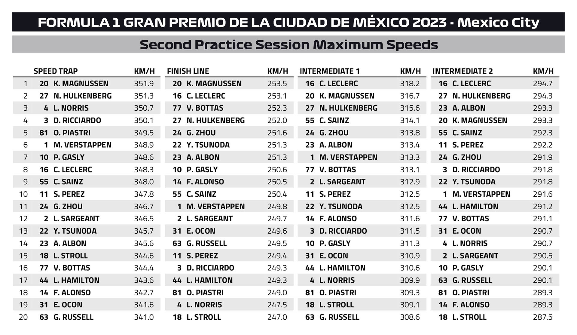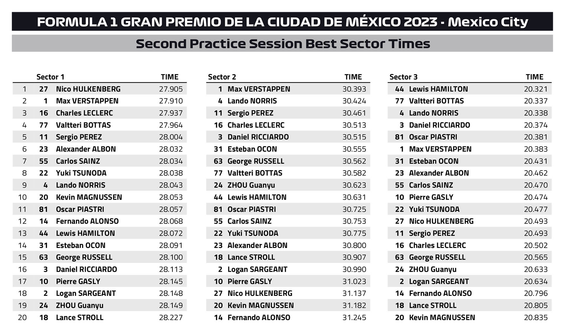 Την πρώτη δεκάδα συμπλήρωσαν οι Oscar Piastri με τη McLaren, στην πρώτη του επίσκεψη στην πίστα Autodromo Hermanos Rodriguez, και ο George Russell με τη δεύτερη Mercedes, ο οποίος επίσης είχε παραχωρήσει το μονοθέσιό του στο νεαρό Frederik Vesti. Στις προσομοιώσεις αγώνα, ο Hamilton ήταν πολύ πιο γρήγορος από το Russell.