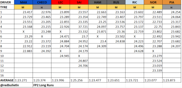 O Carlos Sainz, που έχασε περίπου μισή ώρα στο FP1, λόγω προβλήματος υδραυλικών, βρέθηκε στην 11η θέση, με τον αριστερό καθρέπτη στη Ferrari του να ραγίζει προς το τέλος του FP2. O Ισπανός κατετάγη εμπρός από το Yuki Tsunoda, ο οποίος επειδή χρησιμοποιεί αυτό το τριήμερο την 5η φετινή του μονάδα ισχύος, θα εκκινήσει από το πίσω μέρος του grid.