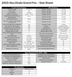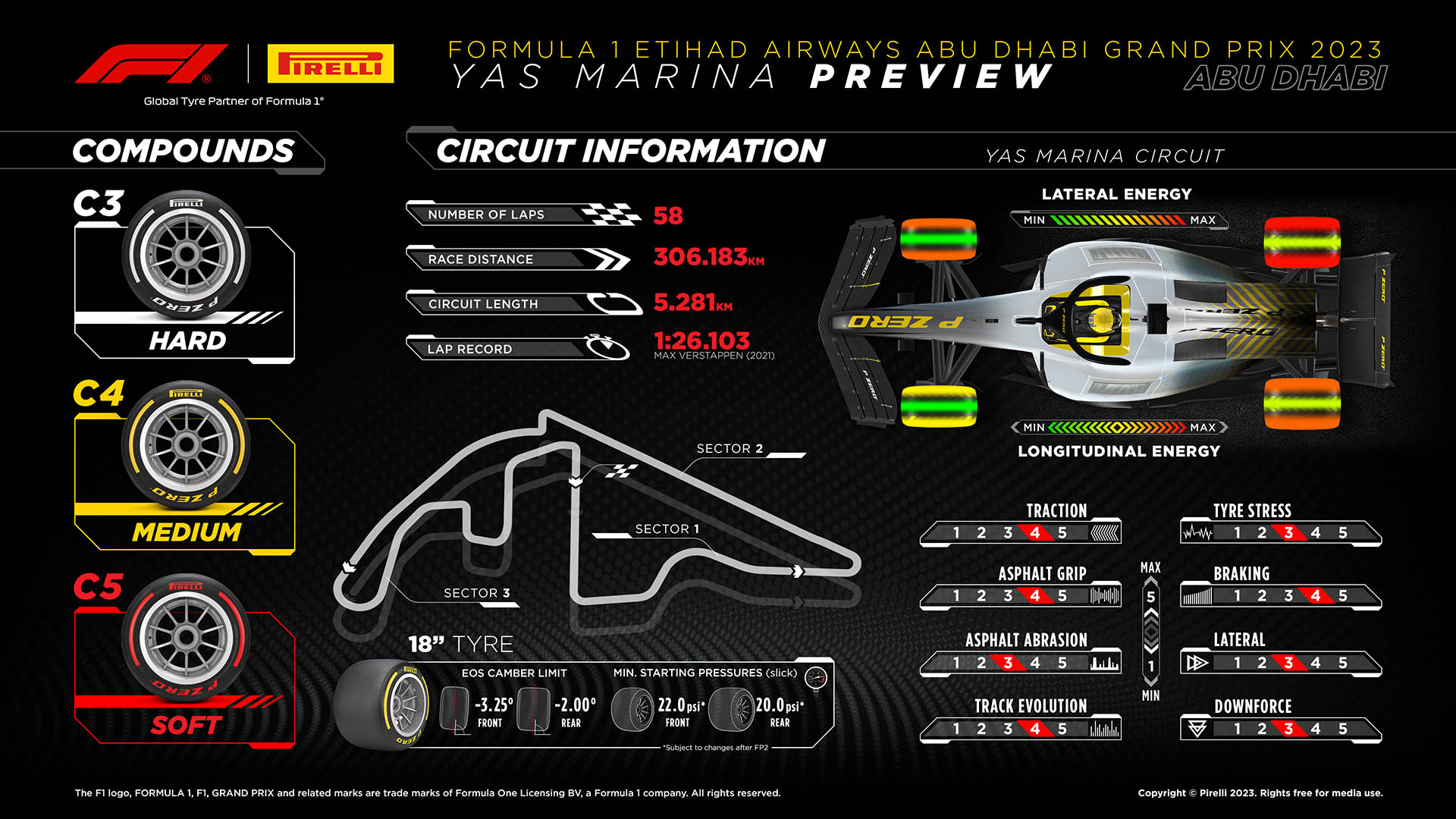 Η και η 3η περίοδος ελεύθερων δοκιμών θα πραγματοποιηθούν πριν από τη δύση του ηλίου, σε συνθήκες οι οποίες δεν είναι αντιπροσωπευτικές, λόγω των υψηλότερων θερμοκρασιών που θα επικρατούν. Συνεπώς, το FP2 θα είναι η πιο σημαντική από τις περιόδους ελεύθερων δοκιμών. Επίσης, φέτος η πίστα της Yas Marina θα έχει βάθρο τύπου Monza, το οποίο θα εκτείνεται έως την πίστα στην ευθεία εκκίνησης/τερματισμού, όπου έχουμε δει πολλές φορές τους οδηγούς να κάνουν donuts μετά τον τερματισμό.