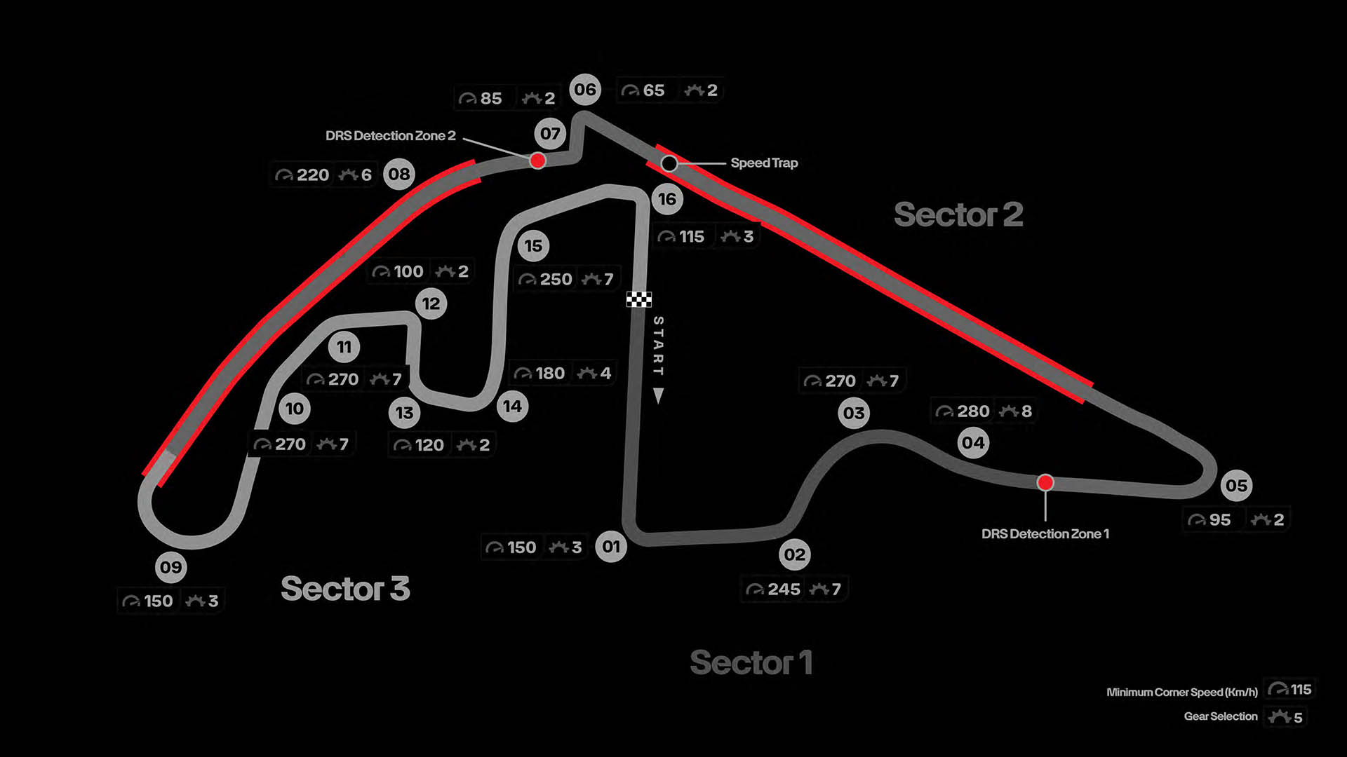 Ζώνες DRS: 2 (μεταξύ των στροφών 5-6, 8-9)