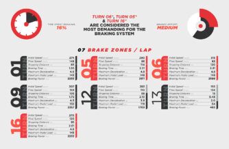 Οι ομάδες επιλέγουν μέσα επίπεδα αεροδυναμικού φορτίου. Η κατανάλωση καυσίμου κυμαίνεται σε μέσα επίπεδα, ενώ λίγο πιο σκληρό έργο έχουν τα συστήματα πέδησης. Οι τροποποιήσεις στη χάραξη εξισορρόπησαν τις διαμήκεις και πλευρικές απαιτήσεις από τα ελαστικά, αλλά ο περιοριστικός παράγοντας εξακολουθεί να είναι συνήθως η καταπόνηση αυτών του πίσω άξονα. Φέτος έχουν ασφαλτοστρωθεί εκ νέου τα τμήματα μεταξύ των στροφών 6-7 και 10-11.