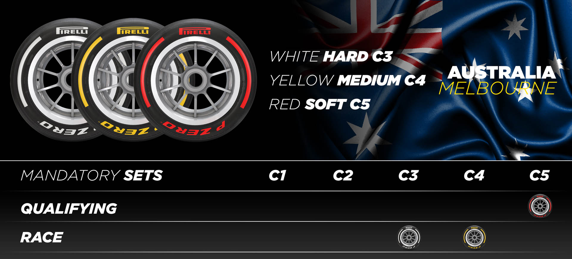 Σε σύγκριση με τις φετινές επιλογές, υπάρχει μια διαφορά για το GP Αυστραλίας, που έχει προγραμματιστεί για τις 22-24 Μαρτίου. Στο Albert Park θα χρησιμοποιηθούν οι τρεις πιο μαλακές γόμες ελαστικών της γκάμας: C3 ως σκληρή, C4 ως μεσαία και C5 ως μαλακή (αντί για C2, C3, C5, που ήταν φέτος). Αυτή η επιλογή βασίζεται στα δεδομένα που συγκεντρώθηκαν φέτος, με στόχο να δημιουργηθούν περισσότερες επιλογές στρατηγικής.
