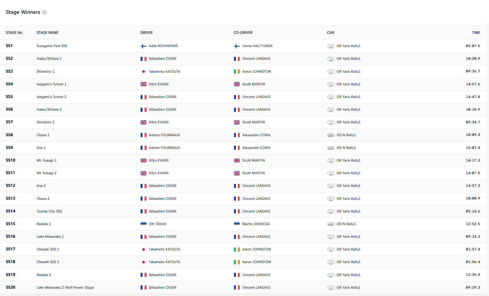 Η εγκατάλειψη του Fourmaux το πρωί της Κυριακής ανέβασε τον Sami Pajari στην 3η θέση, με τον νεαρό Φινλανδό οδηγό της Toyota να ανέβει στο βάθρο στην πορεία του στο WRC στη 16η συμμετοχή στην ανώτερη κατηγορία Rally1. Ο Pajari βρισκόταν στην 5η θέση για το μεγαλύτερο μέρος του αγώνα, αλλά πέρασε 4ος μετά την εγκατάλειψη του Takamoto Katsuta το Σάββατο, όταν ο τοπικός ήρωας έσπασε το υδραυλικό τιμόνι του Toyota GR Yaris Rally1 του, έχοντας προσκρούσει σε πλαστικές μπαριέρες στην ειδική διαδρομή του Mt. Kasagi.