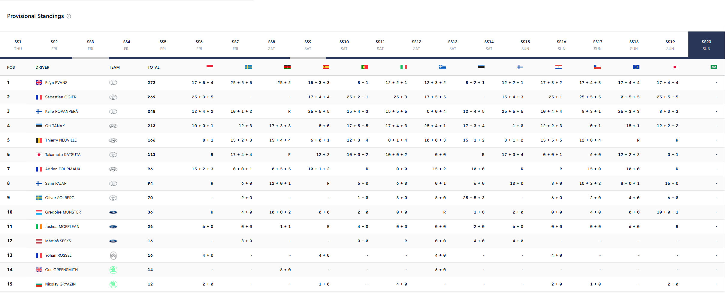 Ο Kalle Rovanpera, που βρέθηκε πολύ πιο πίσω στη γενική κατάταξη στα αρχικά στάδια του αγώνα, παραμένει μαθηματικά στη μάχη για τον τίτλο, αλλά ρεαλιστικά χρειάζεται τόσο ο Evans όσο και ο Ogier να αντιμετωπίσουν σοβαρές δυσκολίες στο φινάλε της σεζόν στη Σαουδική Αραβία για να έχει οποιαδήποτε ελπίδα να γίνει Πρωταθλητής.