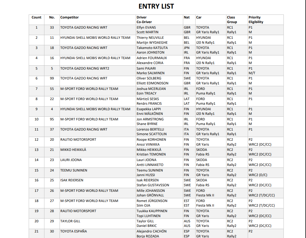 Η Σουηδία θα φιλοξενήσει τον δεύτερο γύρο του Παγκοσμίου Πρωταθλήματος Ράλλυ, όπου ο Sebastien Ogier θα είναι απών από αυτόν τον αγώνα που συνεπάγεται πως η Toyota θα συμμετάσχει με τέσσερα αυτοκίνητα. Οι Elfyn Evans, Oliver Solberg, Takamoto Katsuta και Sami Pajari θα βρεθούν πίσω από το τιμόνι του GR Yaris Rally1. O Esapekka Lappi επιστρέφει με τα χρώματα της Hyundai έχοντας τους Thierry Neuville και Adrien Fourmaux ως συναθλητές του. Από την άλλη πλευρά, η M-Sport Ford έχει βασίσει τις ελπίδες της στους Jon Armstrong και Josh McErlean για την φετινή σεζόν. Τέλος, ο Lorenzo Bertelli θα αγωνιστεί ιδιωτικά με το GR Yaris Rally1, ενώ ο Martins Sesks επιβεβαίωσε την συμμετοχή του στο Ράλλυ Σουηδίας με το τρίτο Puma Rally1.