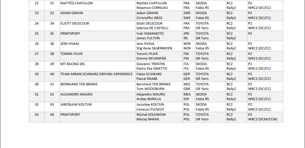 Οι αγωνιζόμενοι στην WRC2 κατηγορία είναι 29 με τους πιο σημαντικότερους να είναι οι Roope Korhonen, Teemu Suninen, Alejandro Cachon, Yuki Yamamoto και Fabio Scwartz με το Toyota GR Yaris Rally2. Οι Μikko Heikkila, Lauri Joona και Alejandro Cachon θα βρεθούν πίσω από το τιμόνι ενός Skoda Fabia RS Rally2 ενώ ο Romet Jurgenson θα εκπροσωπήσει την M-Sport Ford με το Fiesta MKII Rally2.