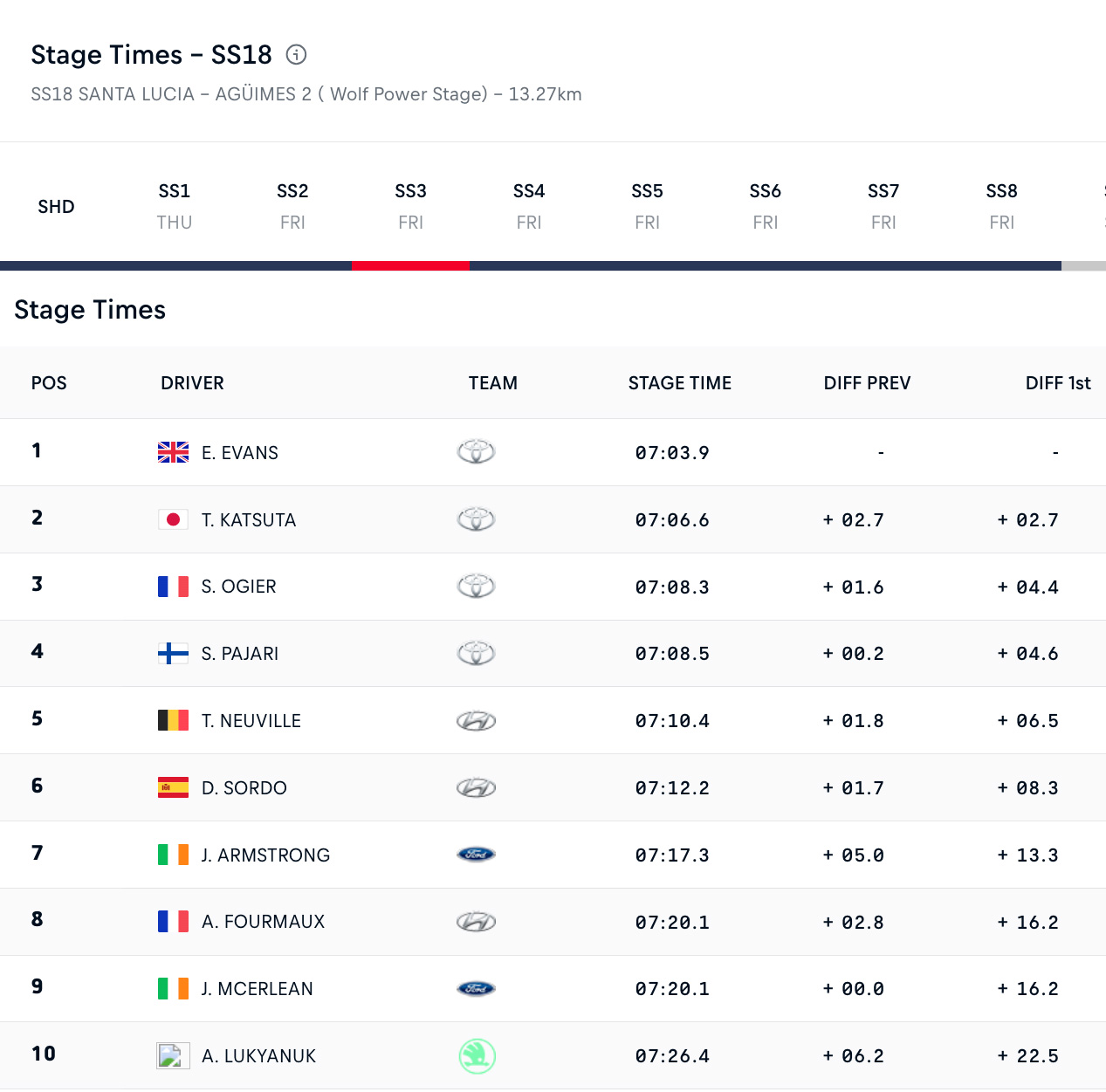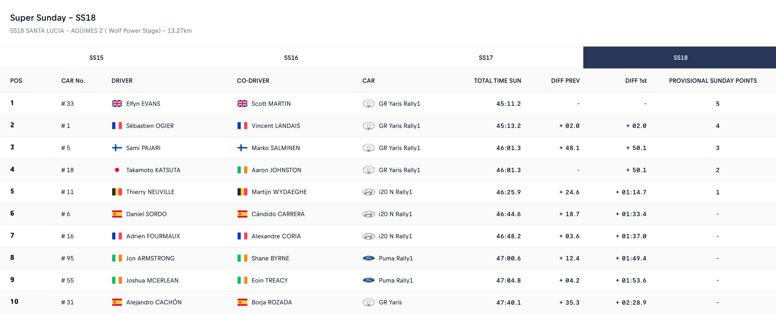 Ο Sordo, στην επιστροφή του στην αγωνιστική δράση από το Ράλλυ Ακρόπολις του 2024 και μάλιστα σε πάτρια εδάφη, είχε εντυπωσιάσει με το ρυθμό του την Παρασκευή, αλλά κατέληξε πίσω από τους team-mate του (που διεξάγουν ολόκληρη τη σεζόν), έως το τέλος του αγώνα.