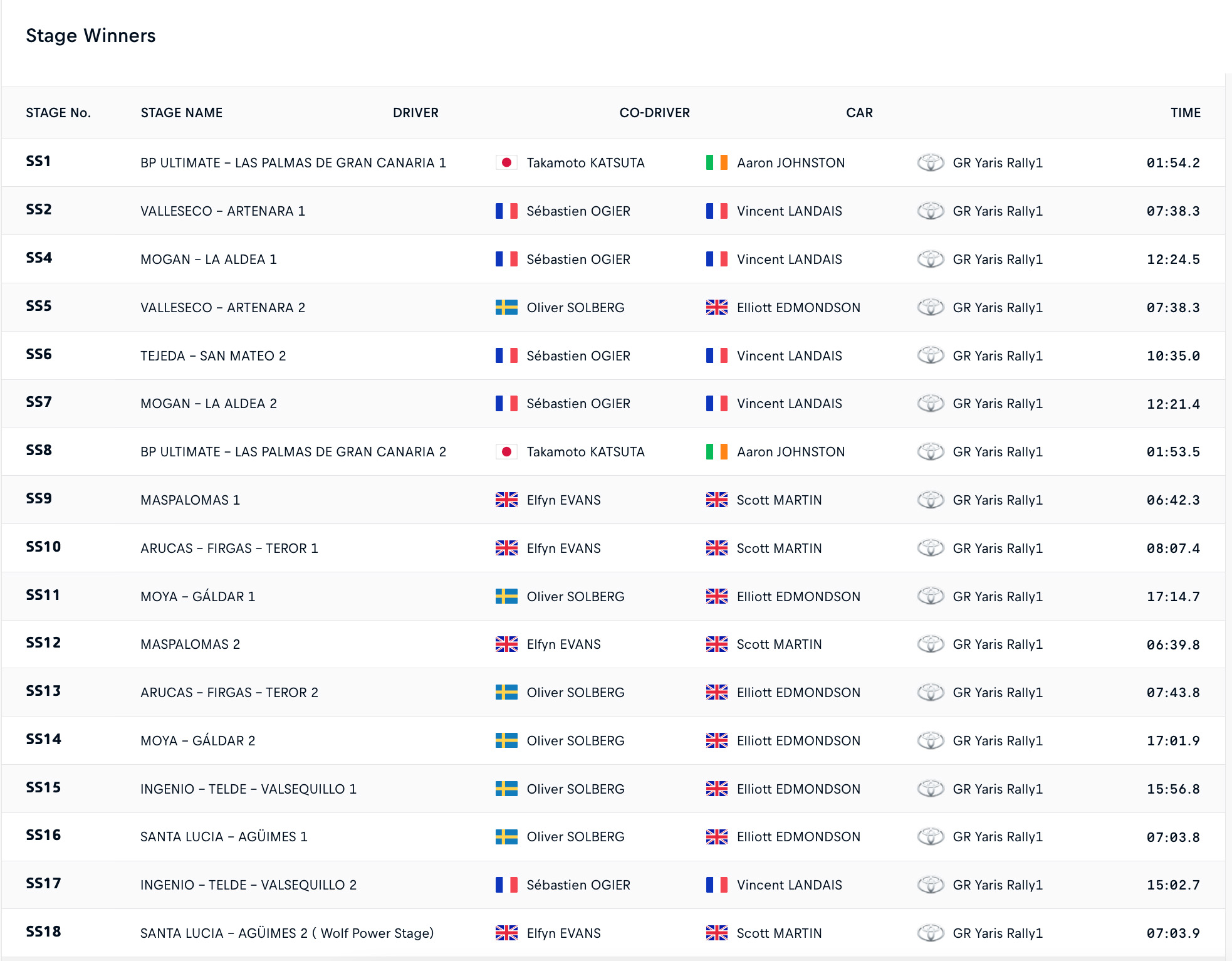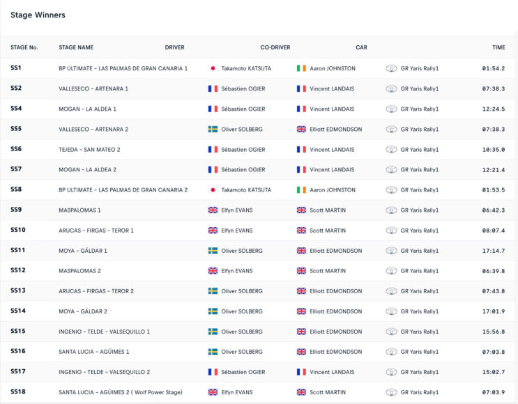 O 9 φορές Παγκόσμιος Πρωταθλητής του WRC, Sebastien Ogier, κατέκτησε με τον συνοδηγό του, Vincent Landais, την πρώτη τους φετινή νίκη, επικρατώντας στο Ράλλυ Κανάριων Νήσων. Ο Γάλλος έγινε ο 4ος διαφορετικός νικητής της Toyota Gazoo Racing σε πέντε αγώνες, έπειτα από μονομαχία που έδωσε με τον team-mate του, Oliver Solberg καθ’ όλη σχεδόν τη διάρκεια του αγώνα.