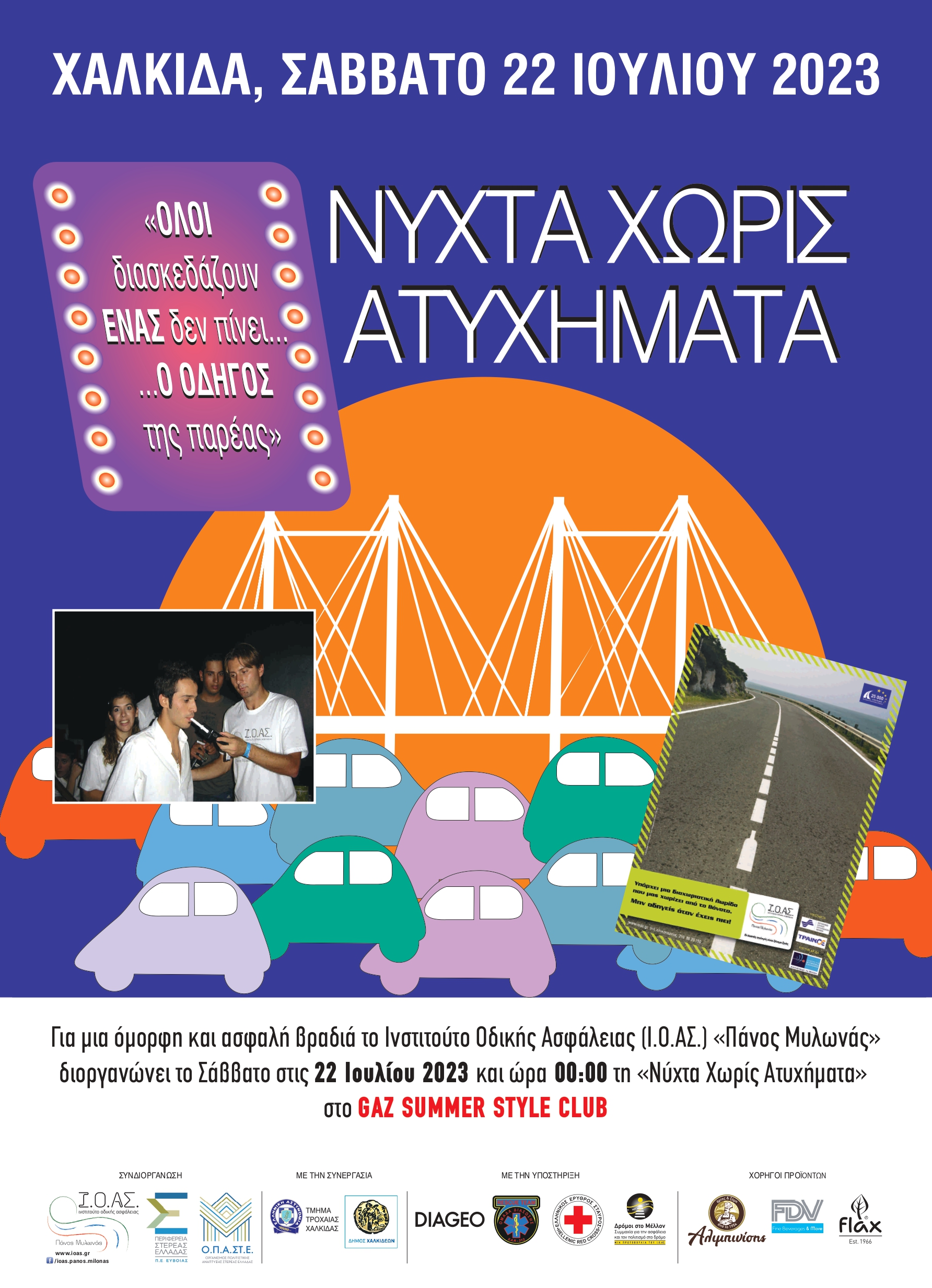 Συντελεστές για άλλη μία επιτυχημένη εκδήλωση “Νύχτα Χωρίς Ατυχήματα” στη Χαλκίδα αυτό το καλοκαίρι ήταν το GAZ Summer Style Club, η Περιφέρεια Στερεάς Ελλάδας, η Τροχαία Χαλκίδας και ο Δήμος Χαλκιδέων, η Diageo Hellas A.E. και η Συμμαχία για την Ασφάλεια & τον Πολιτισμό στο δρόμο «Δρόμοι στο Μέλλον». Μαζί μας το Περιφερειακό Τμήμα Χαλκίδας «Ελληνικός Ερυθρός Σταυρός» και η Ομάδα Διάσωσης Εύβοιας S.A.R.-312 με τους εθελοντές μας.