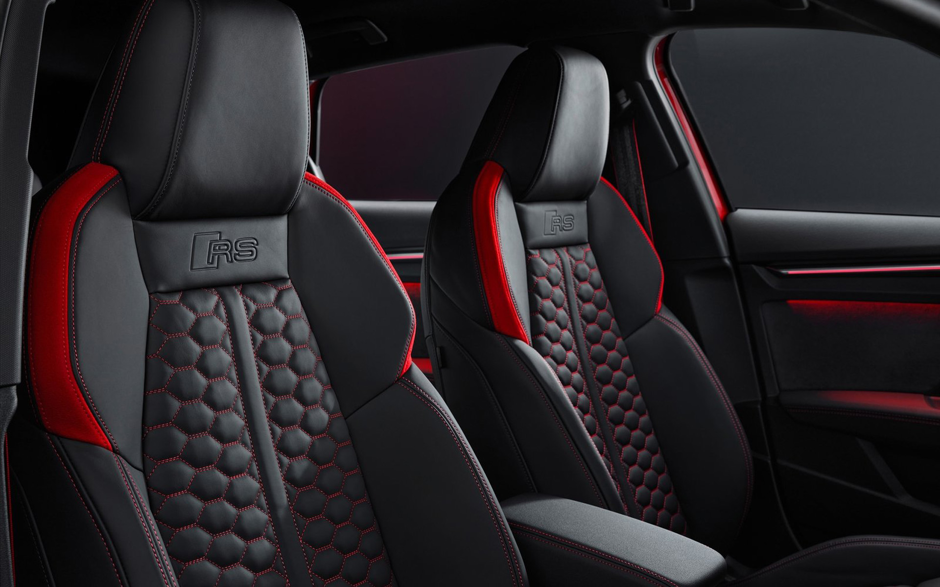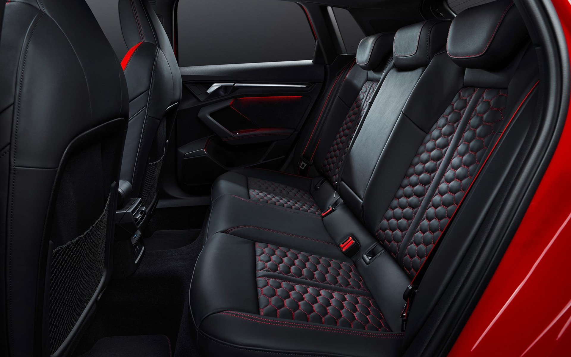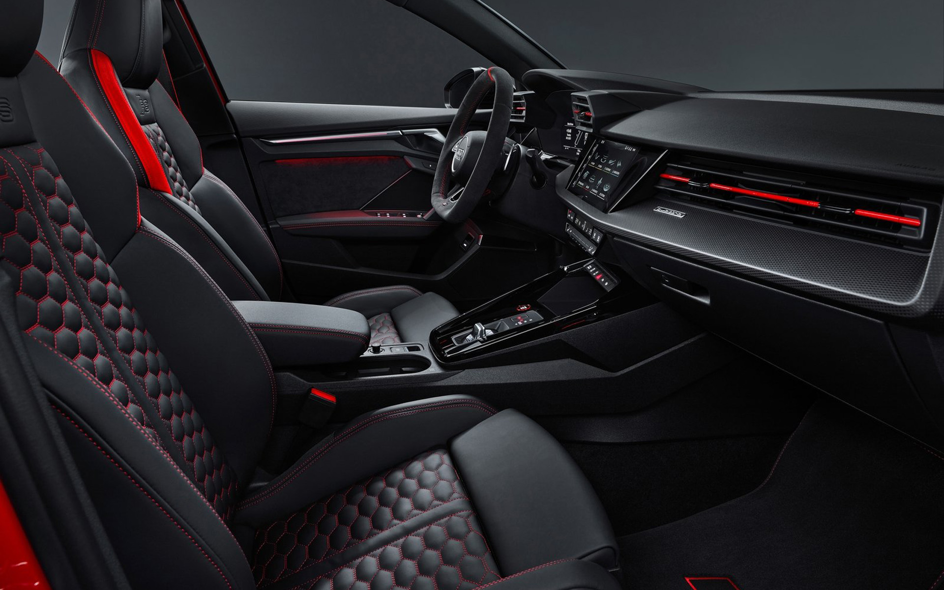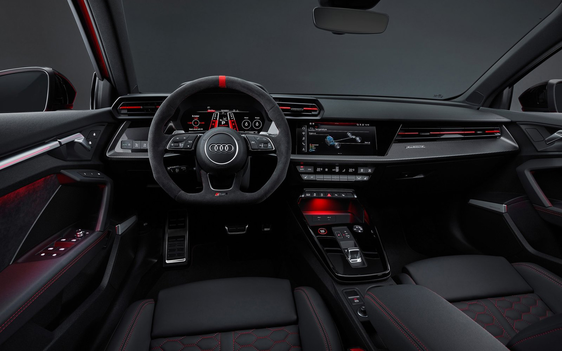 Στο εσωτερικό τα μπάκετ καθίσματα δίνουν το σπορ τόνο που η Audi επιθυμεί για το RS3, με τις κόκκινες λεπτομέρειες να τον ενισχύουν. Η ψηφιακή οθόνη 12,3 ιντσών του πίνακα οργάνων ανήκει στο βασικό εξοπλισμό του μοντέλου.