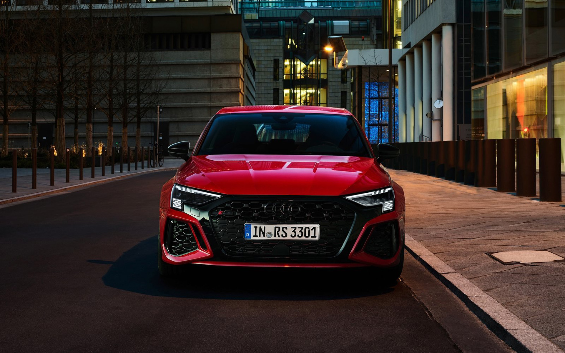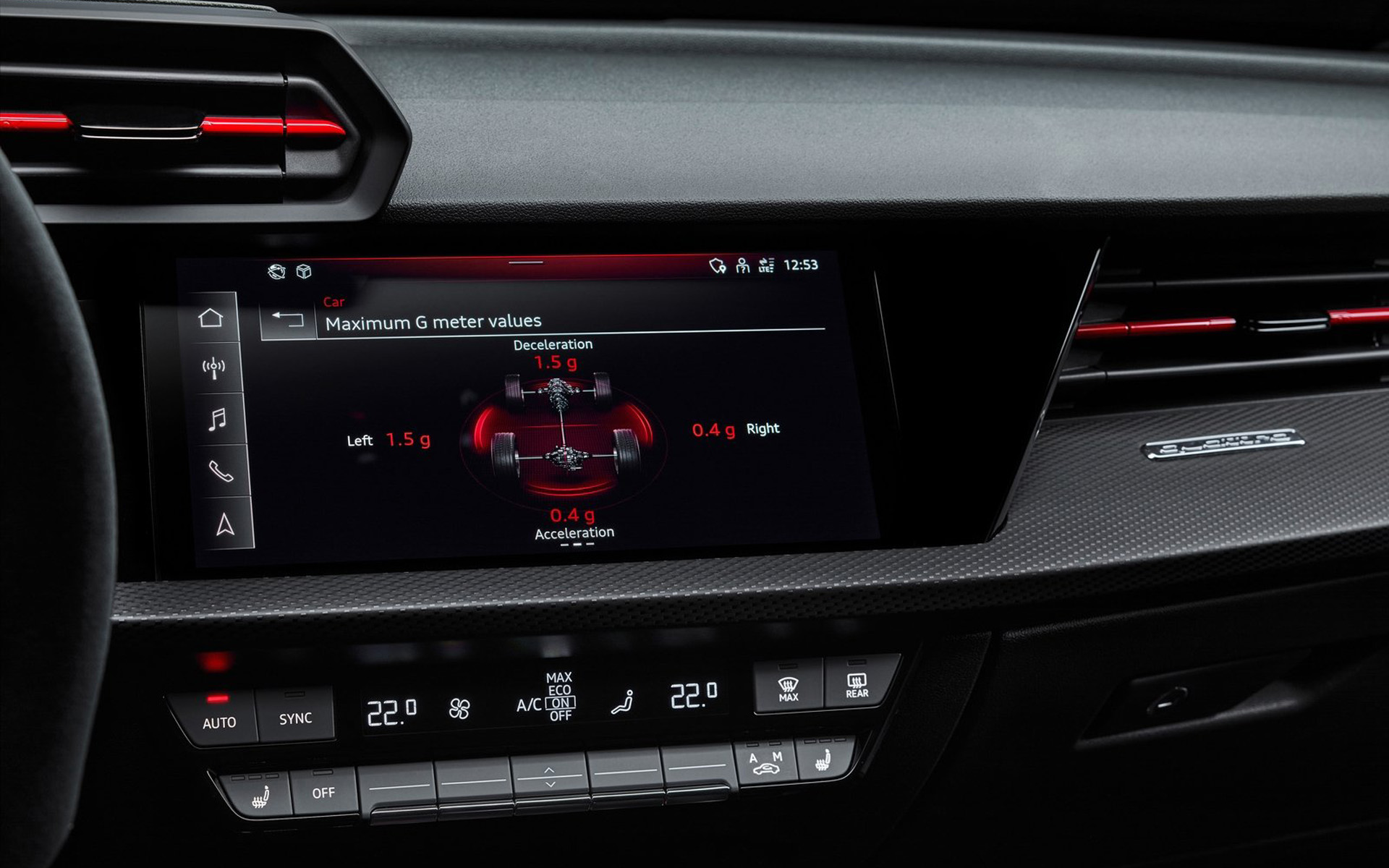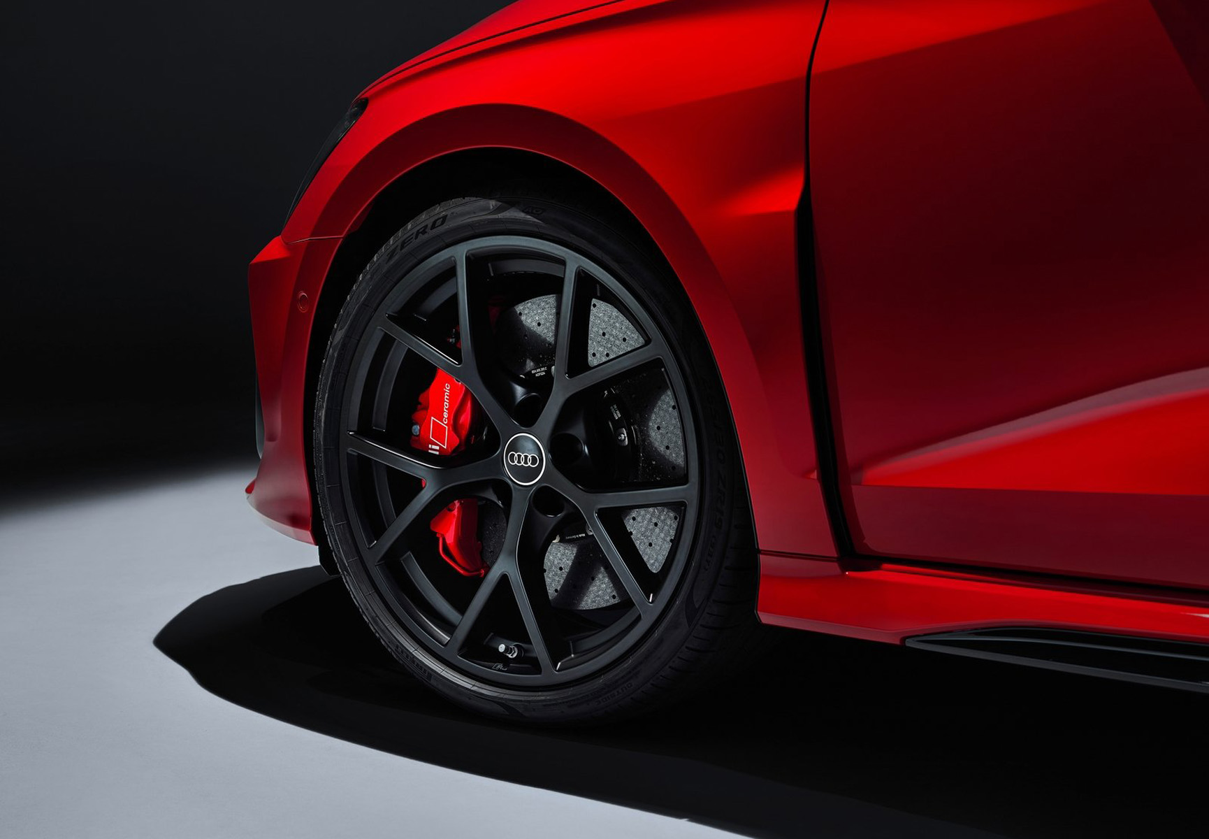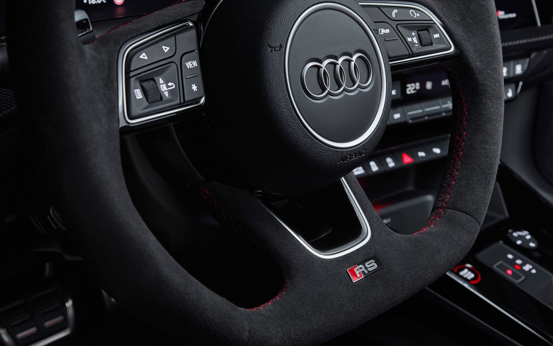 Στο εσωτερικό τα μπάκετ καθίσματα δίνουν το σπορ τόνο που η Audi επιθυμεί για το RS3, με τις κόκκινες λεπτομέρειες να τον ενισχύουν. Η ψηφιακή οθόνη 12,3 ιντσών του πίνακα οργάνων ανήκει στο βασικό εξοπλισμό του μοντέλου.