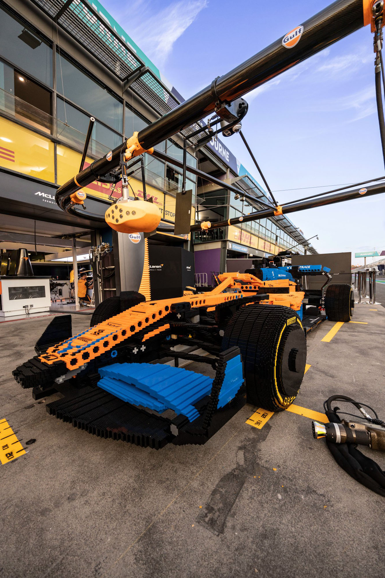 Tο πορτοκαλί μονοθέσιο είναι αποτελείται από 288.315 κομμάτια Lego και χρειάστηκαν 1.893 ώρες εργασίας για να συναρμολογηθεί και το cockpit είναι αρκετά μεγάλο για να φιλοξενήσει έναν ενήλικα, όπως διαπίστωσαν οι Daniel Ricciardo και Lando Norris, οδηγοί της McLaren στη Formula 1.