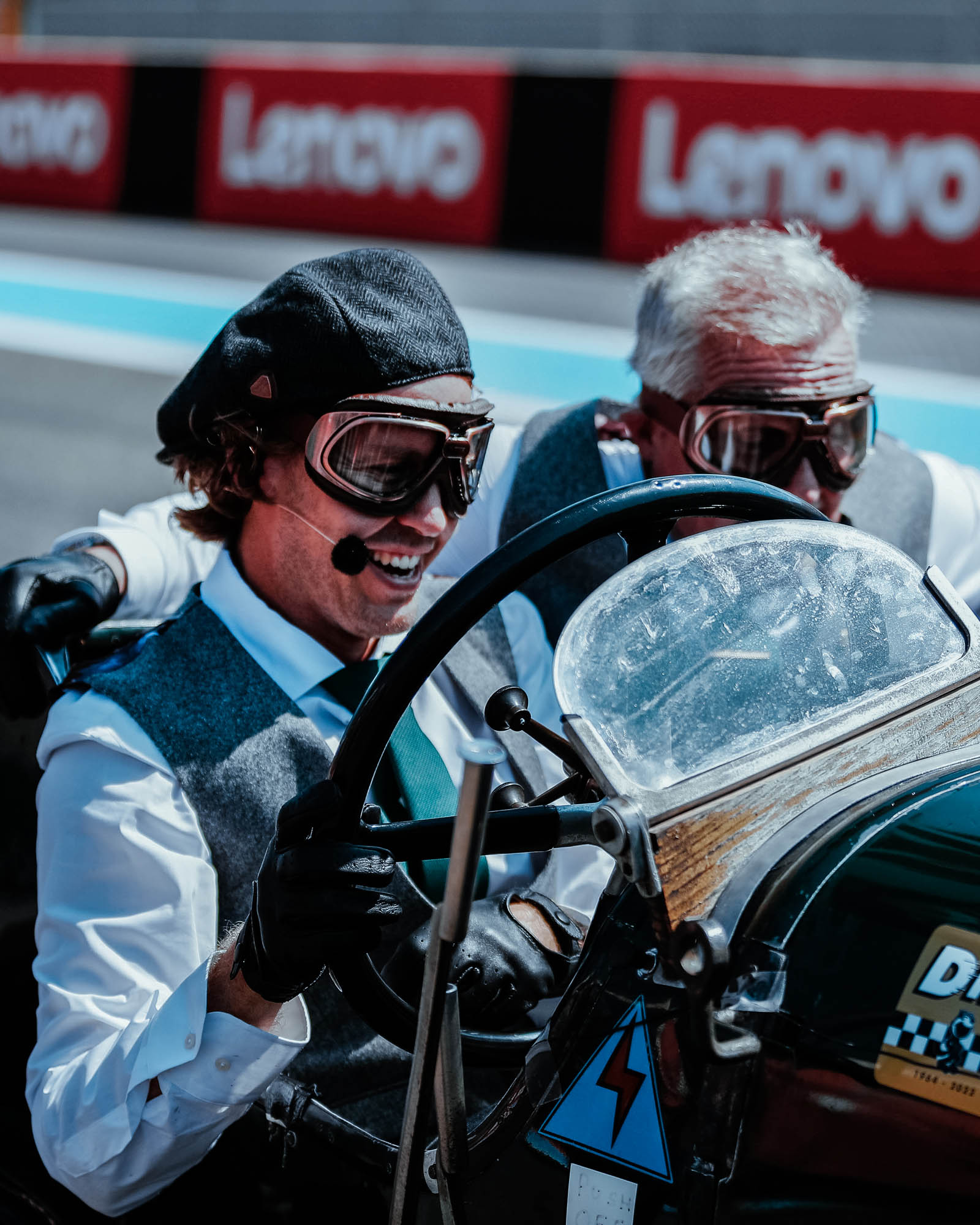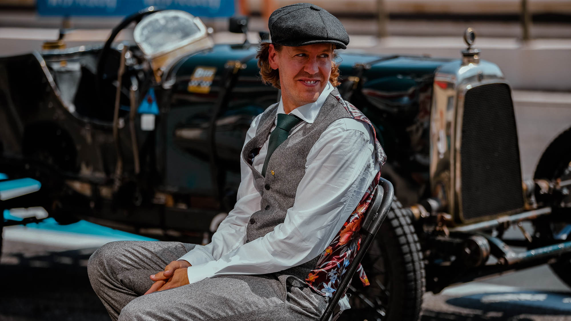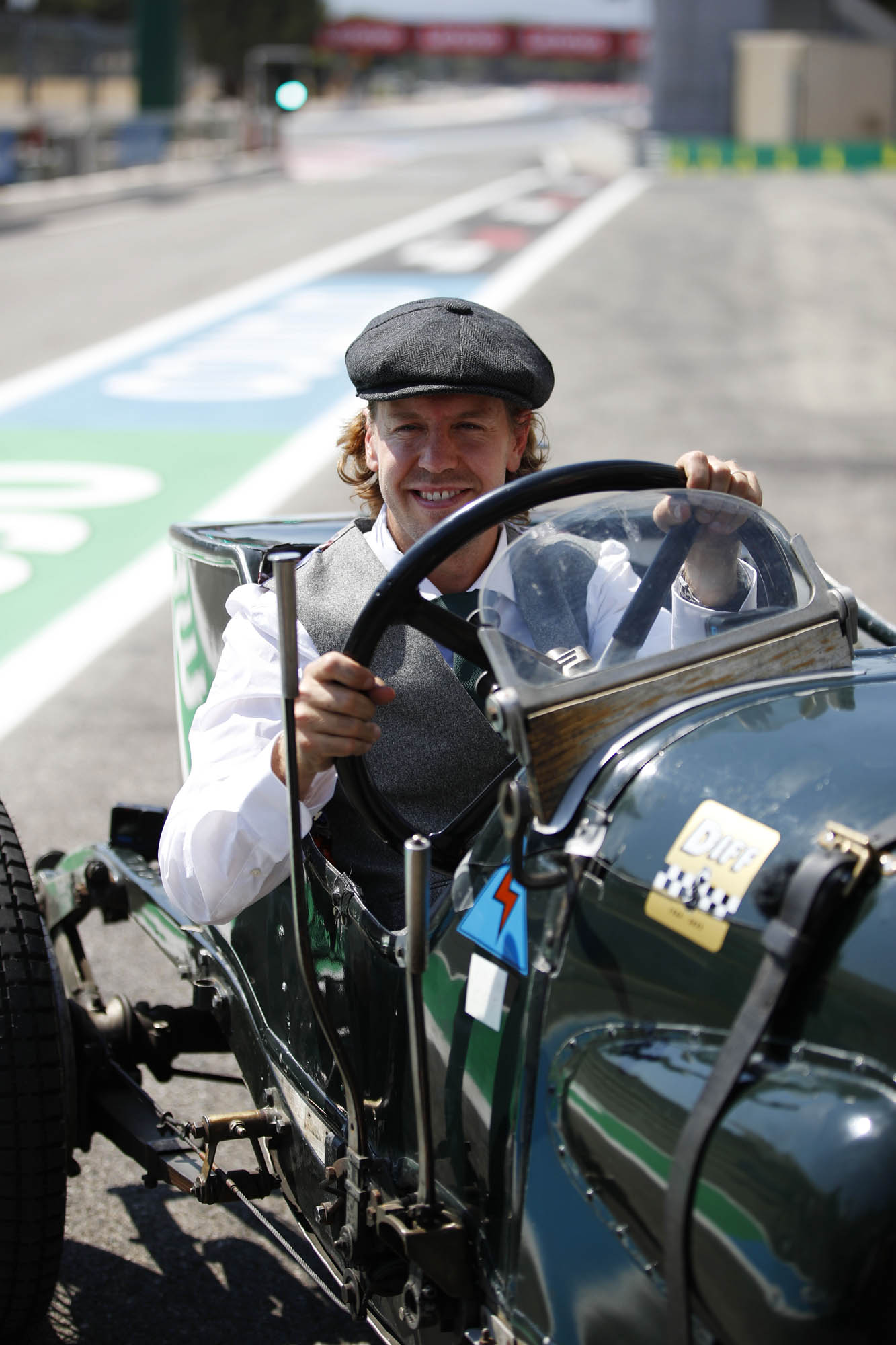 Με ένδυση της δεκαετίας του 1920 (γιλέκο, γραβάτα, μπερέ και γυαλιά αεροπόρου της εποχής) , ο Vettel δεν μπορούσε να κρύψει το χαμόγελο από τα χείλη του. Για συνοδηγό είχε τον Βρετανό παλαίμαχο πιλότο της F1 (νικητή τριών Grand Prix τη δεκαετία του 1990), Johnny Herbert.