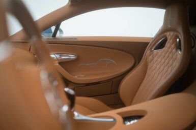 Στο εσωτερικό, υπάρχει δερμάτινη ταπετσαρία «Guacho» και περαιτέρω σιλουέτες της Type 57. Τα πάνελ των θυρών είναι ραμμένα σε «lightning blue» και στην κεντρική κονσόλα υπάρχει ένα προσαρμοσμένο ένθετο με το «57 One of One». Ένα μοτίβο ελέφαντα που ισορροπεί στα πίσω του πόδια είναι κεντημένο στα προσκέφαλα, ένα χαρακτηριστικό που προορίζεται για τα πιο σπάνια αυτοκίνητα της Bugatti.