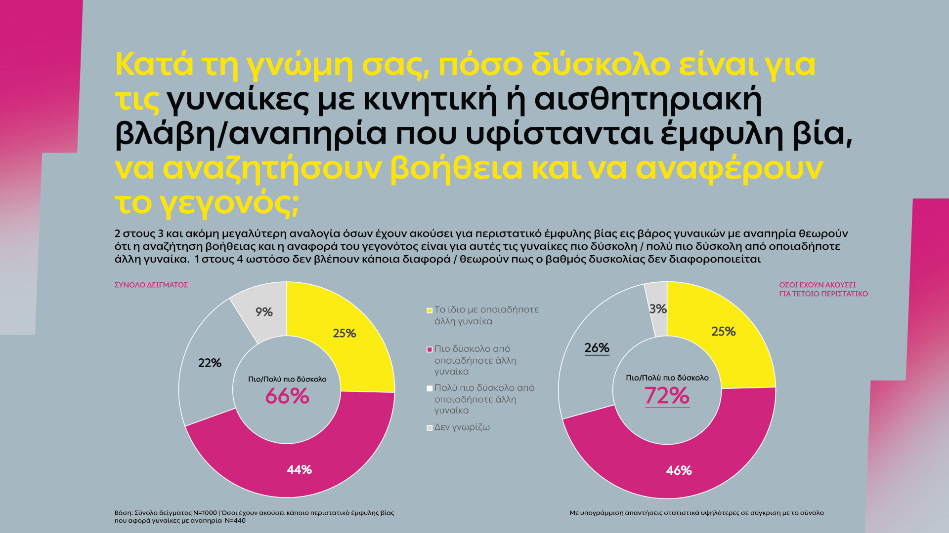 - 2 στα 3 άτομα (66%) συνειδητοποιούν ότι η αναζήτηση βοήθειας, όπως και η αναφορά και καταγγελία περιστατικού έμφυλης βίας είναι πιο δύσκολη για τις γυναίκες με αναπηρία