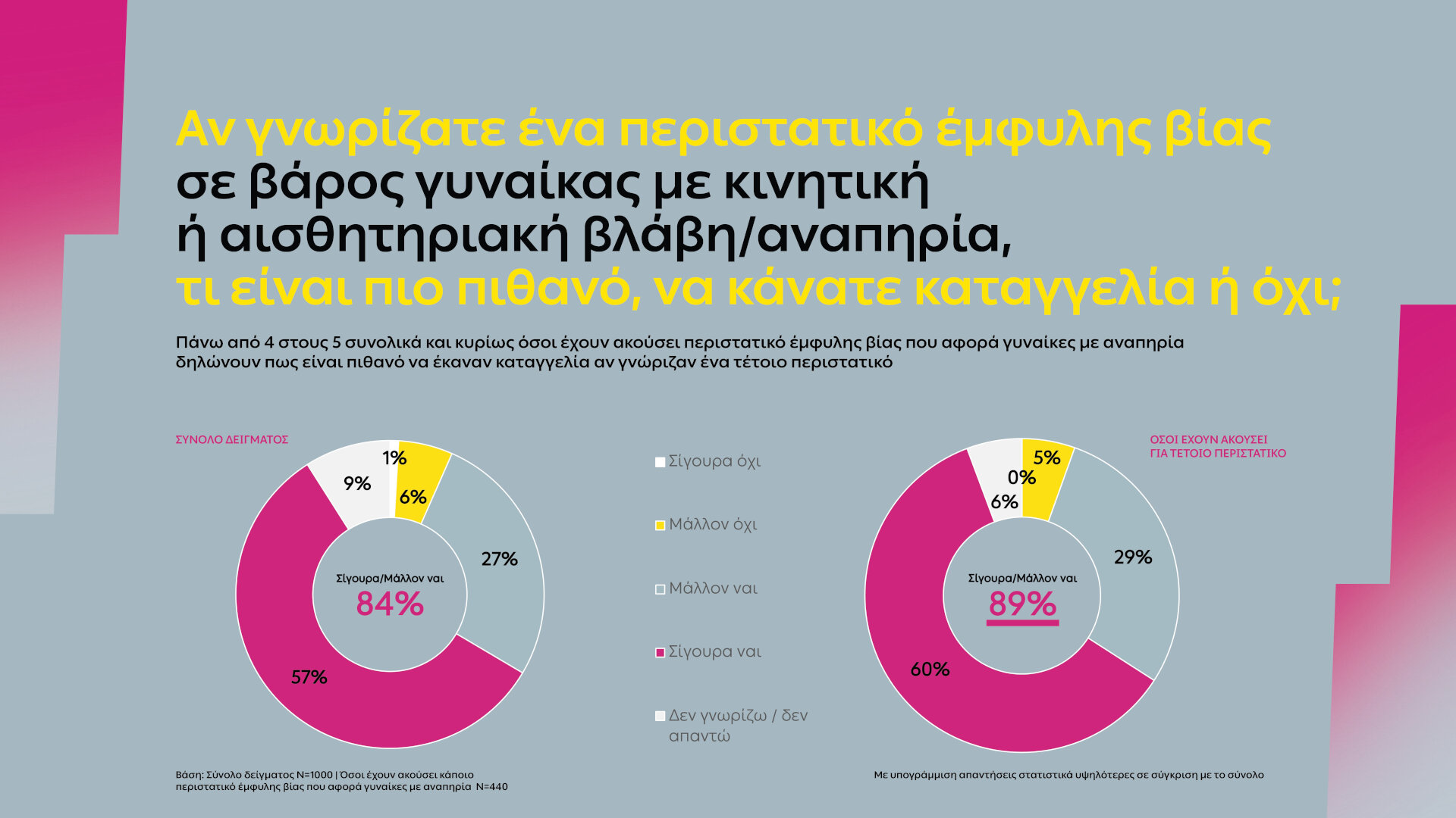 - Το 46% των ατόμων που ρωτήθηκαν, διστάζει να καταγγείλει περιστατικό βίας σε γυναίκες με αναπηρία λόγω πιθανής νομικής εμπλοκής, το 43% ανησυχεί για την μελλοντική τύχη του θύματος σε περίπτωση καταγγελίας, ενώ ένα ποσοστό 30% αναφέρει ότι δεν γνωρίζει τι πρέπει να κάνει σε μία αντίστοιχη περίπτωση.